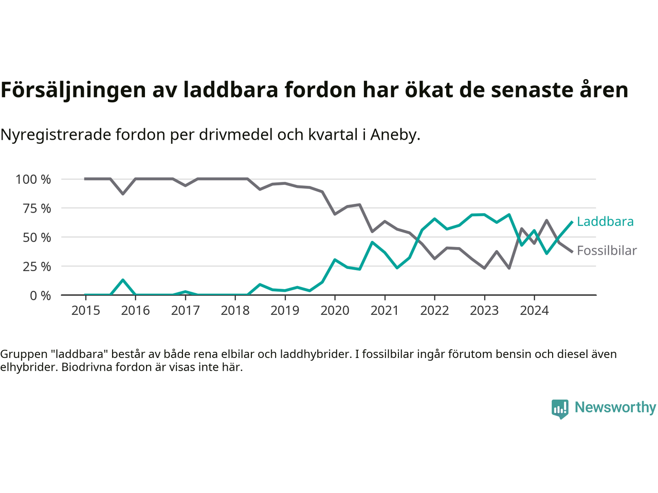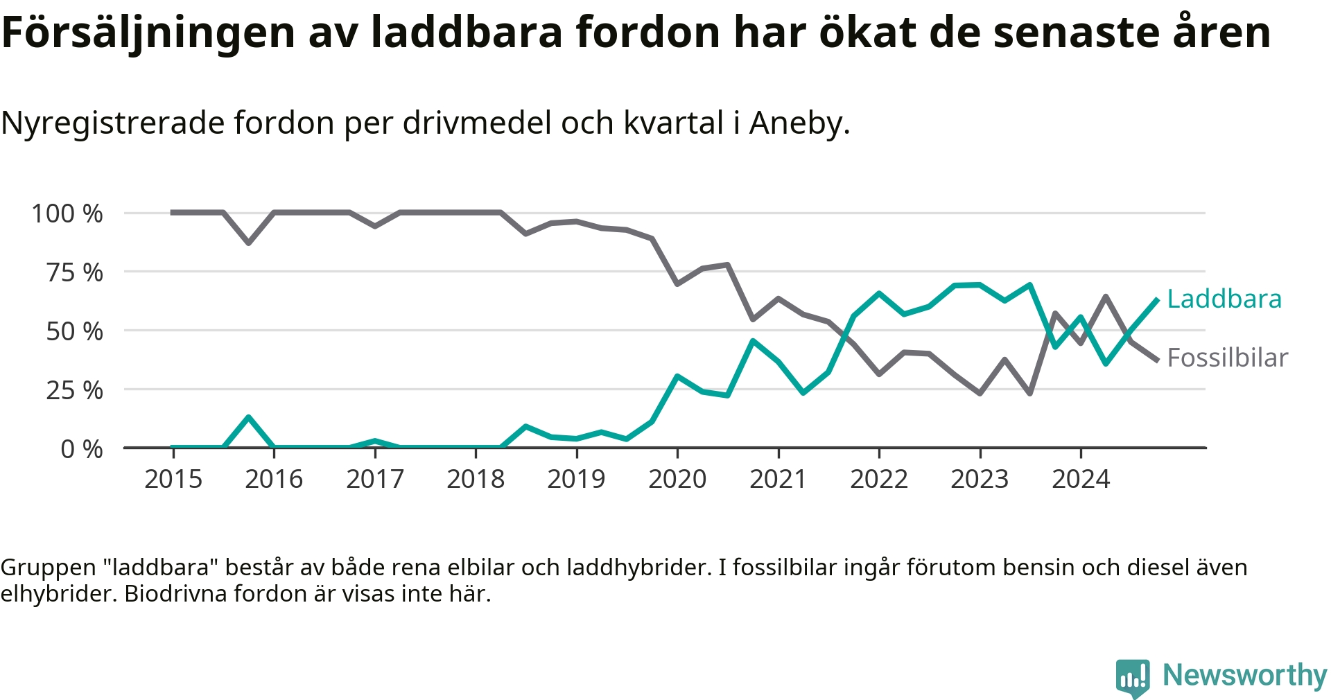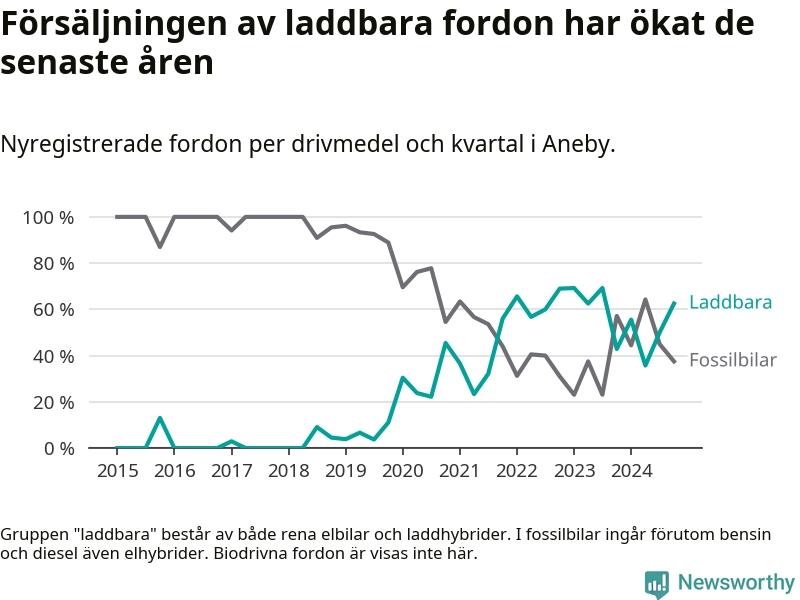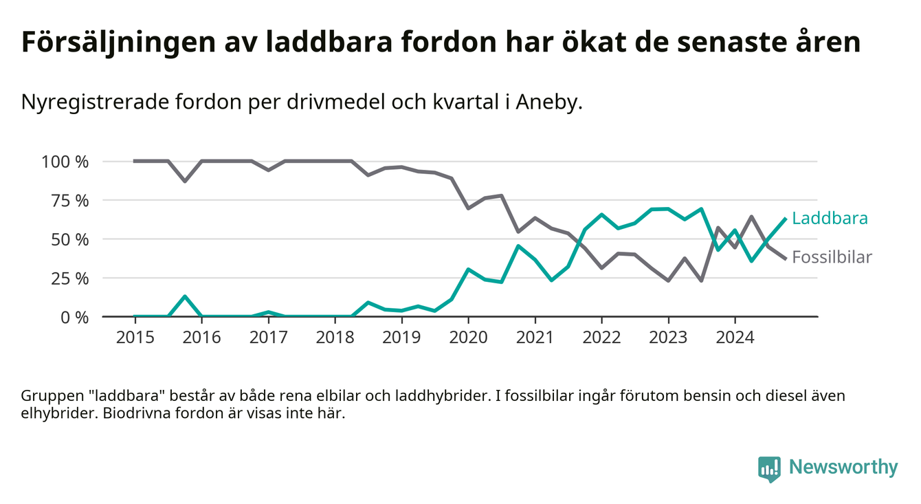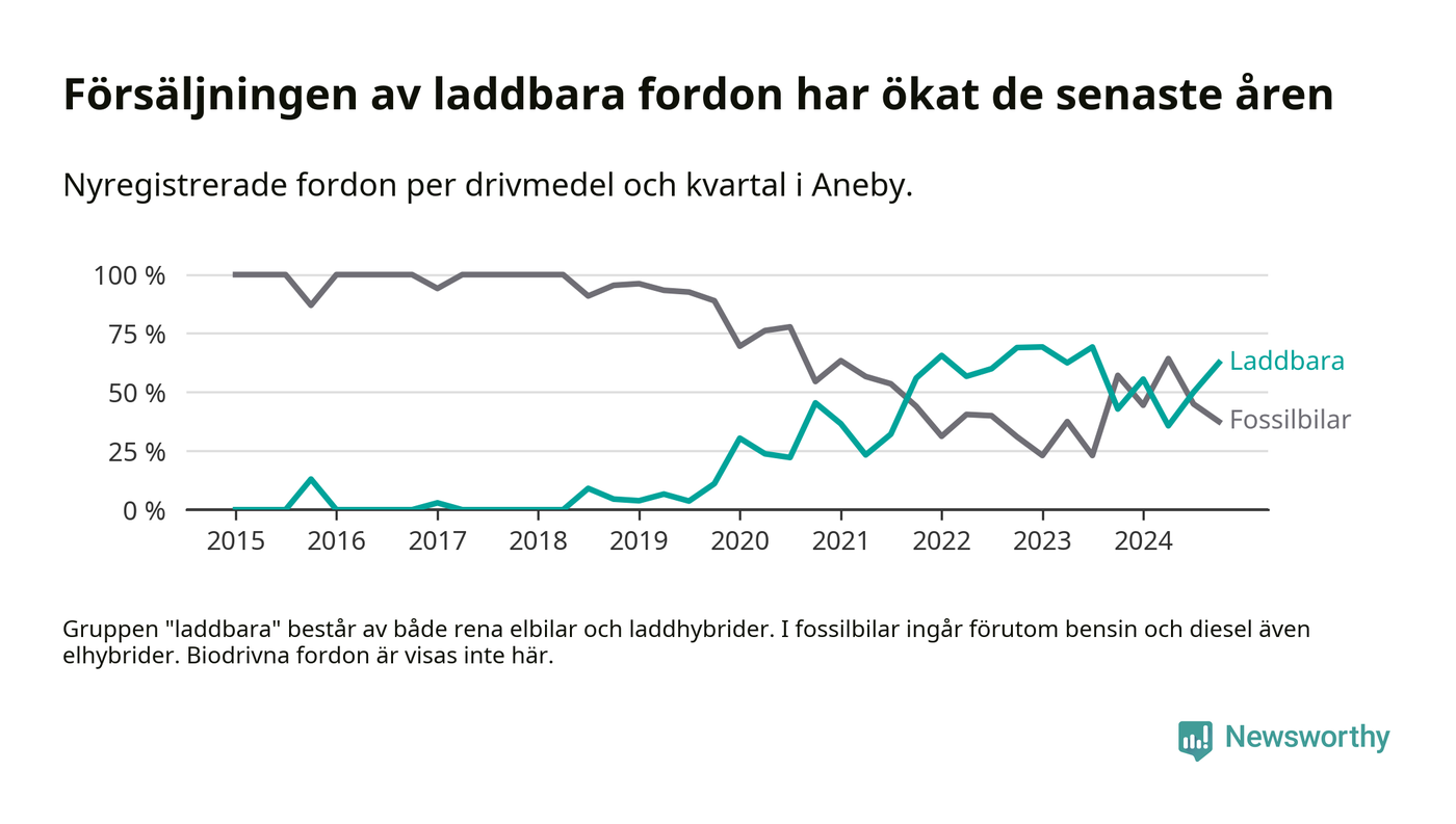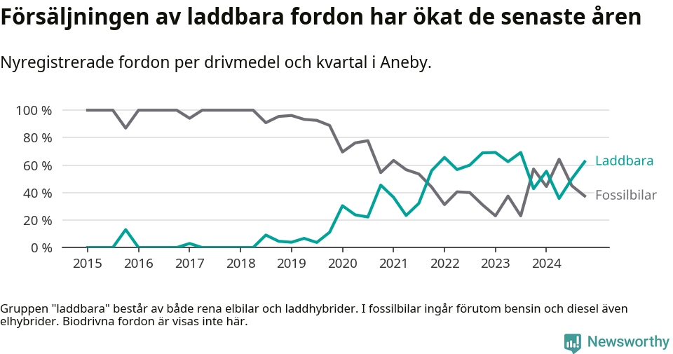 I Aneby ökade andelen laddbara bilar under fjärde kvartalet jämfört med kvartalet innan. Nyregistreringen peakade under första kvartalet 2023 då 69 procent av de nya bilarna var laddbara.