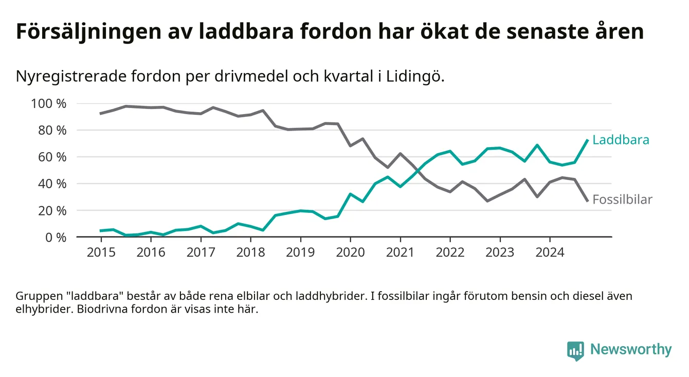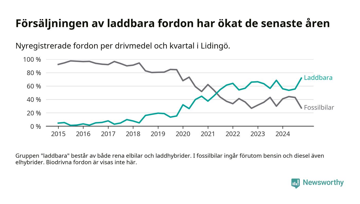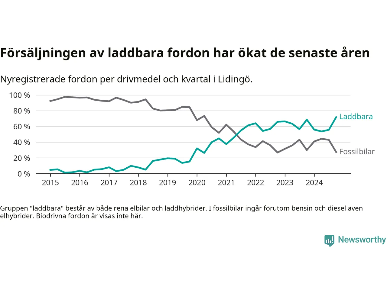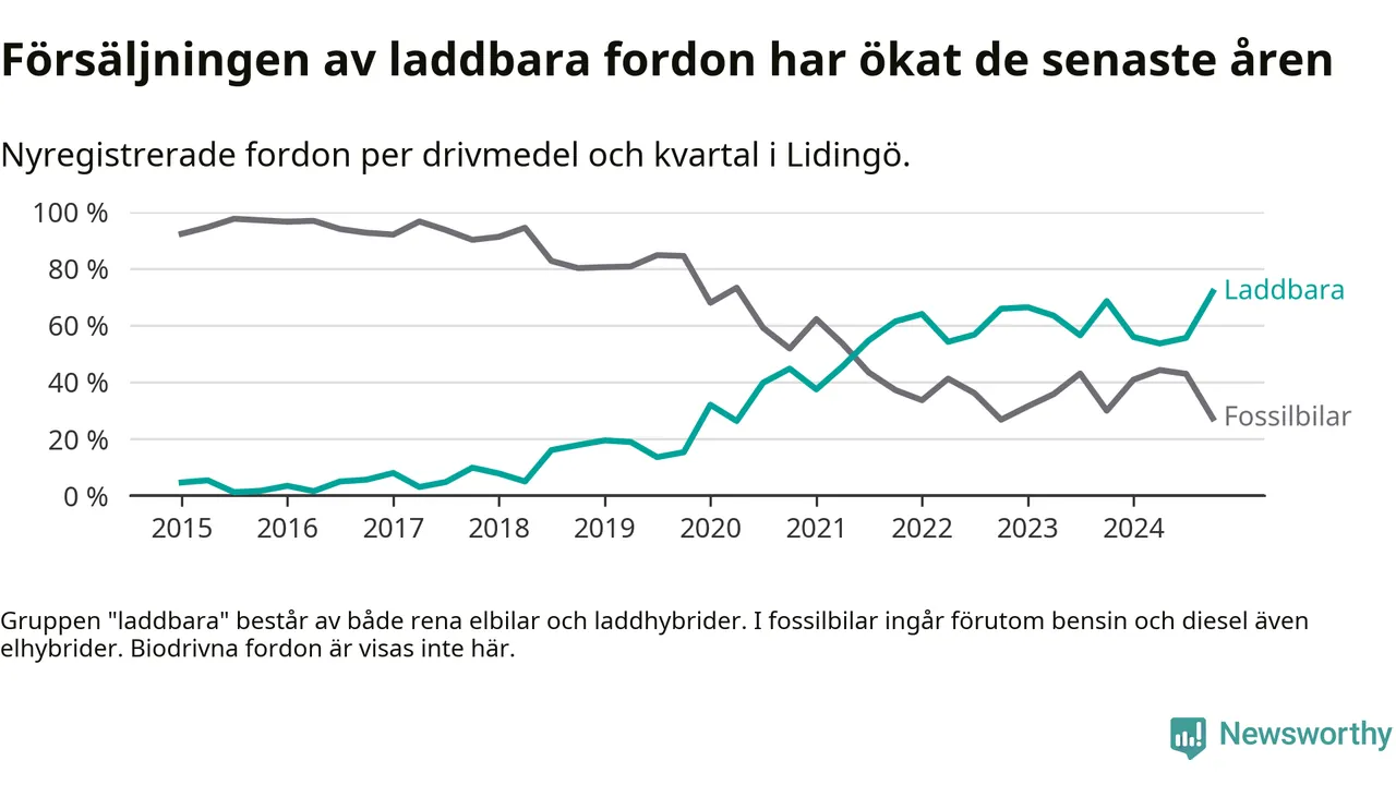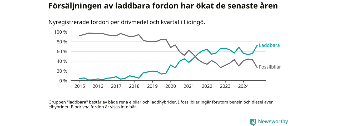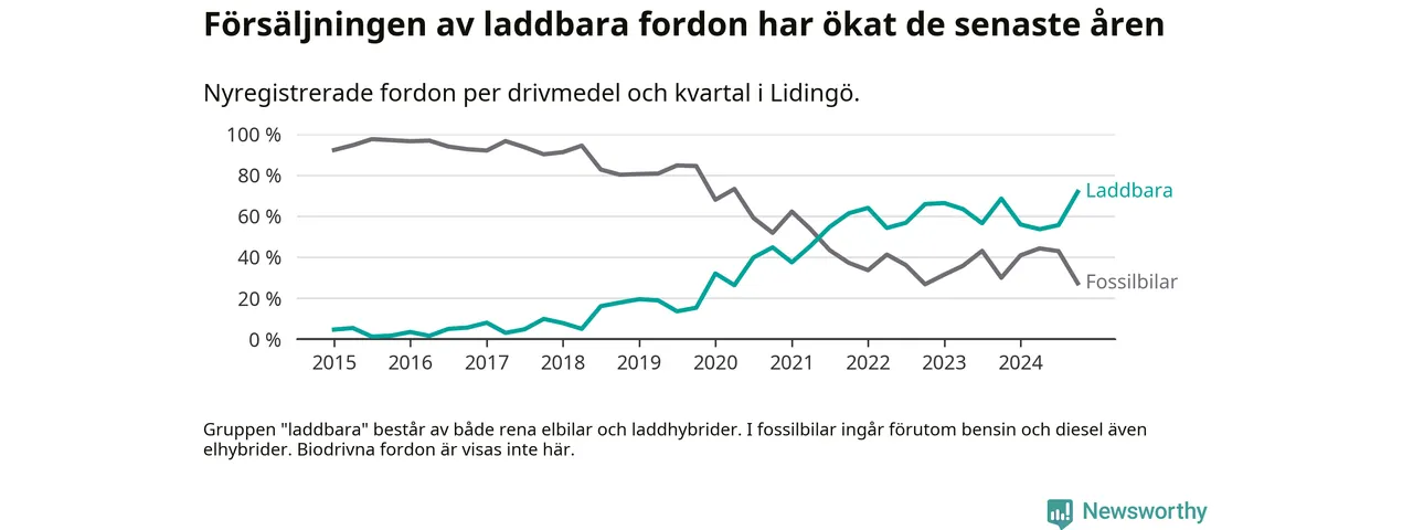 Under fjärde kvartalet 2024 var 72 procent av alla nyregistrerade personbilar på Lidingö laddbara (sammanlagt registrerades 323 nya bilar). Merparten av de laddbara bilarna var rena elbilar (49 procent av alla).