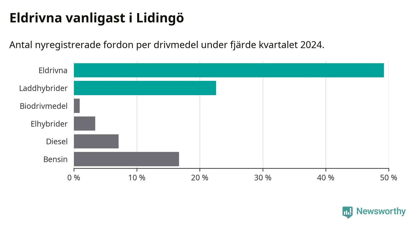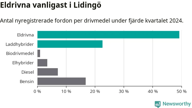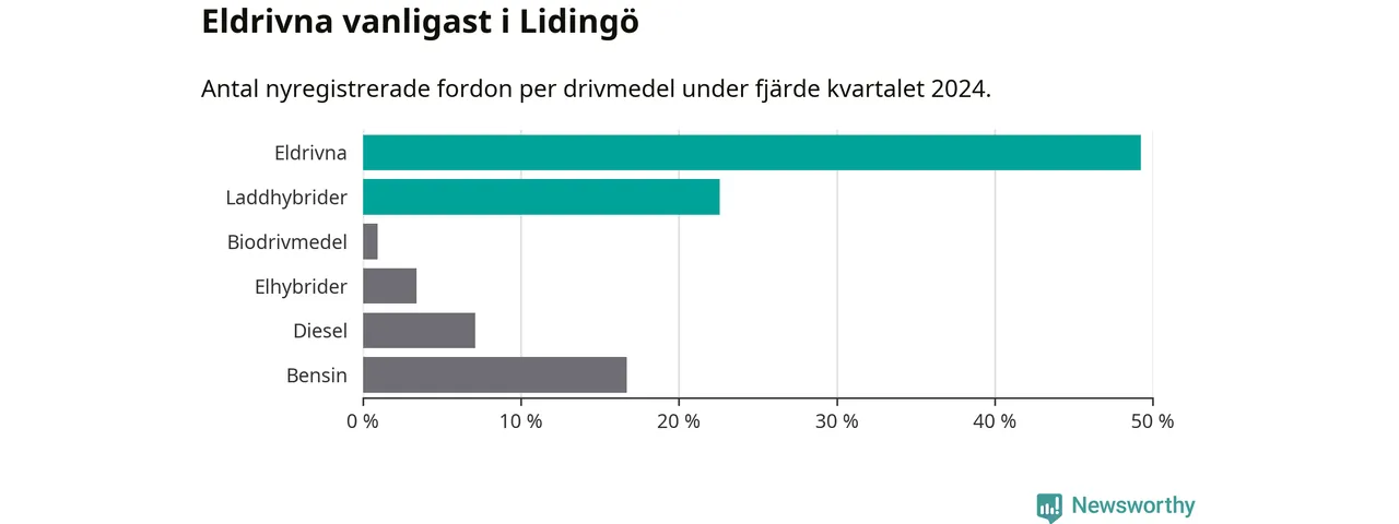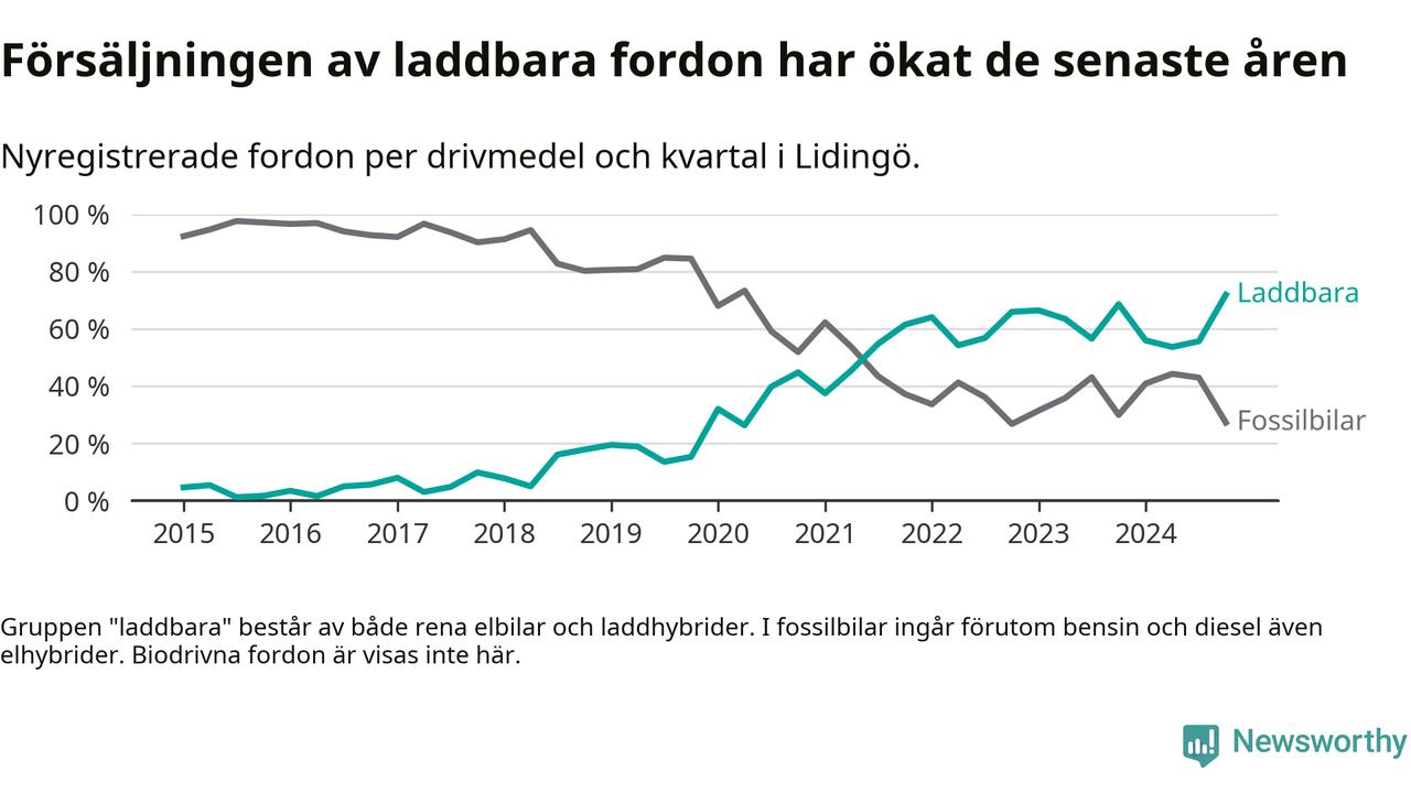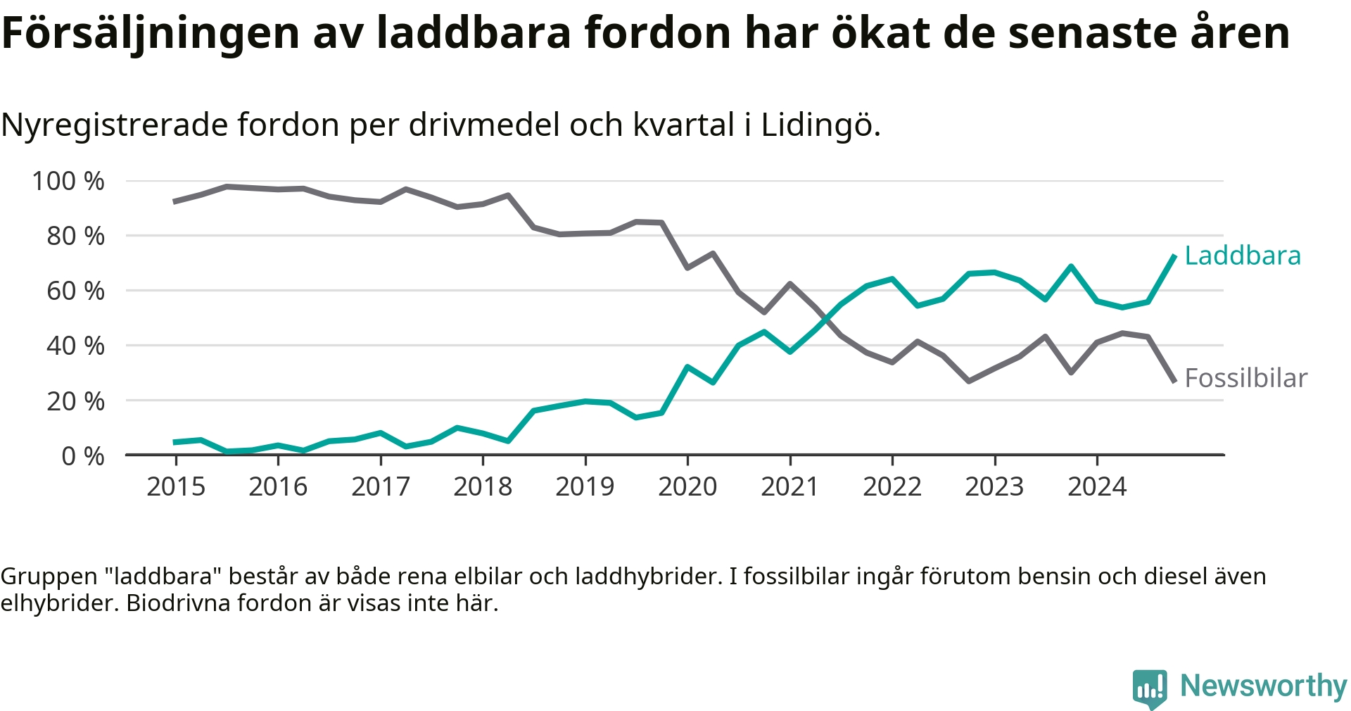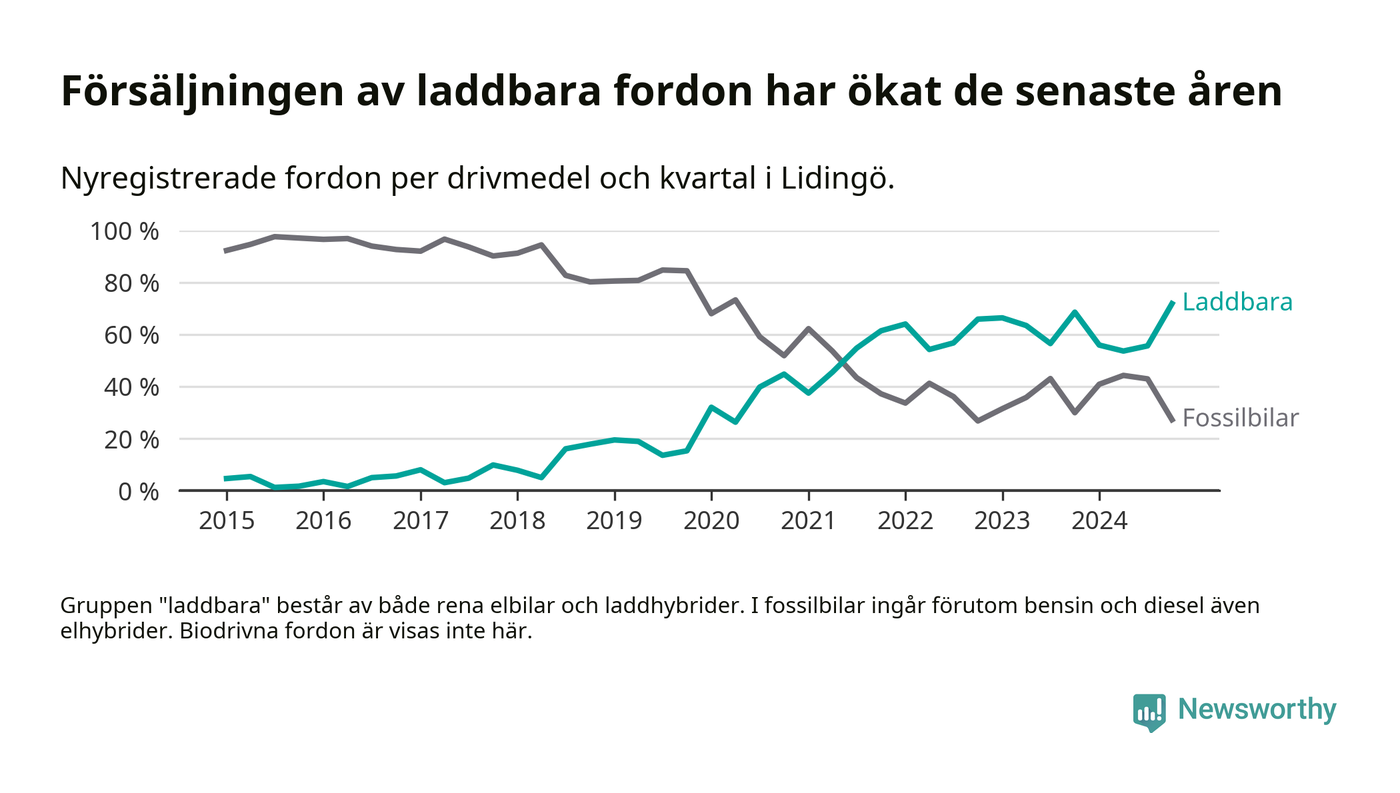 Under fjärde kvartalet 2024 var 72 procent av alla nyregistrerade personbilar på Lidingö laddbara (sammanlagt registrerades 323 nya bilar). Merparten av de laddbara bilarna var rena elbilar (49 procent av alla).