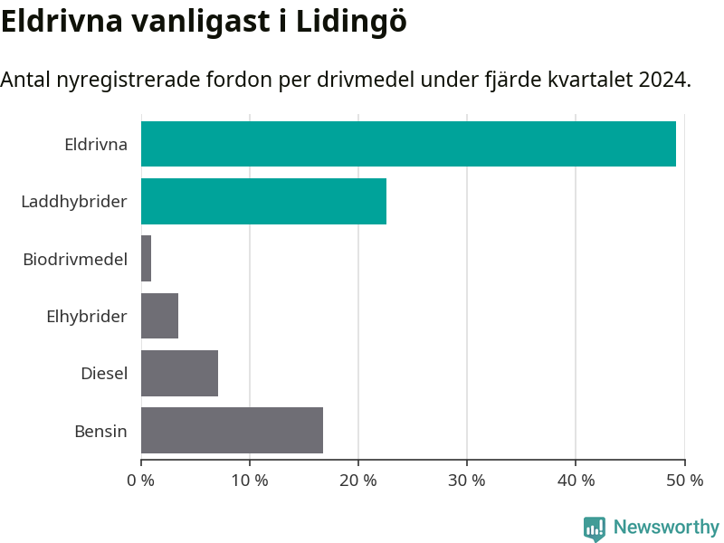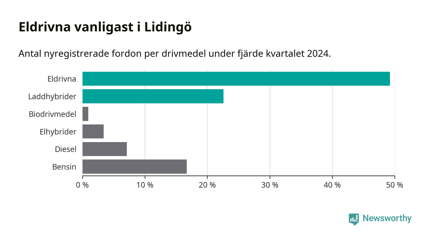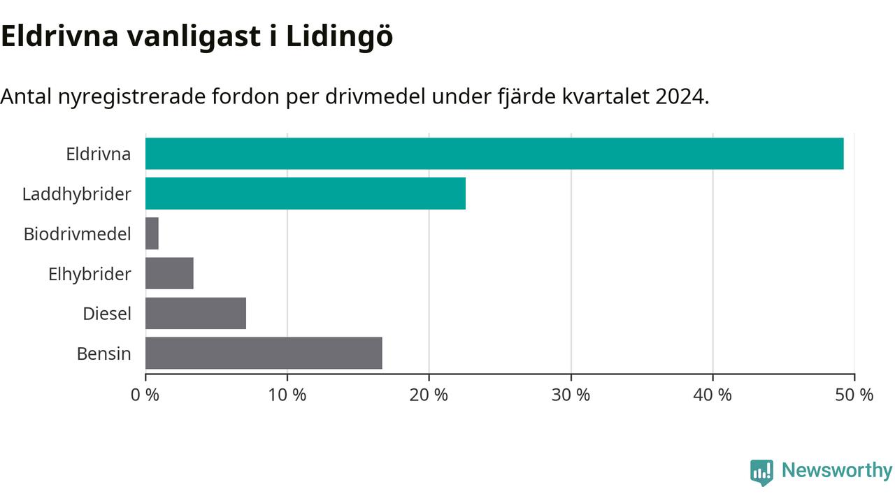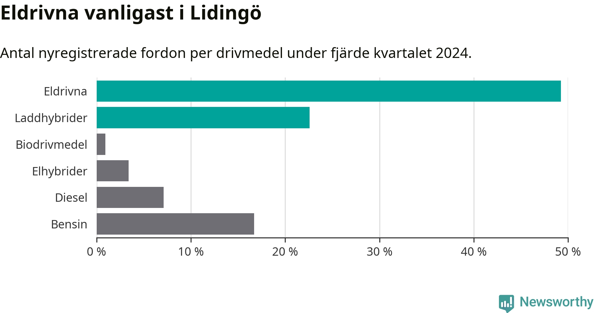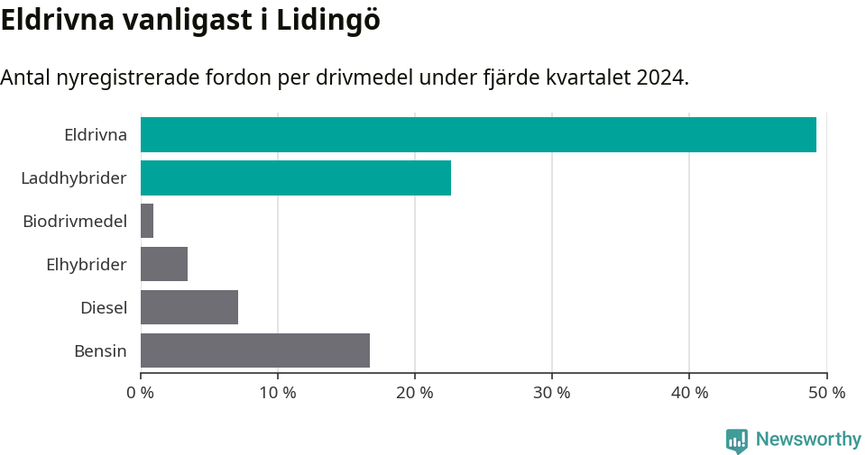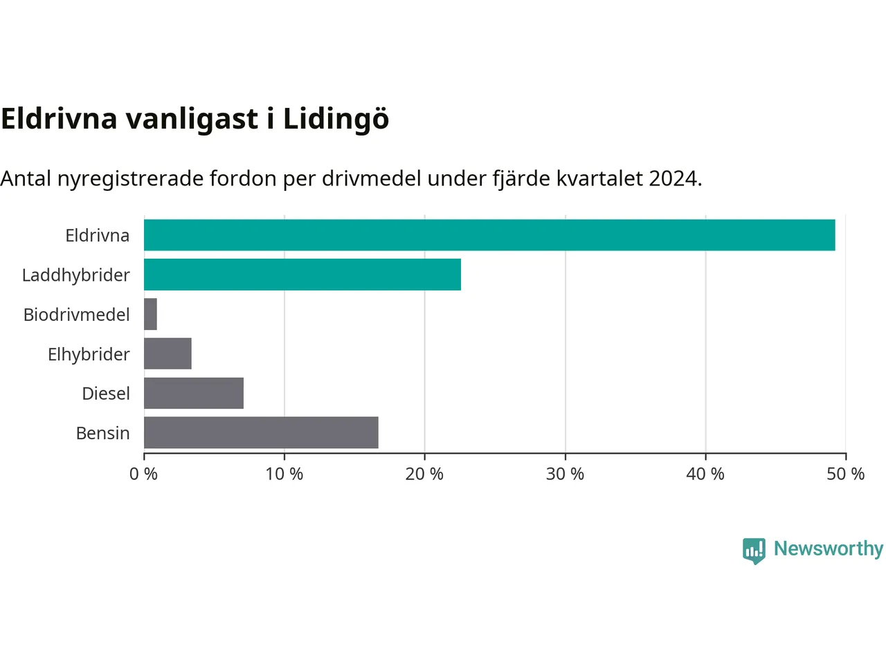 Under fjärde kvartalet 2024 var 72 procent av alla nyregistrerade personbilar på Lidingö laddbara (sammanlagt registrerades 323 nya bilar). Merparten av de laddbara bilarna var rena elbilar (49 procent av alla).
