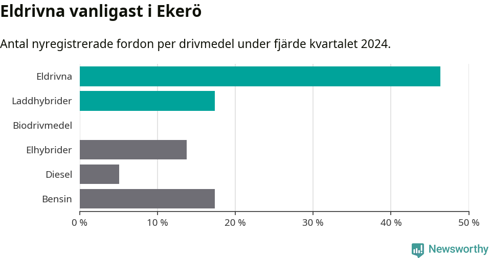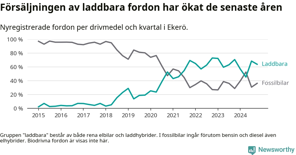 Under fjärde kvartalet 2024 var 64 procent av alla nyregistrerade personbilar i Ekerö laddbara (sammanlagt registrerades 138 nya bilar). Merparten av de laddbara bilarna var rena elbilar (46 procent av alla).