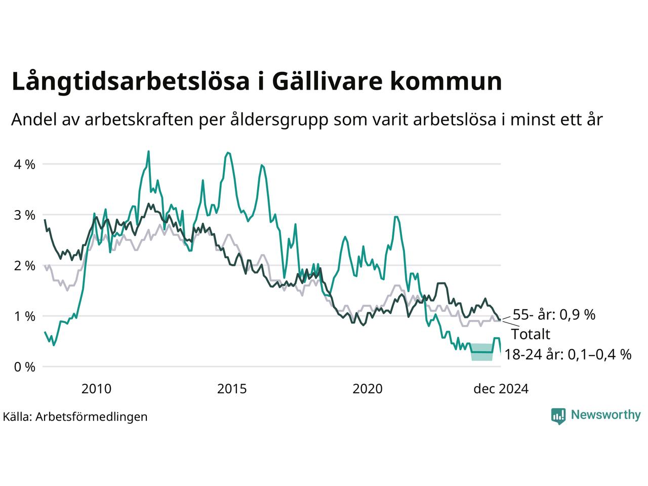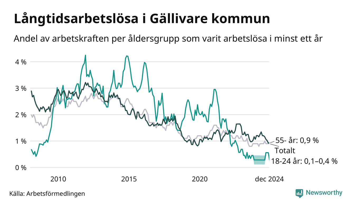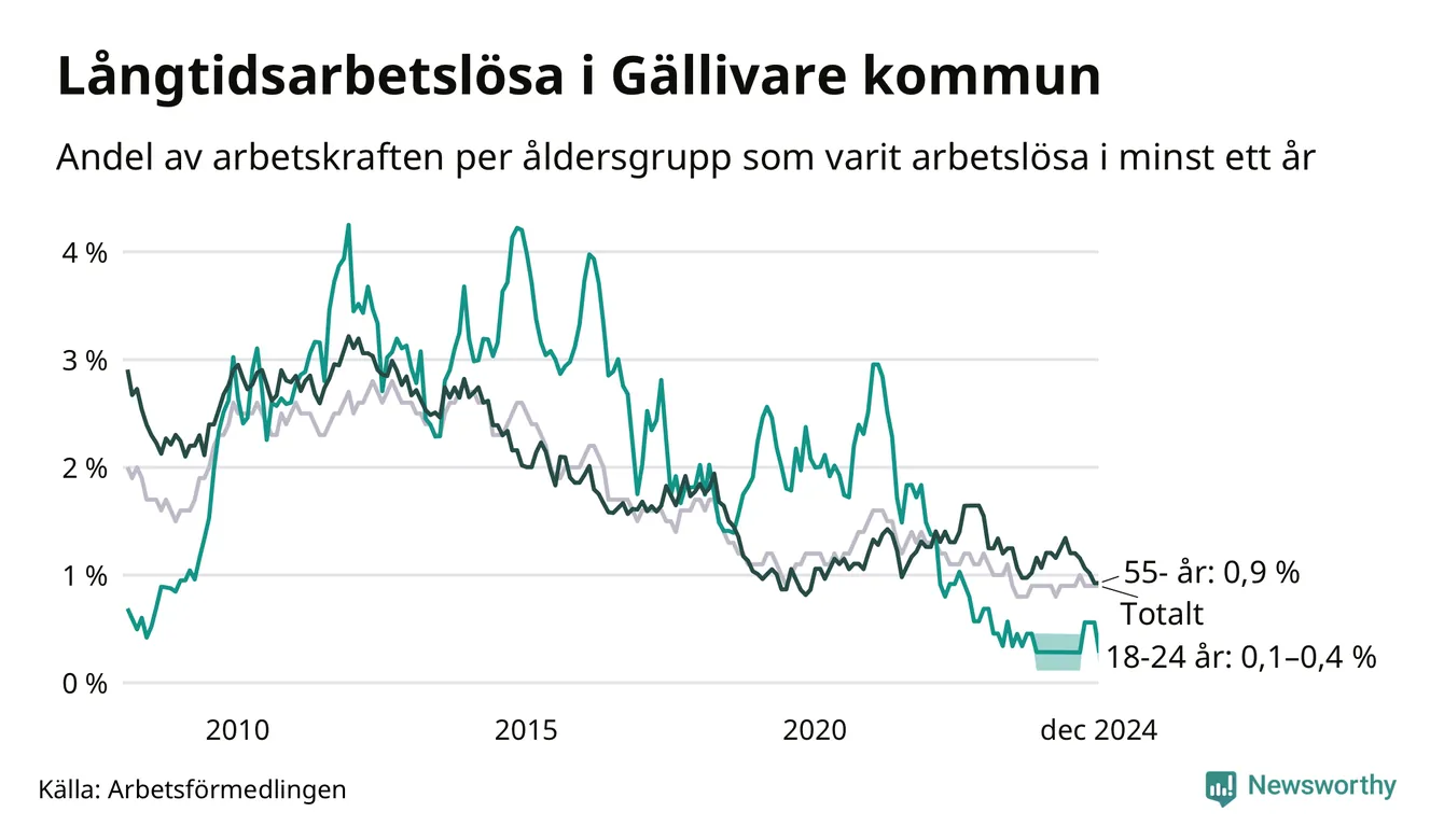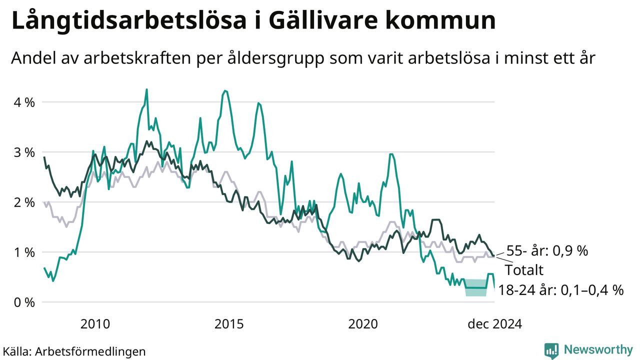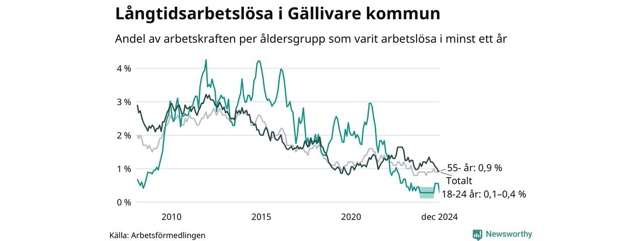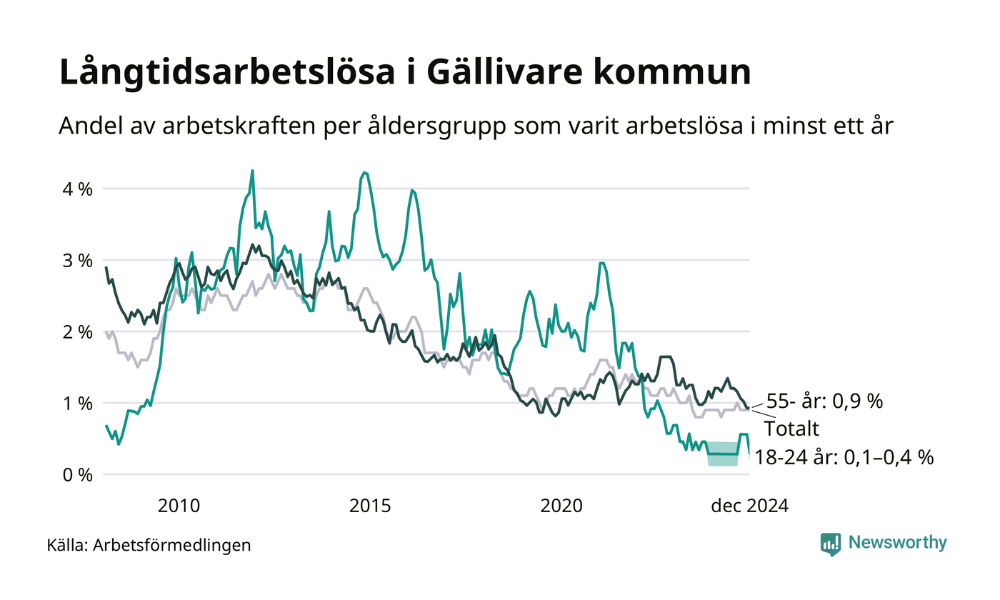 Av de 77 personerna som varit arbetslösa i mer än ett år i Gällivare kommun är 20 personer mellan 55 och 651 år och mellan en och fyra är mellan 18 och 24 år. För den äldre gruppen är andelen arbetslösa 0,9 procent medan den i den yngre gruppen är mellan 0,1 och 0,4 procent. Även i riket som helhet är långtidsarbetslösheten högre i gruppen äldre.