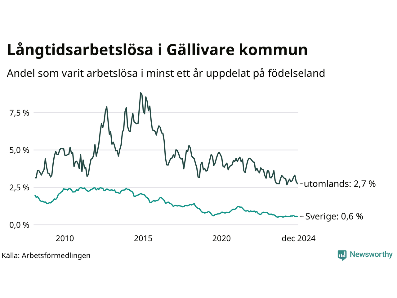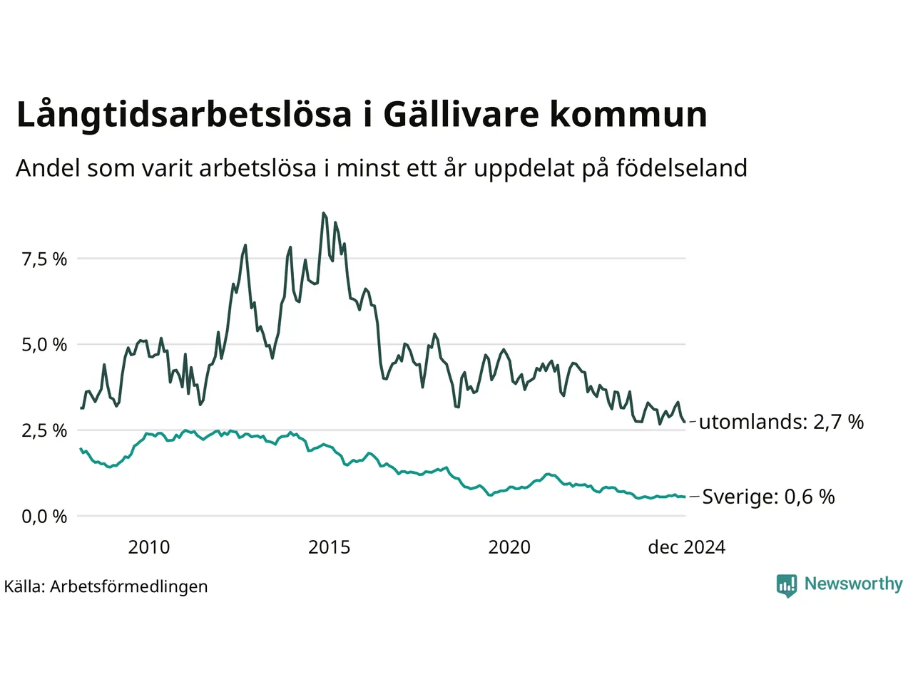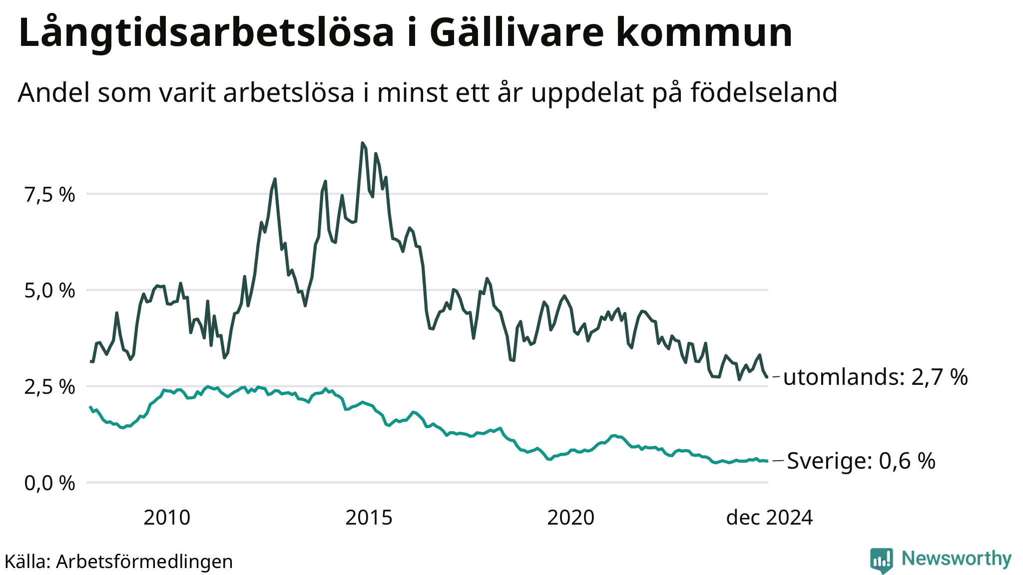 Graf: Andel arbetslösa uppdelat på födelseland i Gällivare