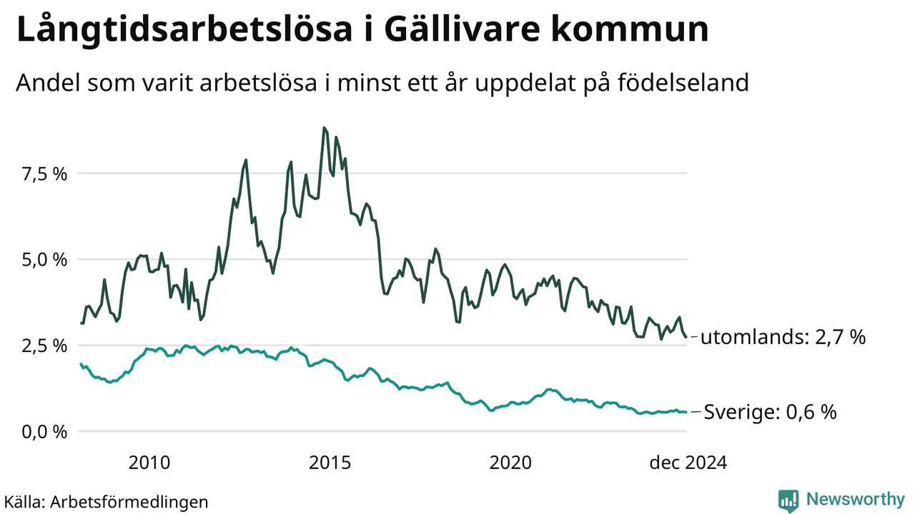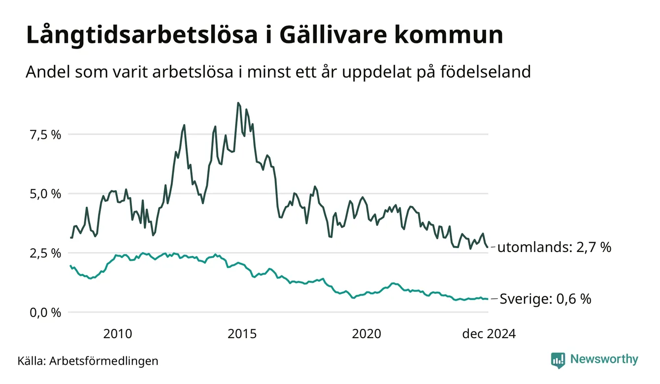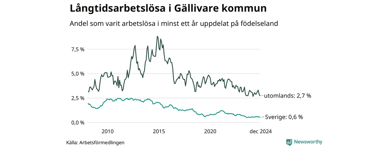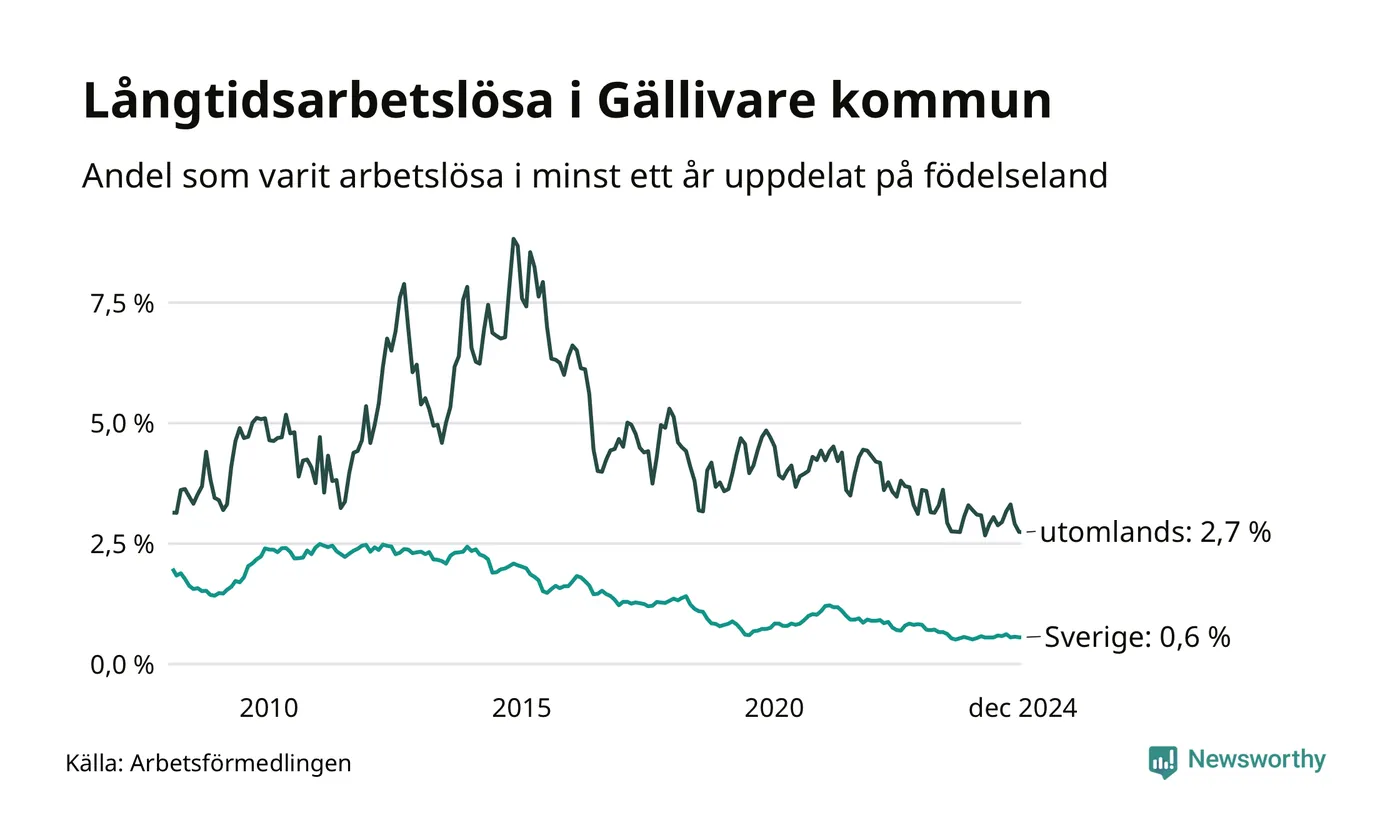 42 av de långtidsarbetslösa i Gällivare är födda i Sverige, medan 35 är födda utomlands. Det innebär att långtidsarbetslösheten bland Sverigefödda är 0,6 procent, medan den är fyra gånger så hög – 2,7 procent – bland födda utomlands. Även i riket som helhet är arbetslösheten högre bland utrikesfödda.