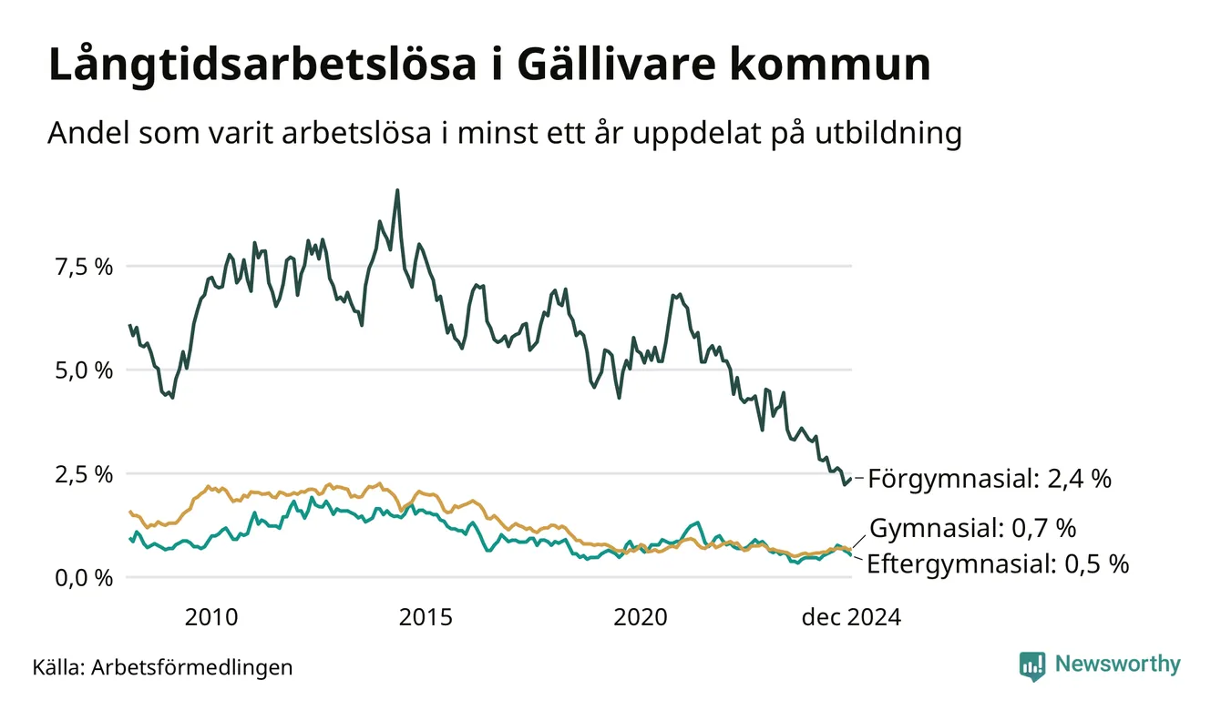 Graf över andel långtidsarbetslösa i Gällivare uppdelat på utbildningsnivå
