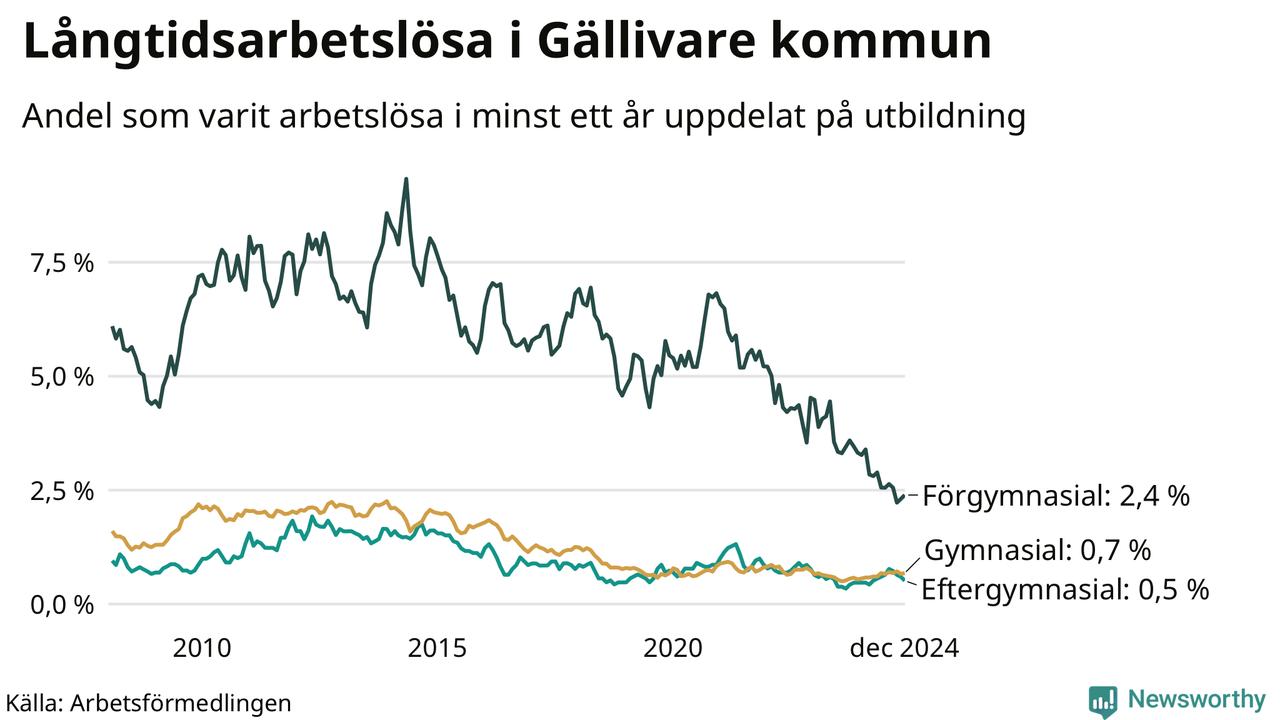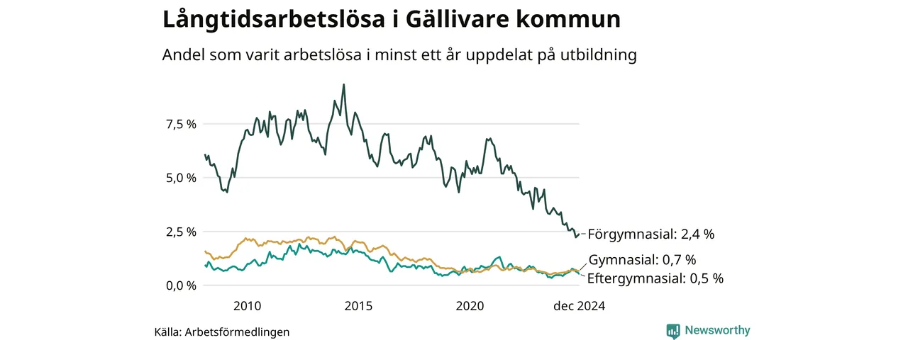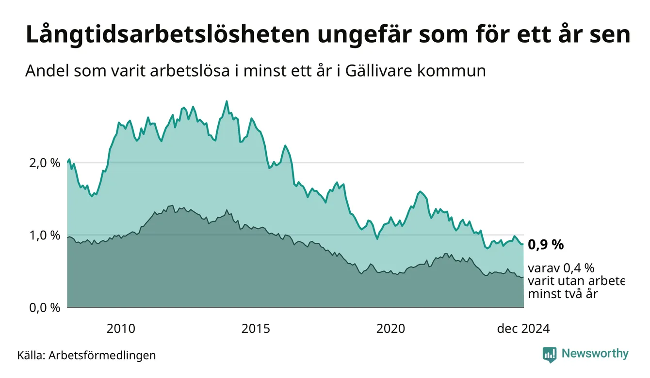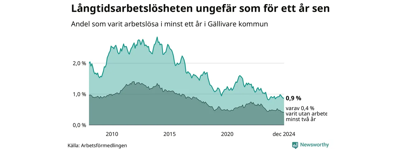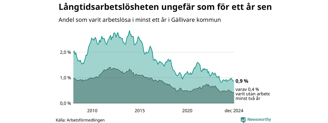 I december hade 77 Gällivarebor varit arbetslösa i minst ett år, vilket är lika många som månaden innan. Det är den fjärde månaden i rad med minskande eller oförändrat antal långtidsarbetslösa. 77 personer motsvarar 0,9 procent av arbetskraften i kommunen – andelen långtidsarbetslösa är ungefär på samma nivå som för ett år sedan. Gällivare tillhör de kommuner som har lägst andel långtidsarbetslösa i hela landet just nu.