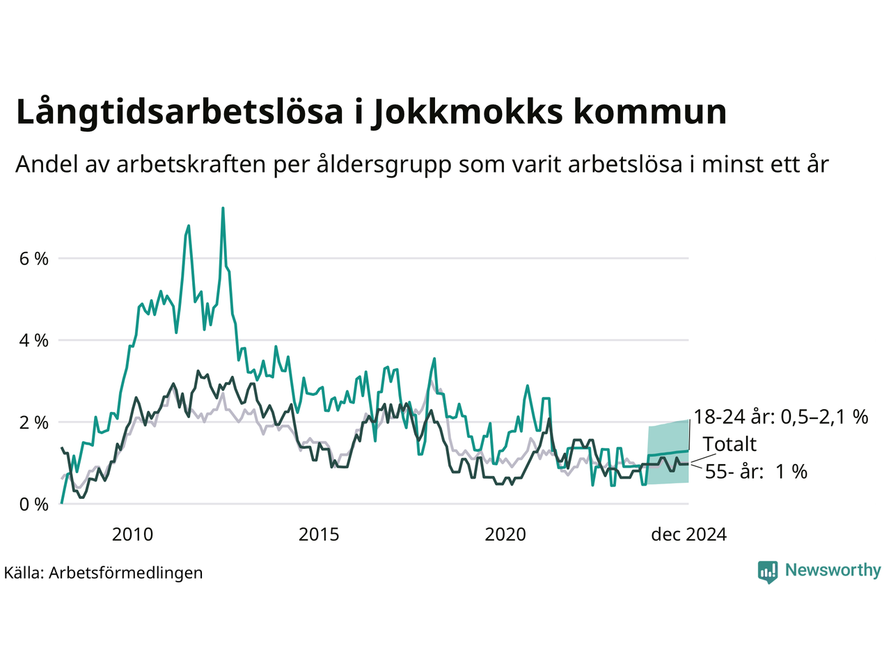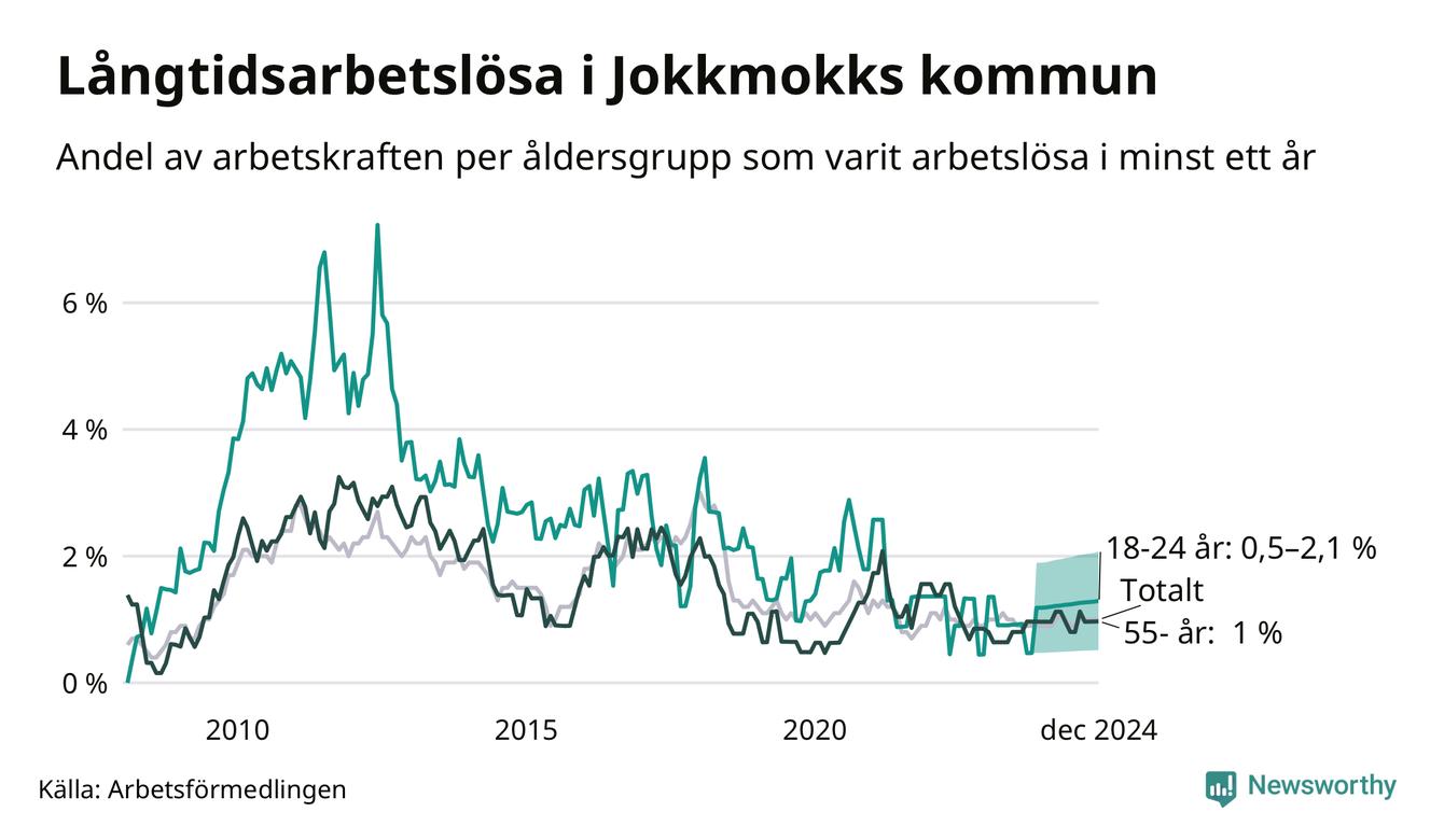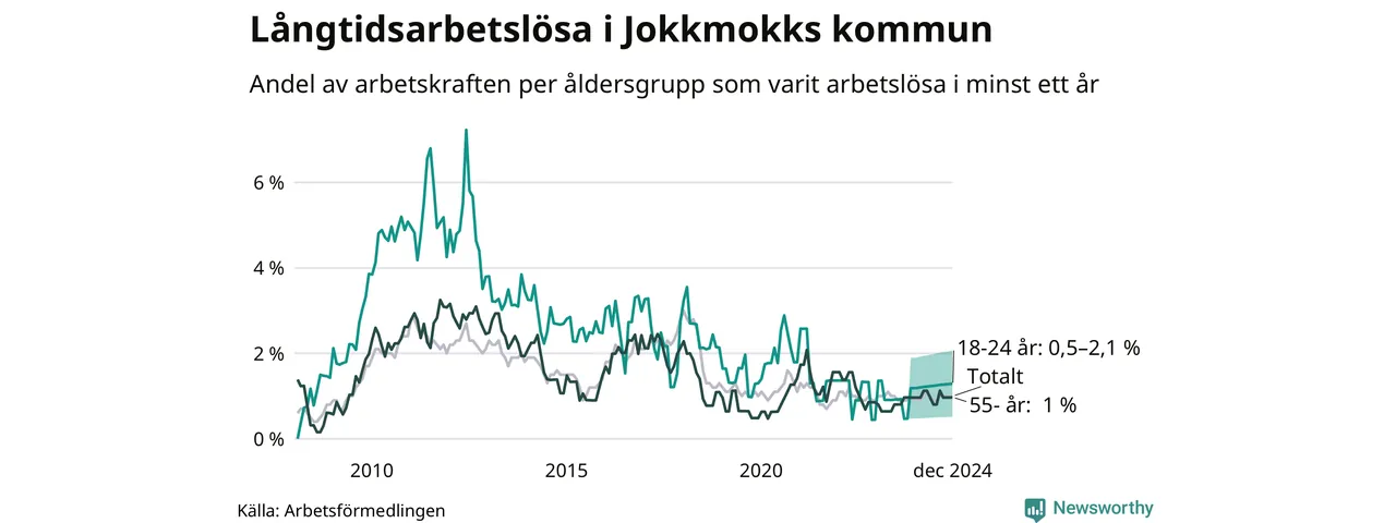Av de 22 personerna som varit arbetslösa i mer än ett år i Jokkmokks kommun är sex personer mellan 55 och 651 år och mellan en och fyra är mellan 18 och 24 år. För den äldre gruppen är andelen arbetslösa 1,0 procent medan den i den yngre gruppen är mellan 0,5 och 2,1 procent. Även i riket som helhet är långtidsarbetslösheten högre i gruppen äldre.
