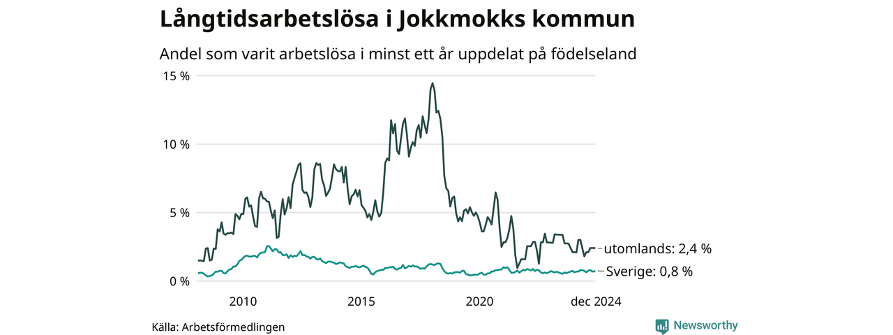 Graf: Andel arbetslösa i Jokkmokk som varit utan arbete i minst 12 månader