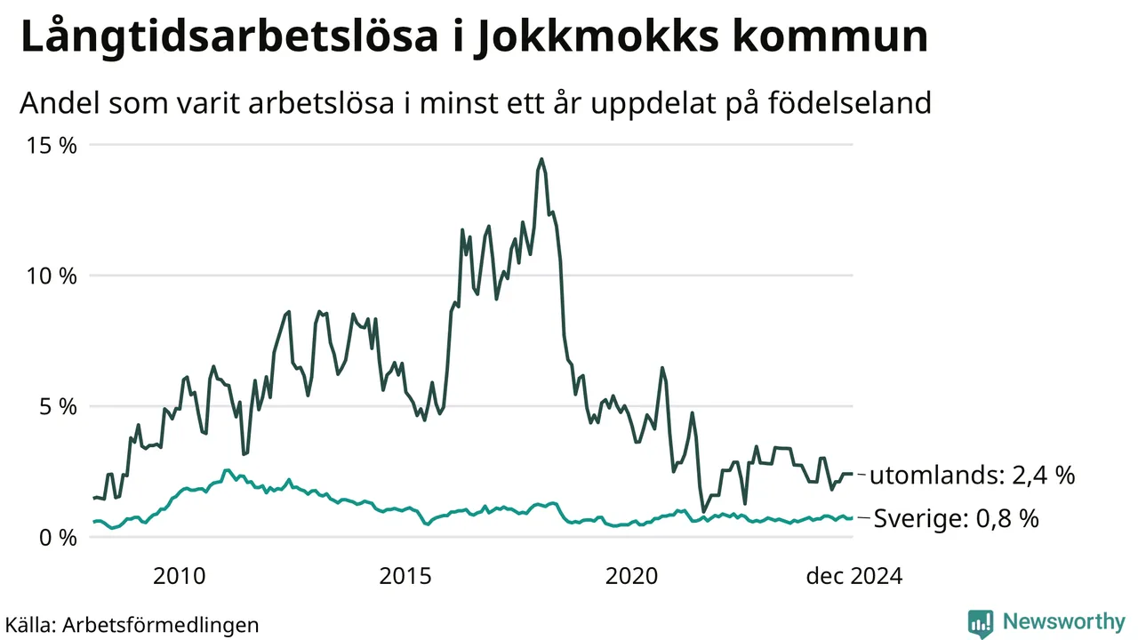 Graf: Andel arbetslösa uppdelat på födelseland i Jokkmokk
