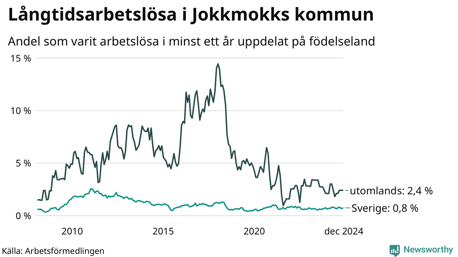 14 av de långtidsarbetslösa i Jokkmokk är födda i Sverige, medan åtta är födda utomlands. Det innebär att långtidsarbetslösheten bland Sverigefödda är 0,8 procent, medan den är tre gånger så hög – 2,4 procent – bland födda utomlands. Även i riket som helhet är arbetslösheten högre bland utrikesfödda.
