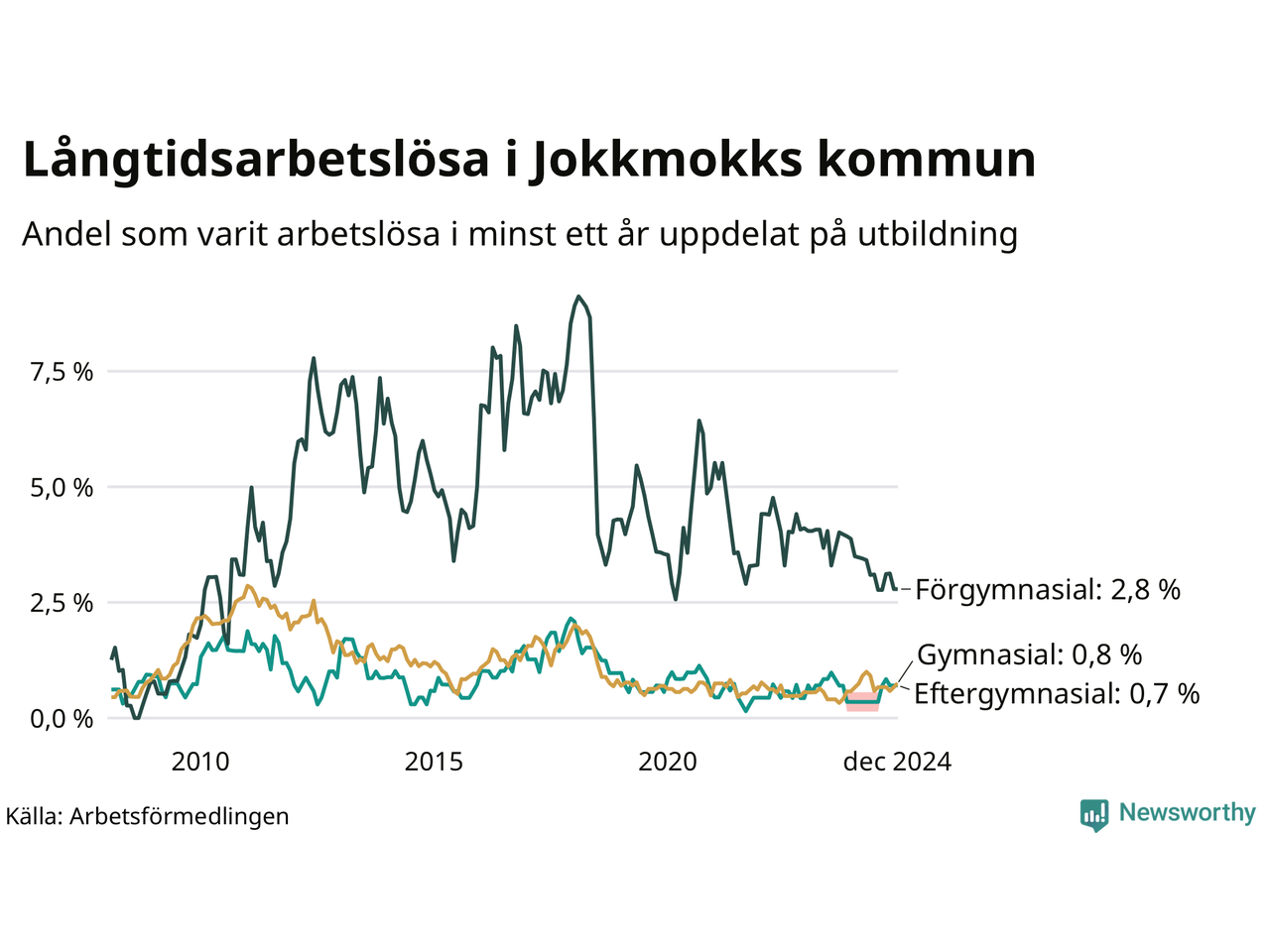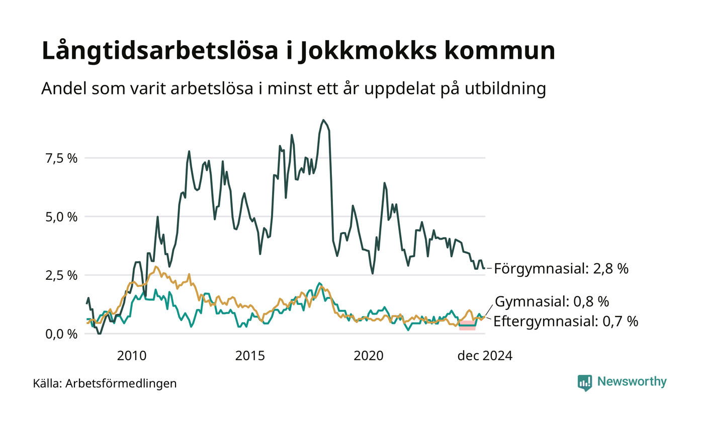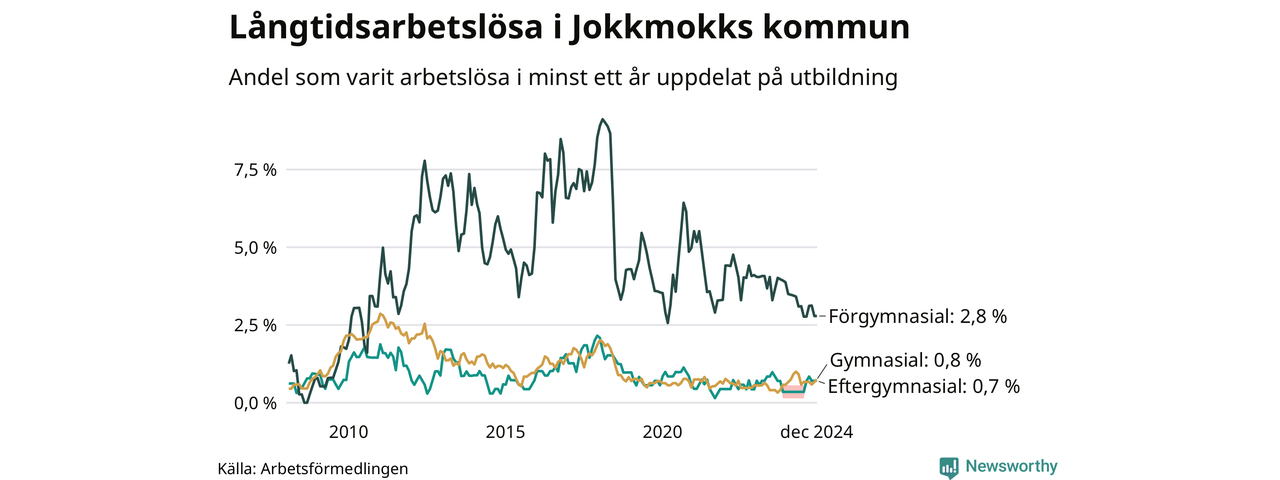 Graf över andel långtidsarbetslösa i Jokkmokk uppdelat på utbildningsnivå