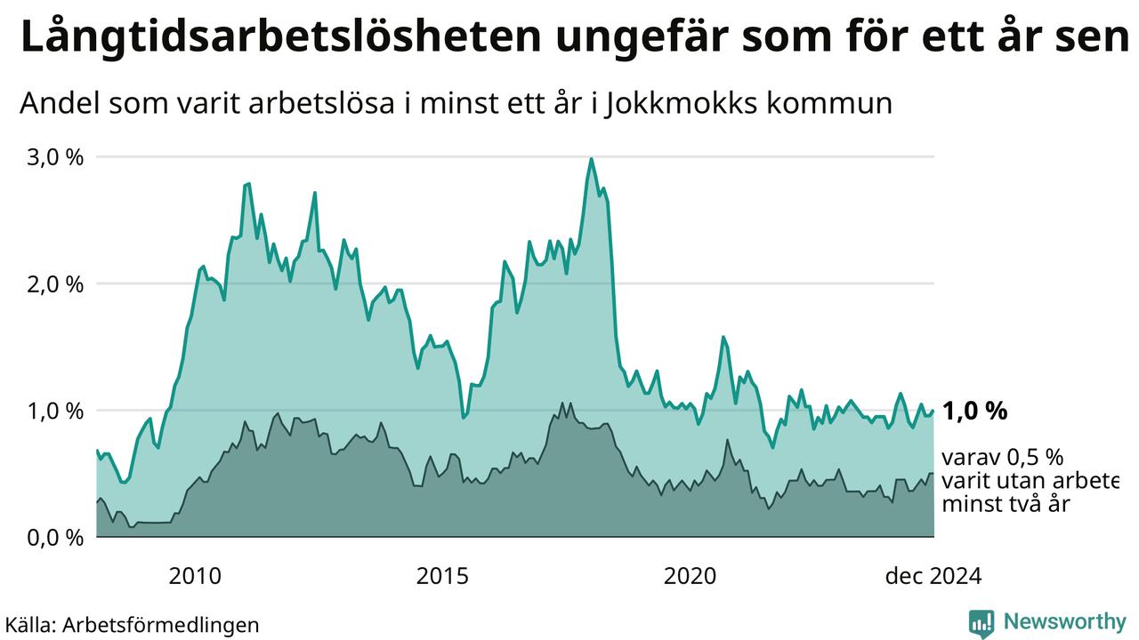 I december hade 22 Jokkmokksbor varit arbetslösa i minst ett år, vilket är en fler än månaden innan. 22 personer motsvarar 1,0 procent av arbetskraften i kommunen – andelen långtidsarbetslösa är ungefär på samma nivå som för ett år sedan. Jokkmokk tillhör de kommuner som har lägst andel långtidsarbetslösa i hela landet just nu.