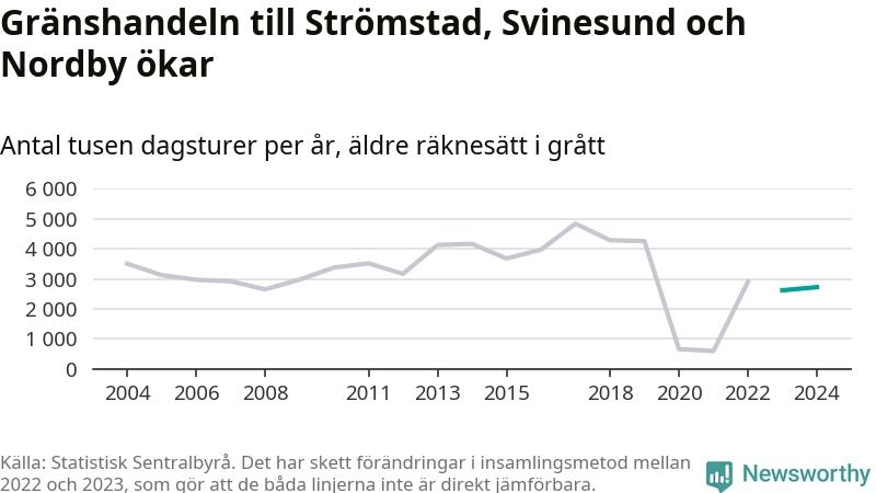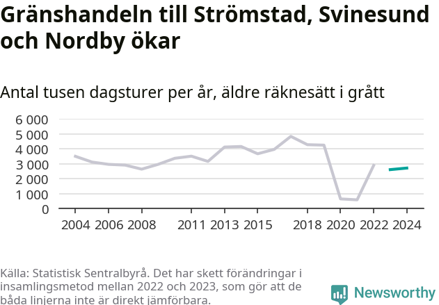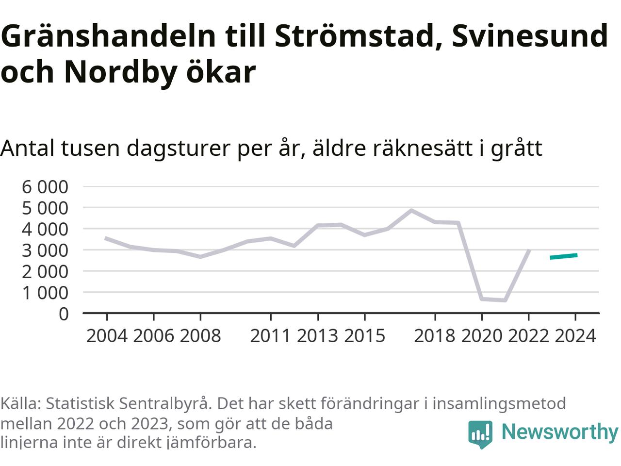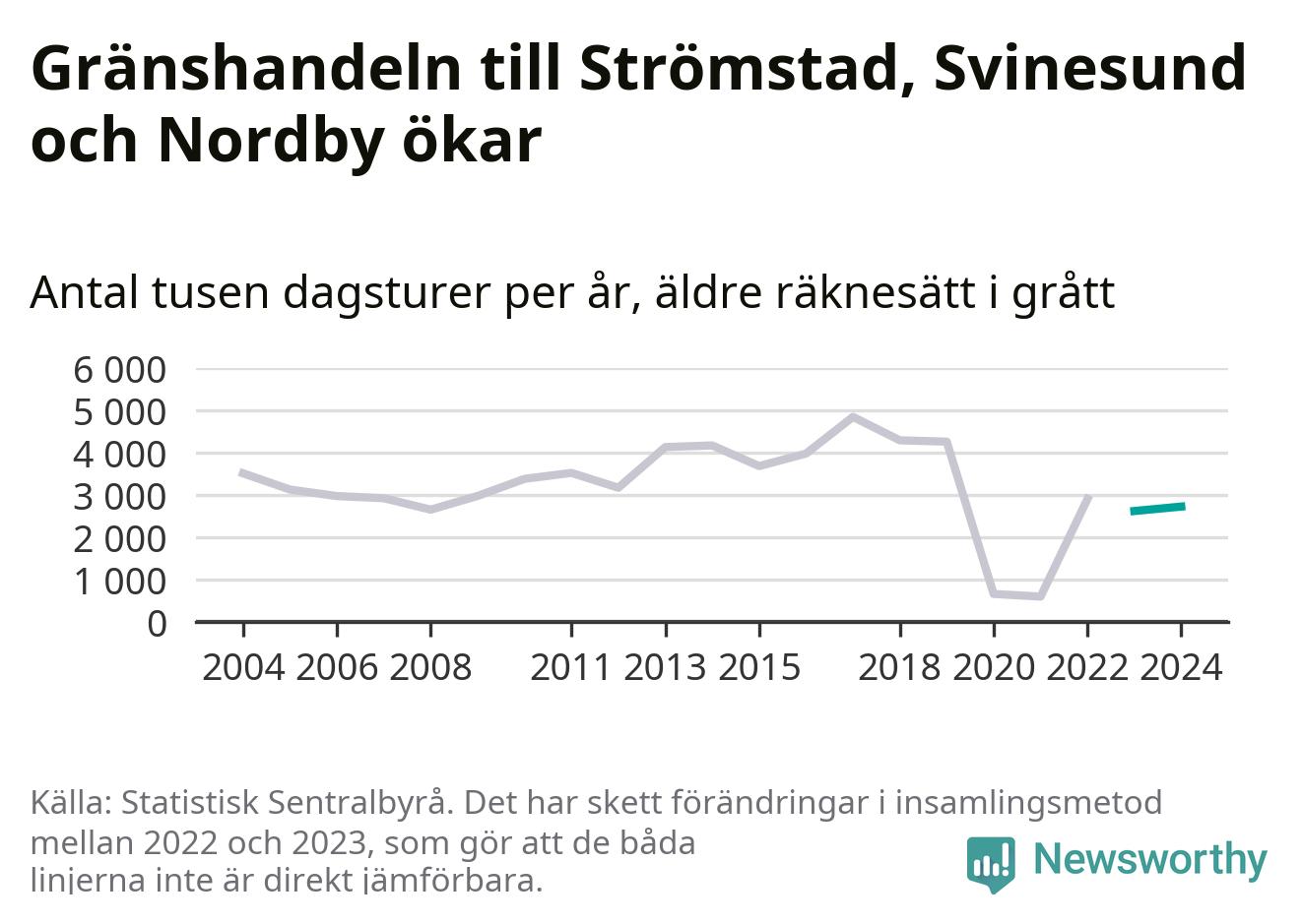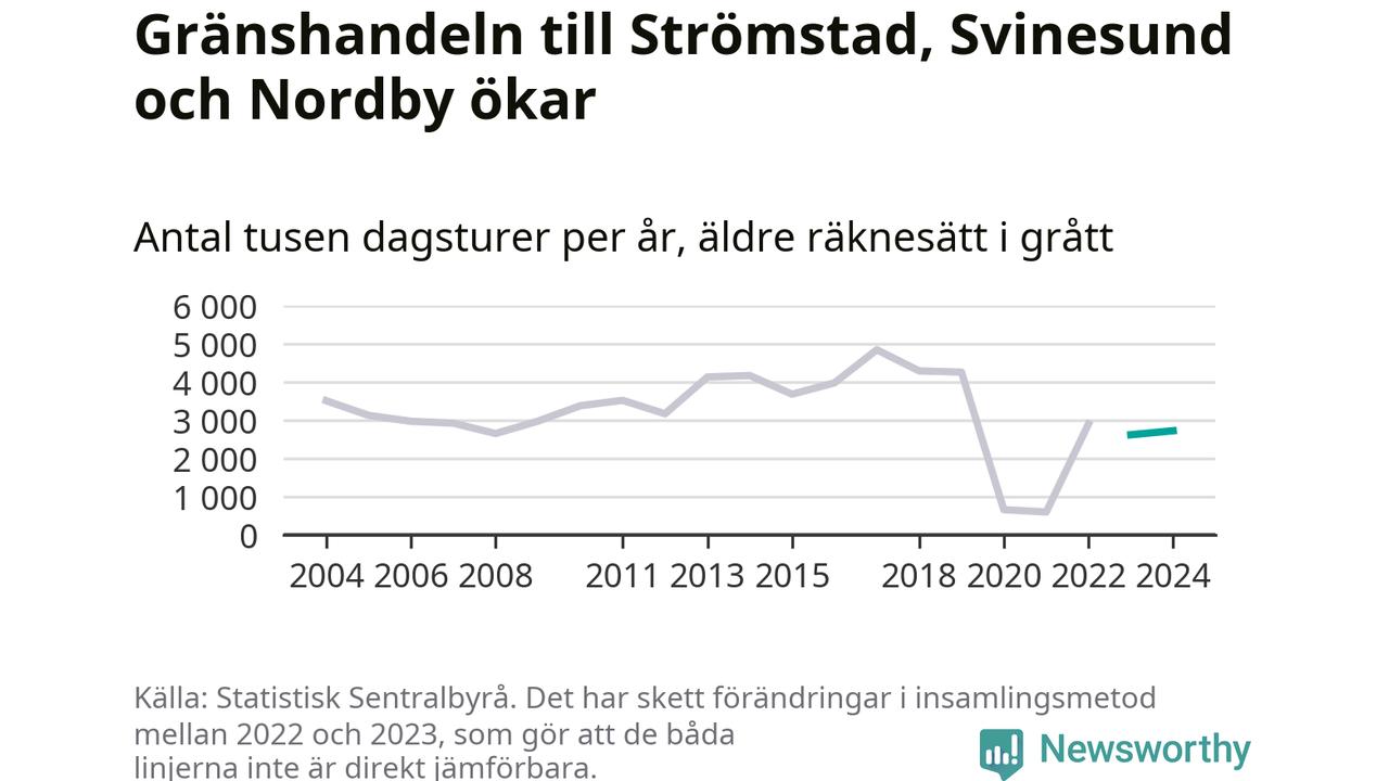 Gränshandeln i Strömstad, Svinesund och Nordby ökade i fjol med 4 procent i fjol jämfört med 2023, räknat i antal dagsresor över gränsen. Totalt gjordes 2,7 miljoner sådana resor till gränshandelsorterna i Strömstads kommun under 2024 enligt Statistisk Sentralbyrå (SSB), att jämföra med 2,6 miljoner under 2023.