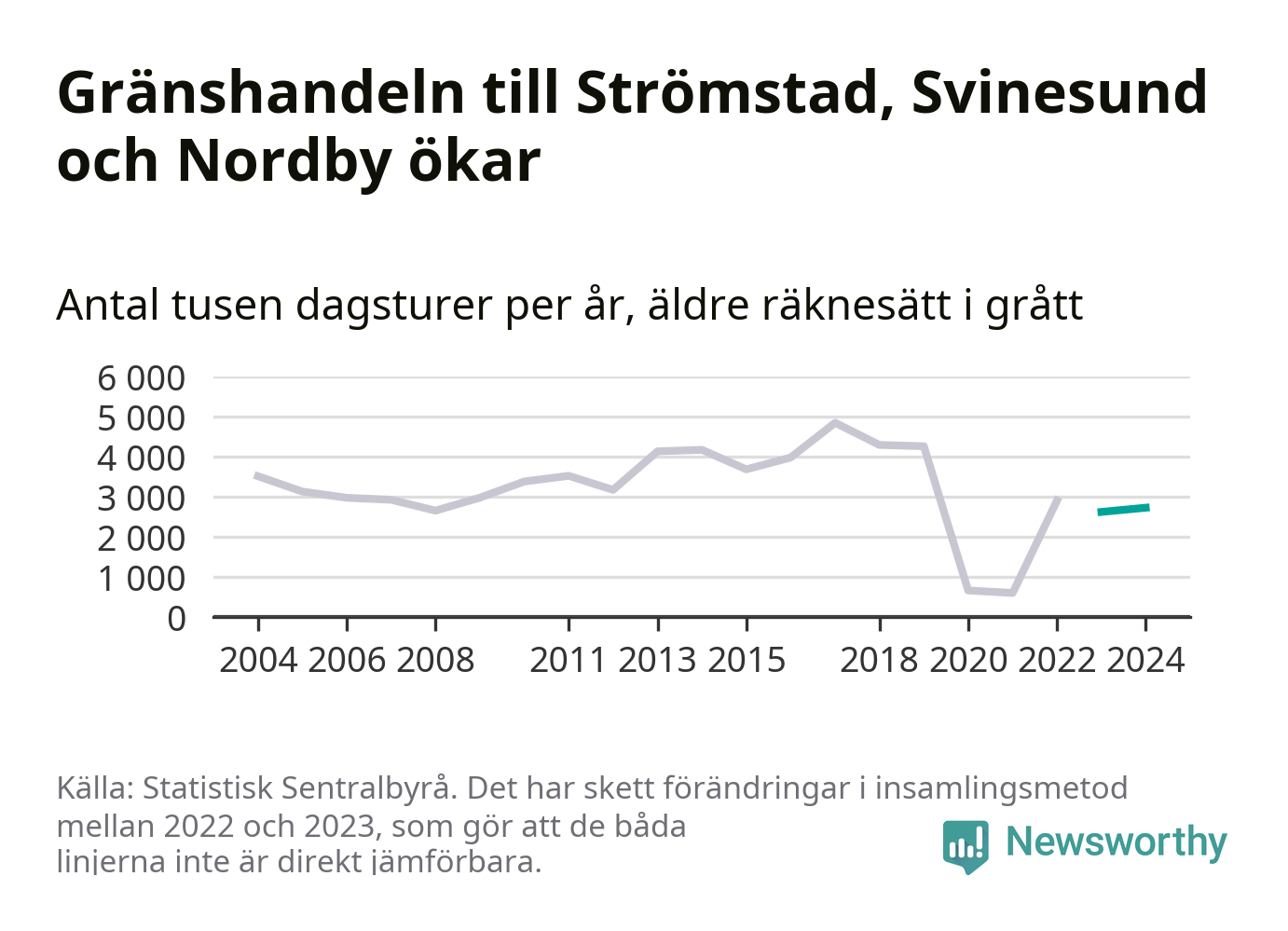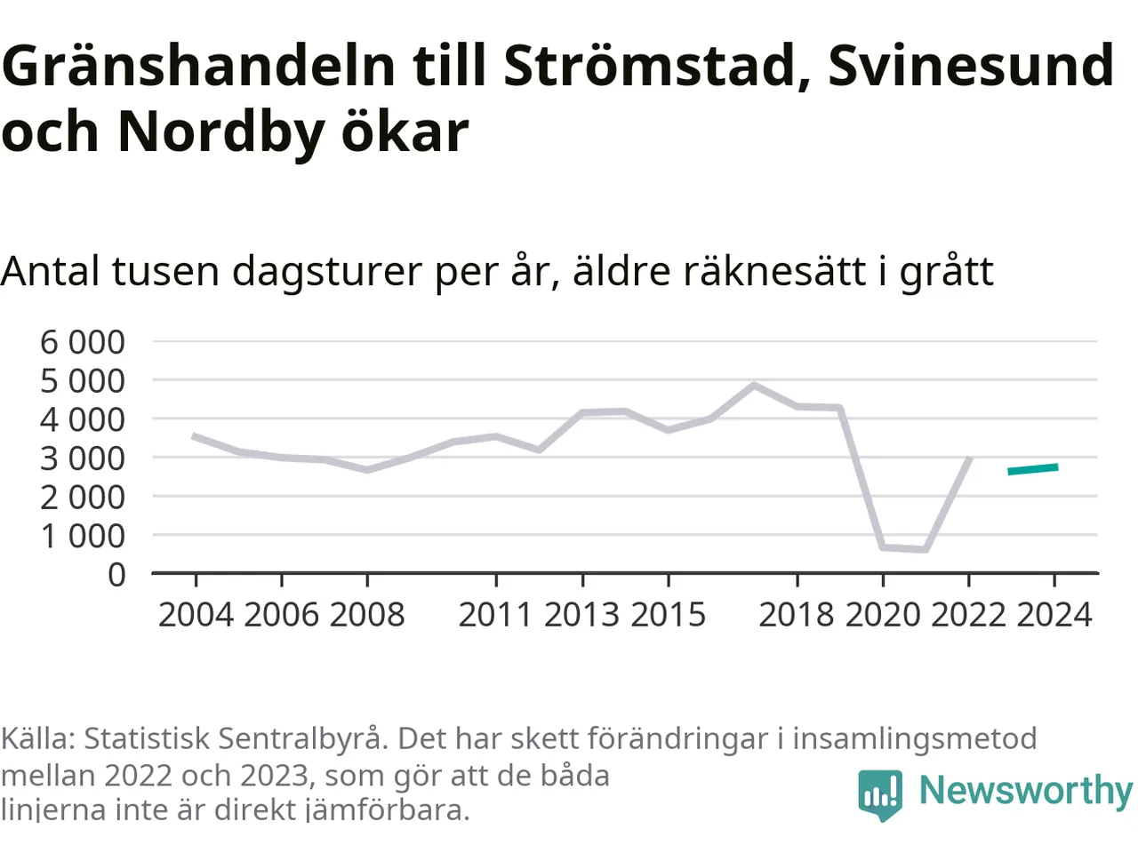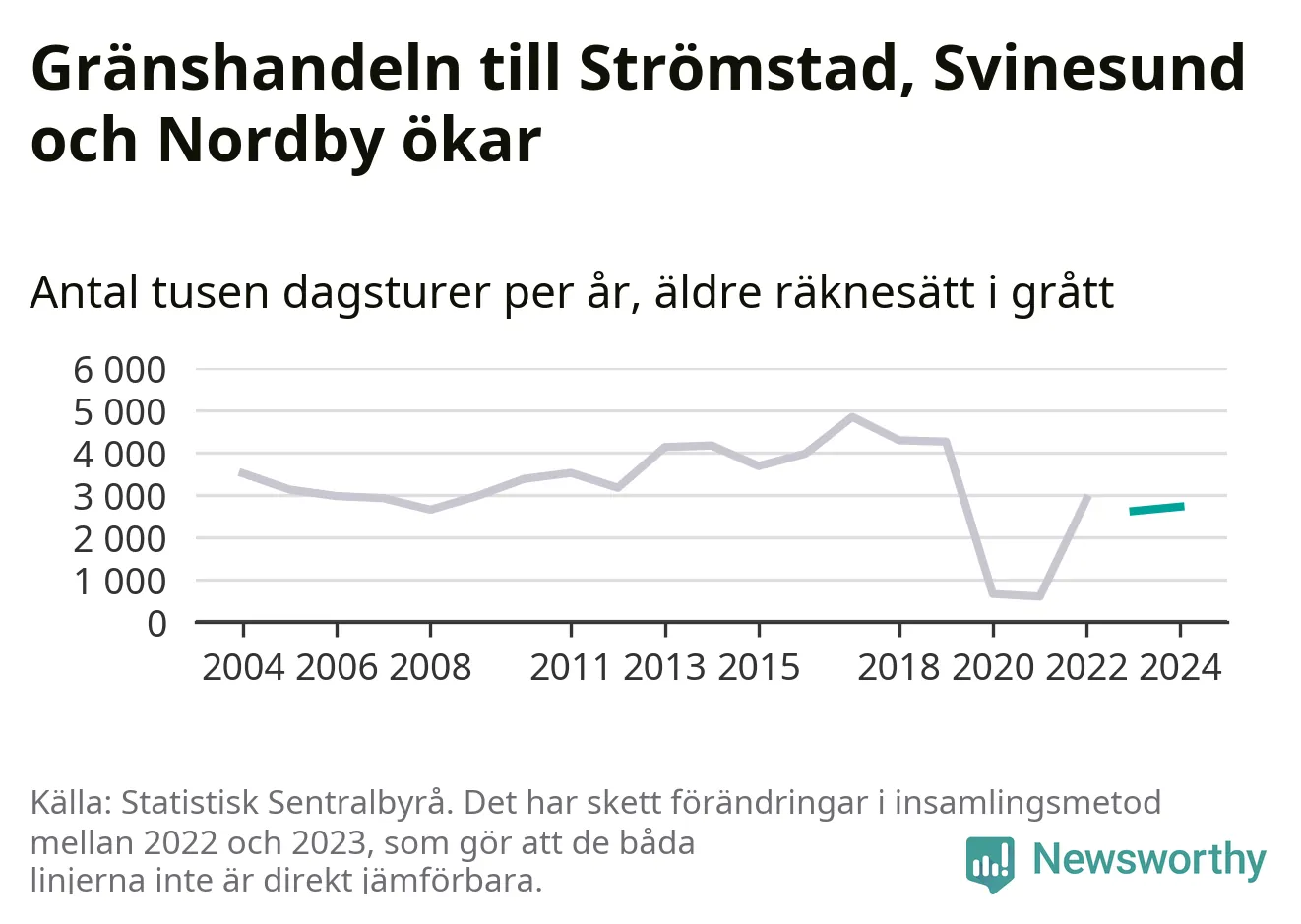 Den norska statistiken över gränshandel bygger på en enkätundersökning till invånare över hela Norge, och mellan 2022 och 2023 gjordes en stor ändring i hur den undersökningen genomförs. Det gör att de sensaste årens siffror inte går att jämföra med tidigare år, och det är alltså svårt att med säkerhet säga om handeln återhämtat sig efter pandemin. Enligt SSB har den tidigare undersökningsmetoden troligen överskattat handeln.