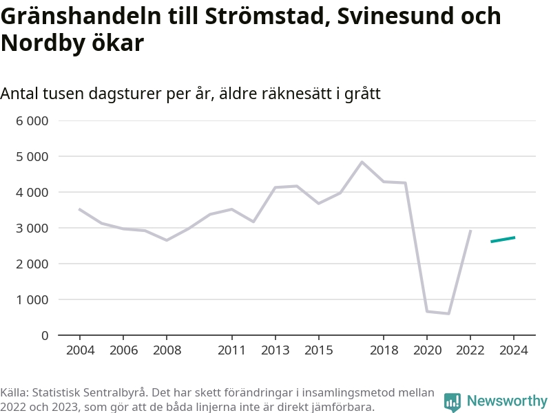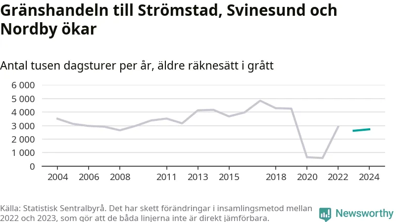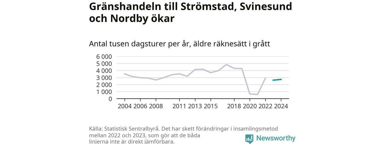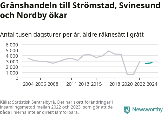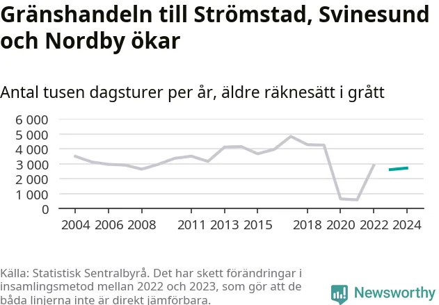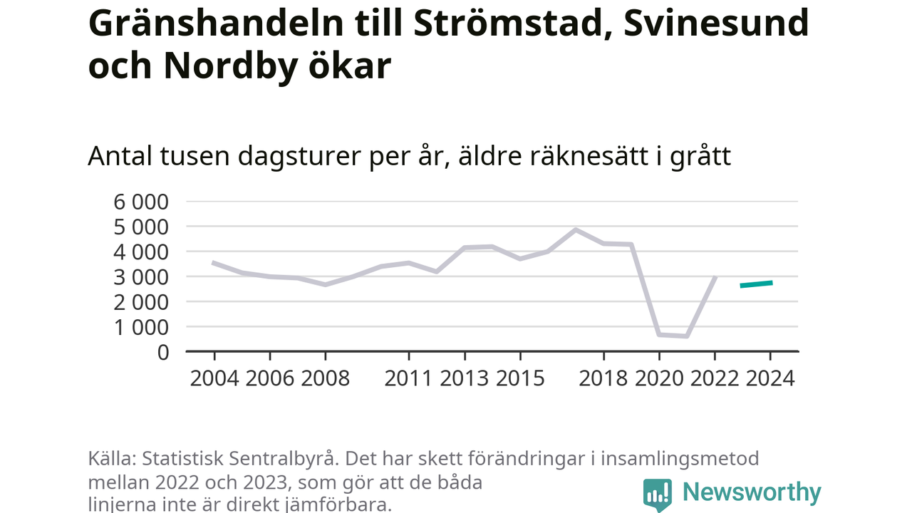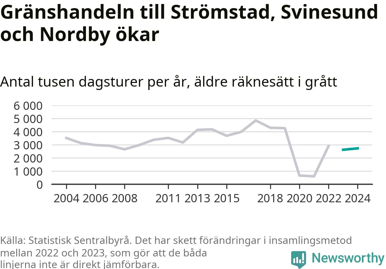 Den norska statistiken över gränshandel bygger på en enkätundersökning till invånare över hela Norge, och mellan 2022 och 2023 gjordes en stor ändring i hur den undersökningen genomförs. Det gör att de sensaste årens siffror inte går att jämföra med tidigare år, och det är alltså svårt att med säkerhet säga om handeln återhämtat sig efter pandemin. Enligt SSB har den tidigare undersökningsmetoden troligen överskattat handeln.