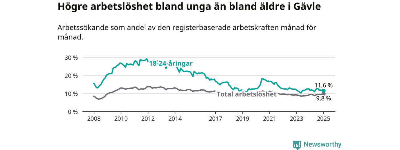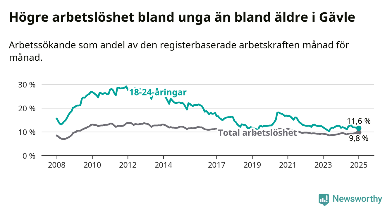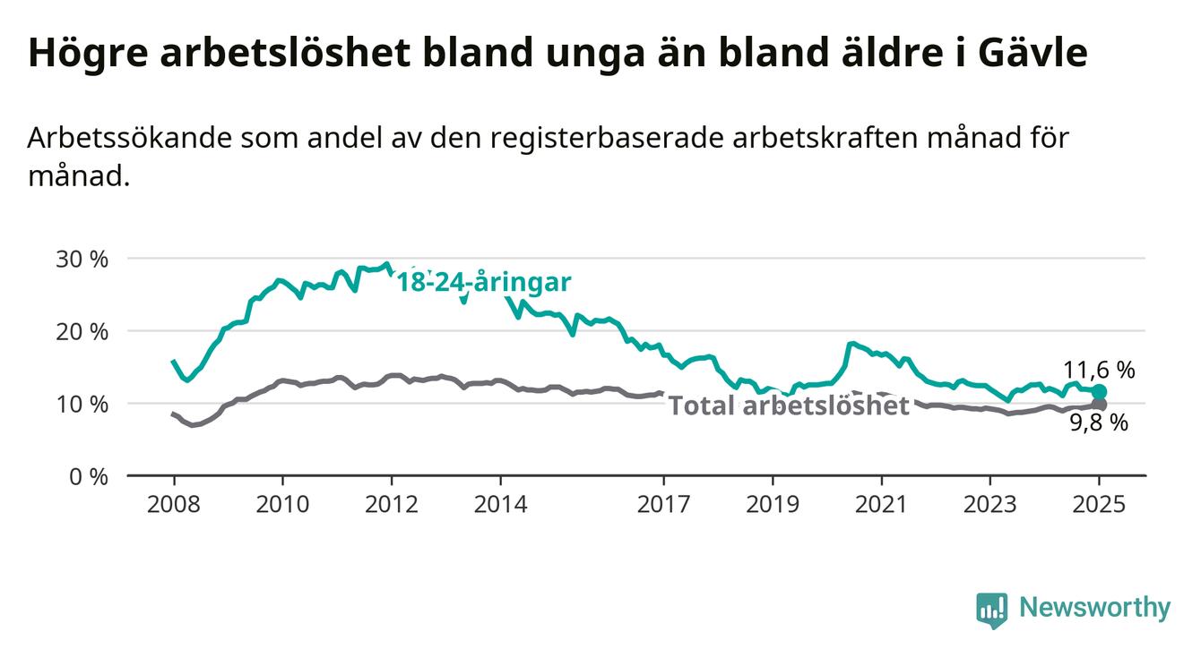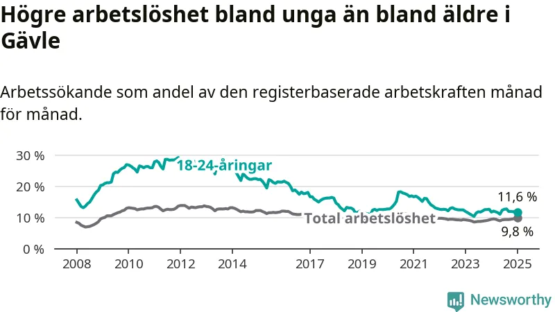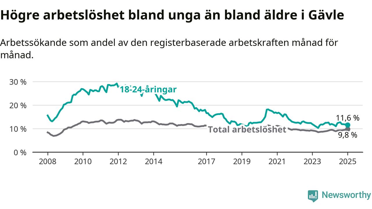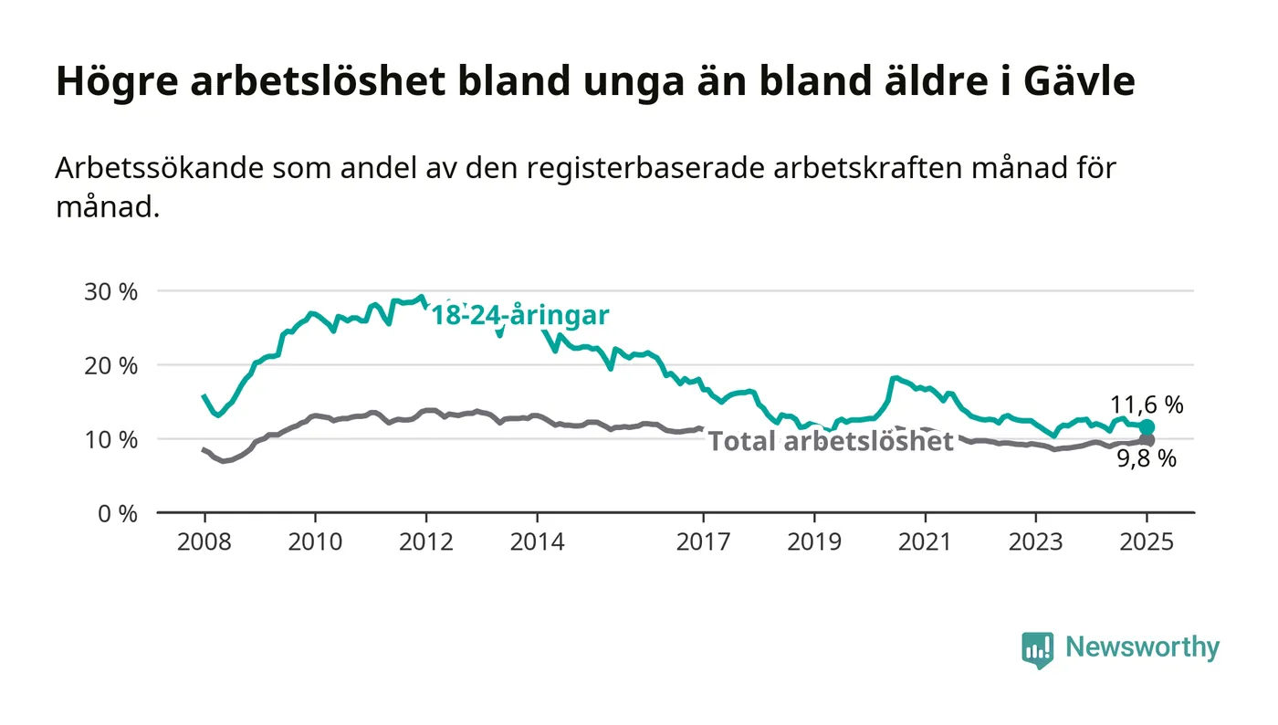 Medan Gävle har högre total arbetslöshet än Gävleborg, ligger ungdomsarbetslösheten 0,7 procentenheter lägre i Gävle.