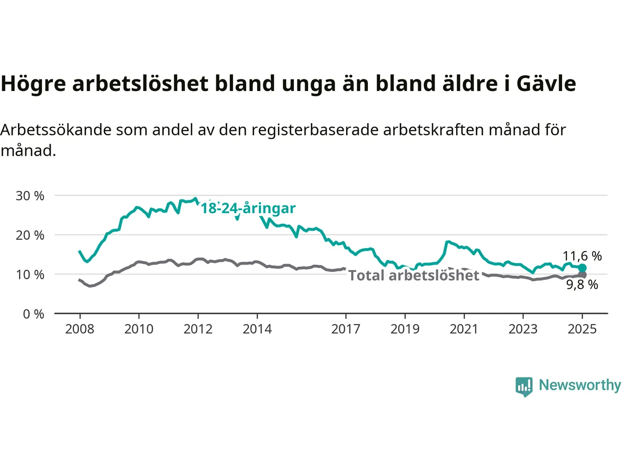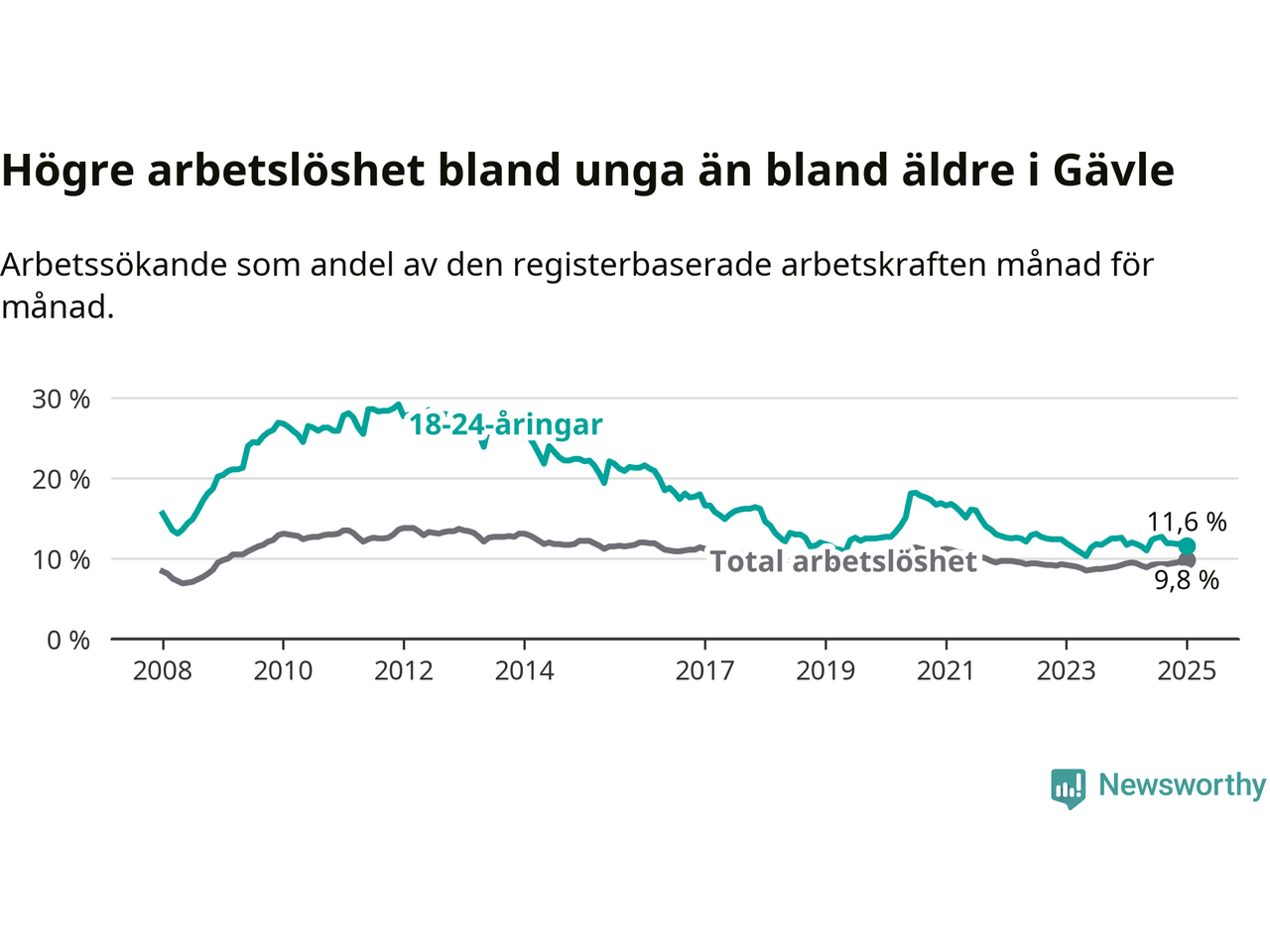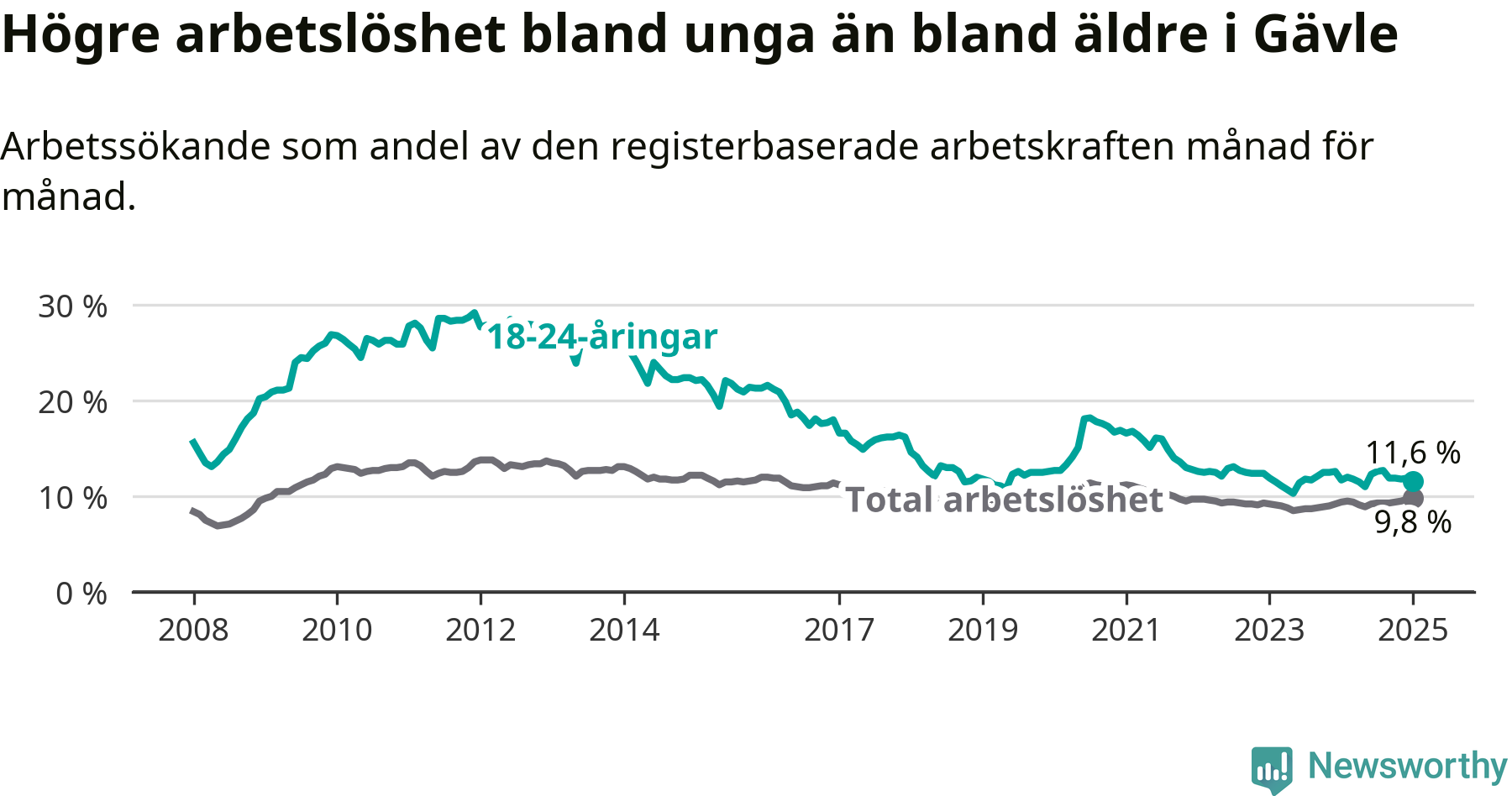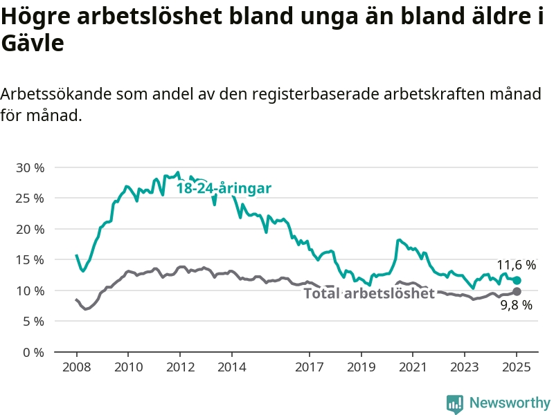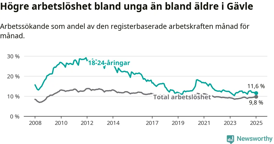 Medan Gävle har högre total arbetslöshet än Gävleborg, ligger ungdomsarbetslösheten 0,7 procentenheter lägre i Gävle.
