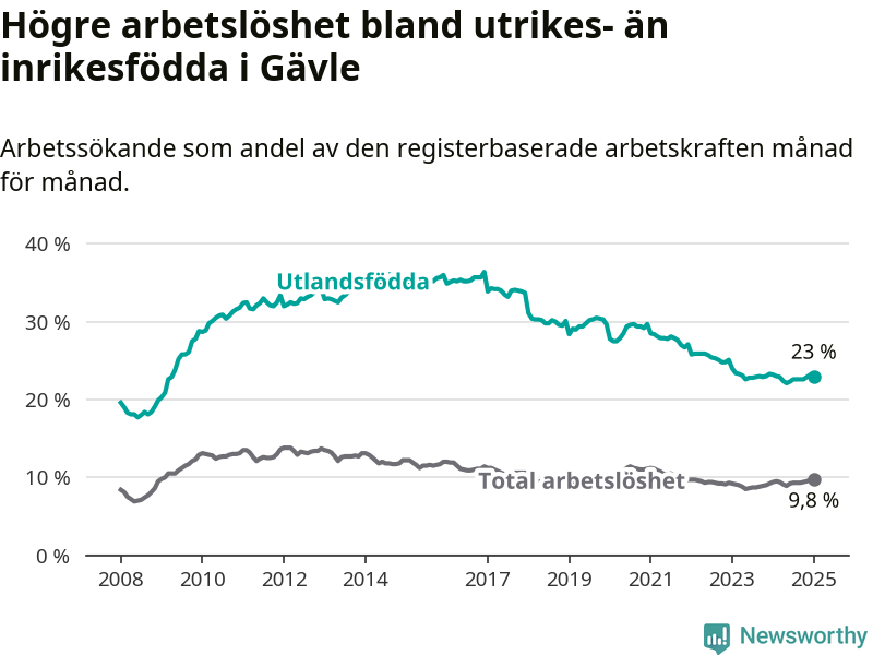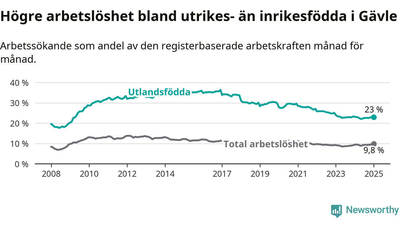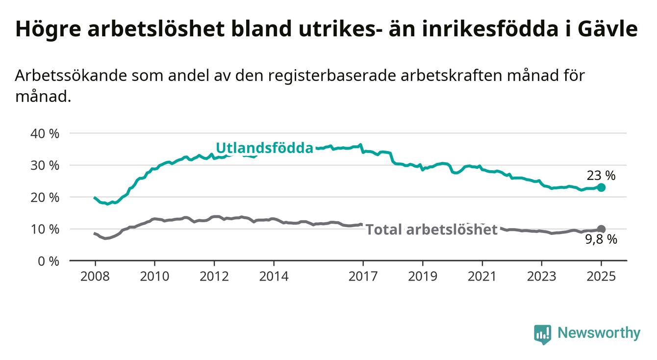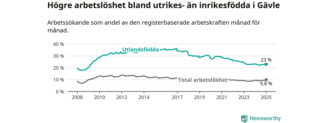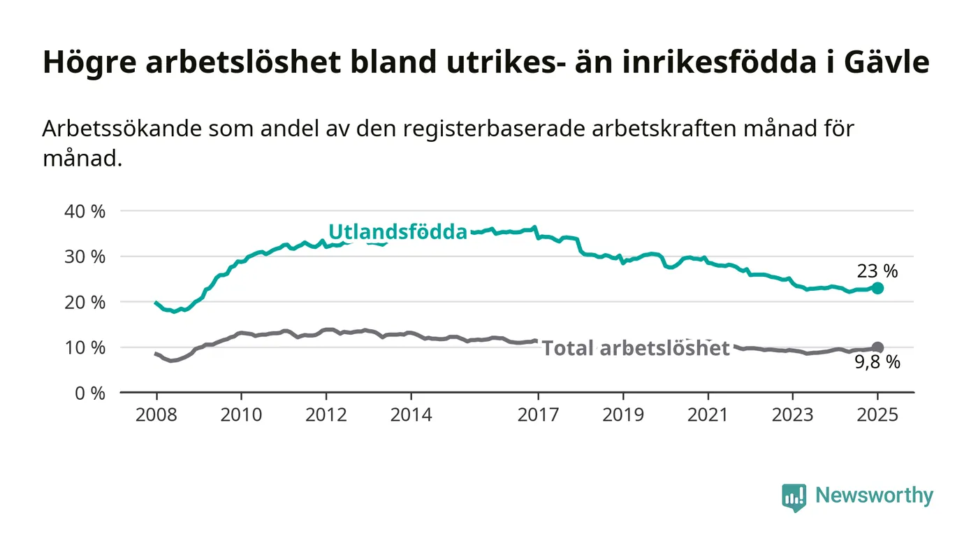 Skillnaden i arbetslöshet mellan utrikesfödda och hela befolkningen är 13,2 procentenheter i Gävle. Det är en mindre skillnad än för ett år sedan (−0,6 procentenheter).