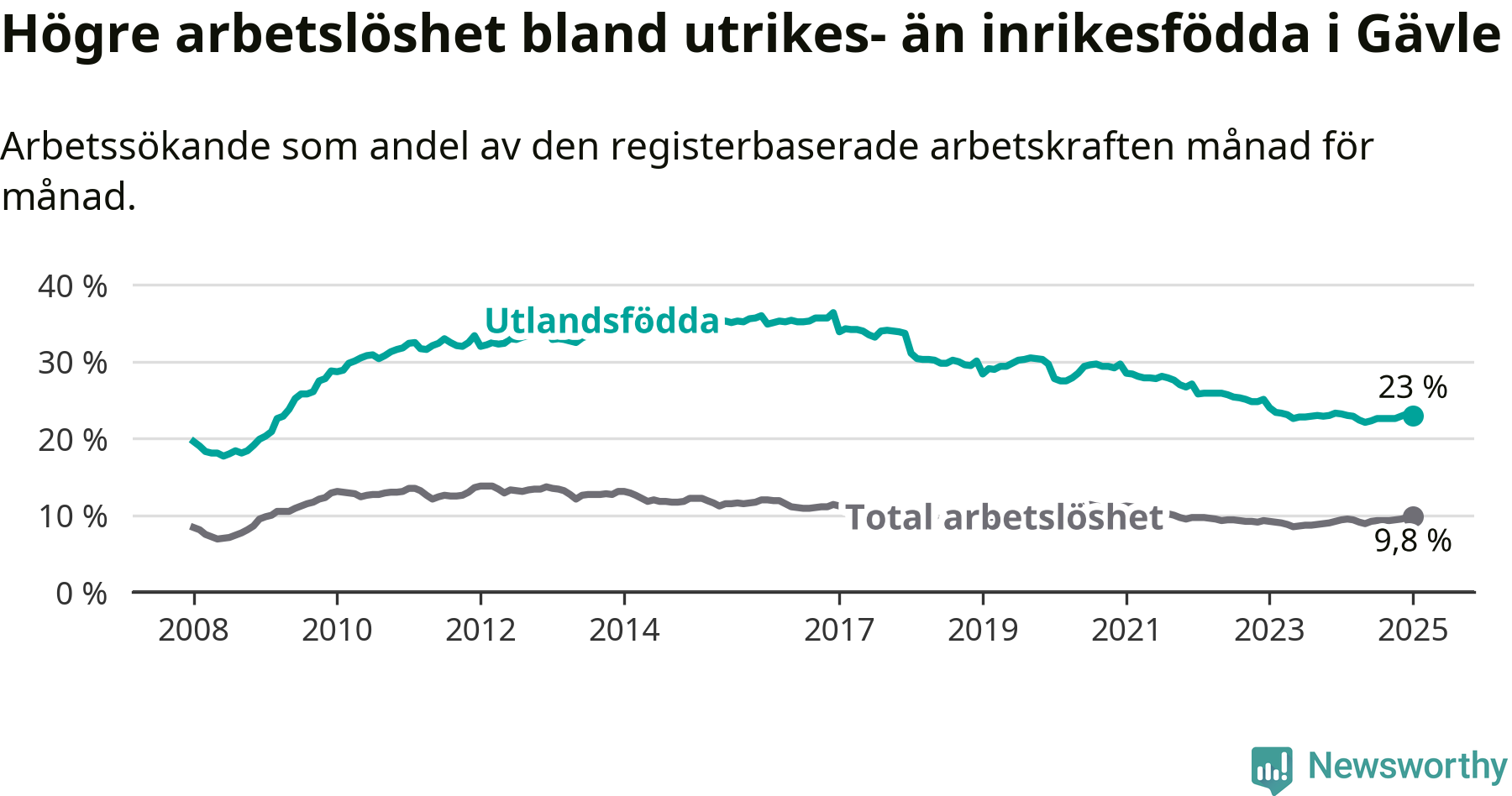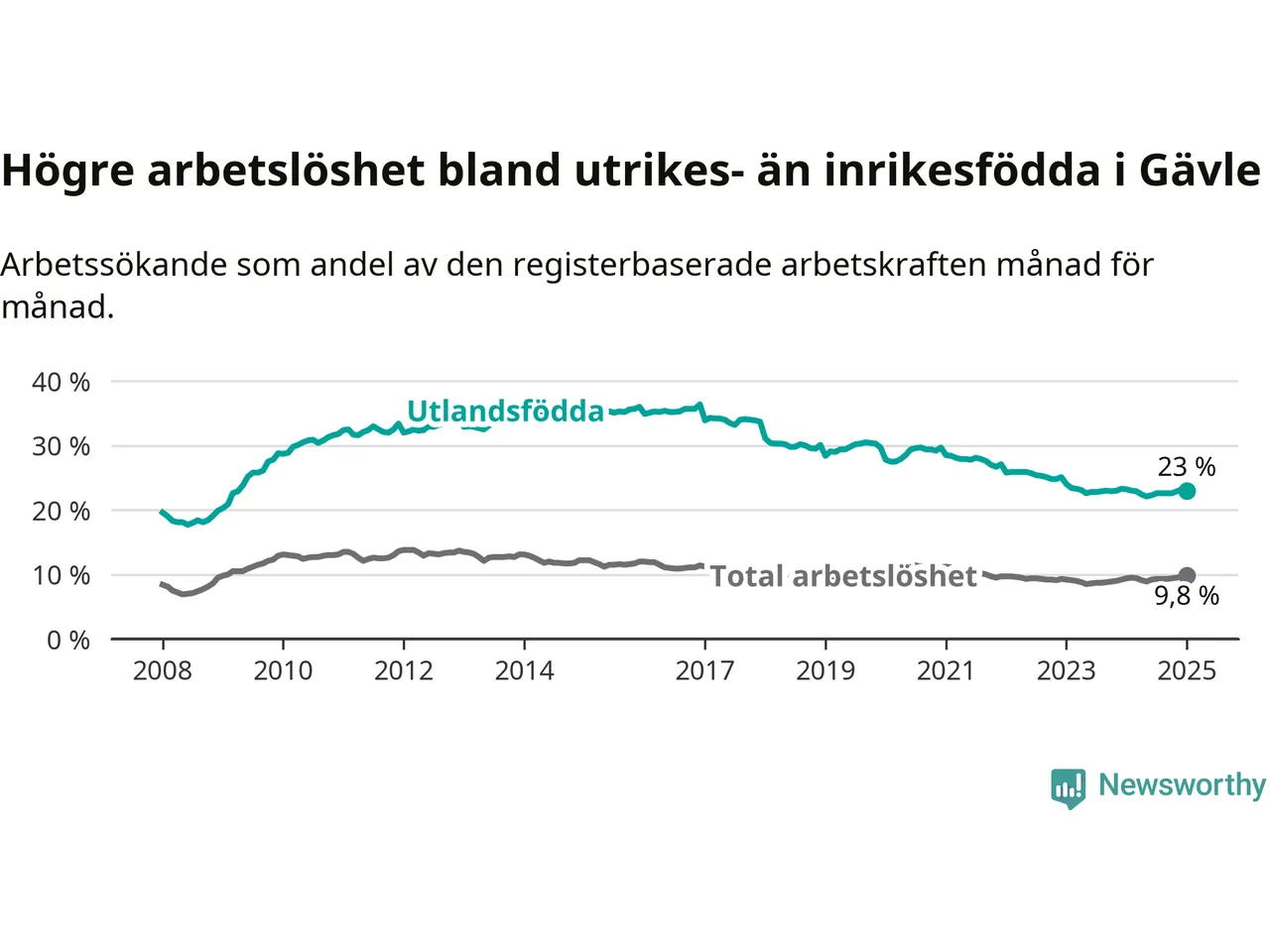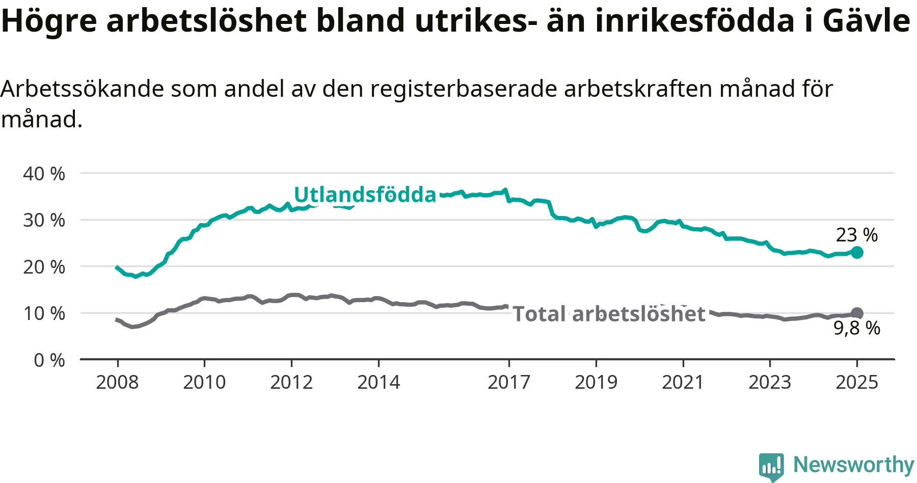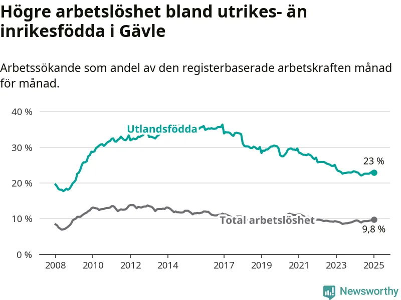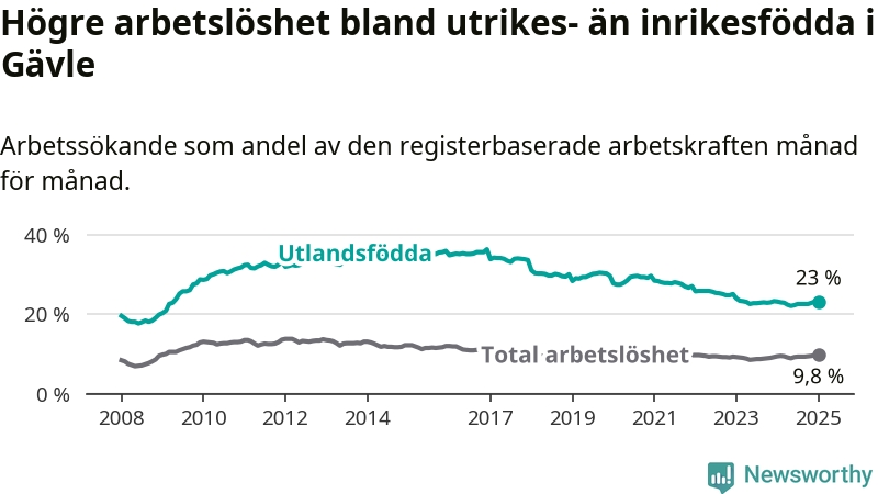Skillnaden i arbetslöshet mellan utrikesfödda och hela befolkningen är 13,2 procentenheter i Gävle. Det är en mindre skillnad än för ett år sedan (−0,6 procentenheter).