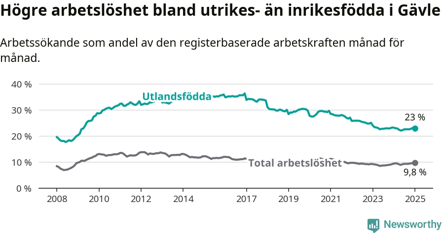 Arbetslösheten bland utlandsfödda var 23,0 procent i Gävle under januari månad, motsvarande 2 493 av 10 839 personer. Det är 0,2 procentenheter färre än vid samma tidpunkt i fjol (+2 470 om man räknar personer). Därmed har de utlandsföddas arbetslöshet varit lägre än vid samma tidpunkt i fjol i över tre år i sträck. Sedan april 2021 har arbetslösheten bland utlandsfödda minskat från 27,9 till 23,0 procent.