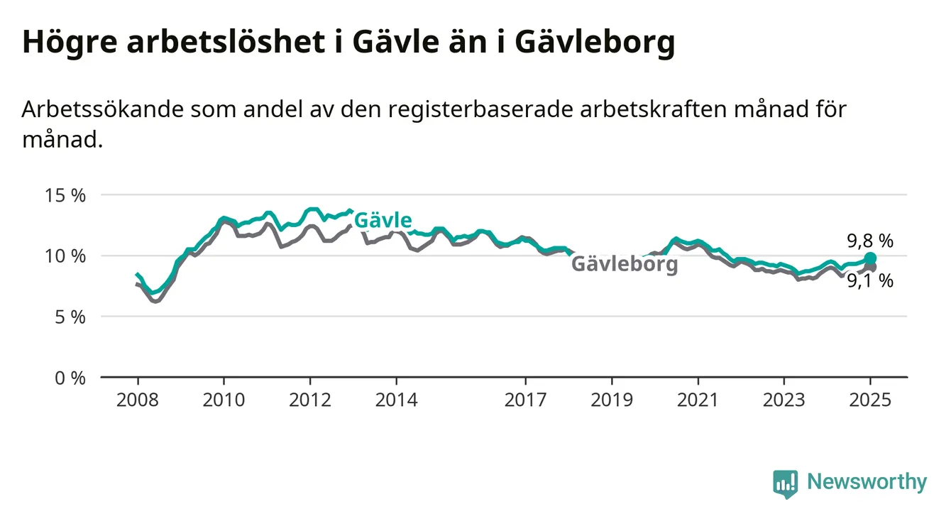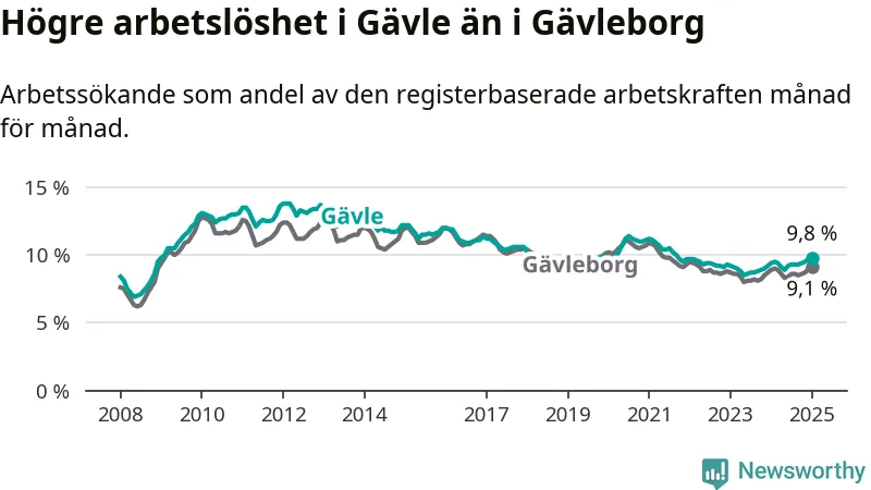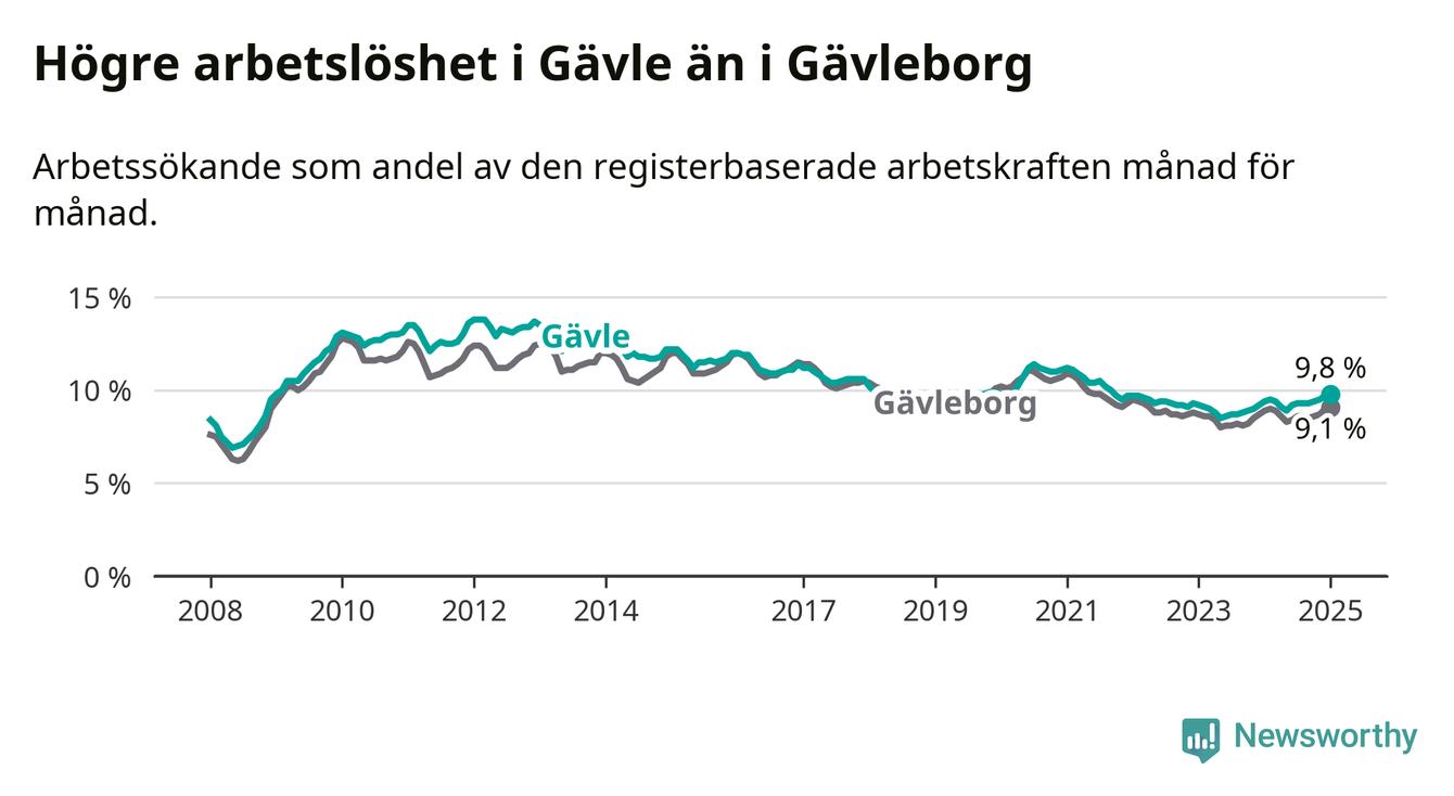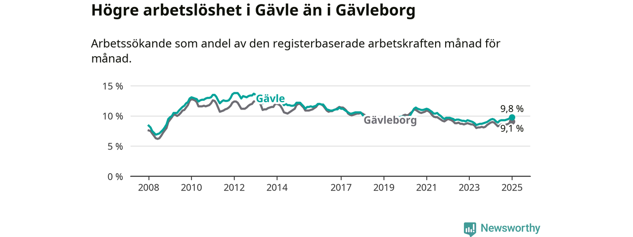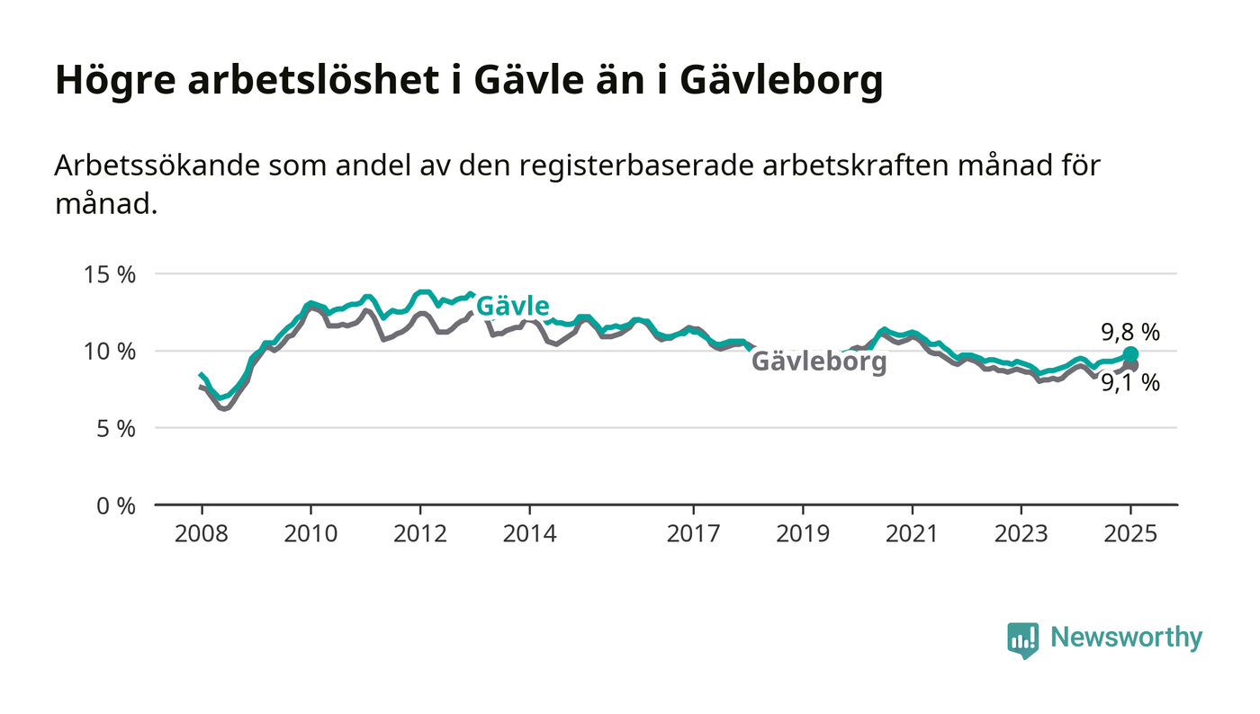 Gävle hade redan tidigare högre arbetslöshet än snittet i hela Gävleborgs län och nu växer klyftan (9,8 procent i kommunen, jämfört med 9,1 procent i hela länet). Hudiksvall och Ovanåker har den lägsta arbetslösheten i länet (6,4 procent), medan Söderhamn har den högsta (10,8 procent). För att Gävle skulle komma ner i samma arbetslöshetsnivå som Hudiksvall och Ovanåker skulle 1 783 personer behöva sysselsättas.