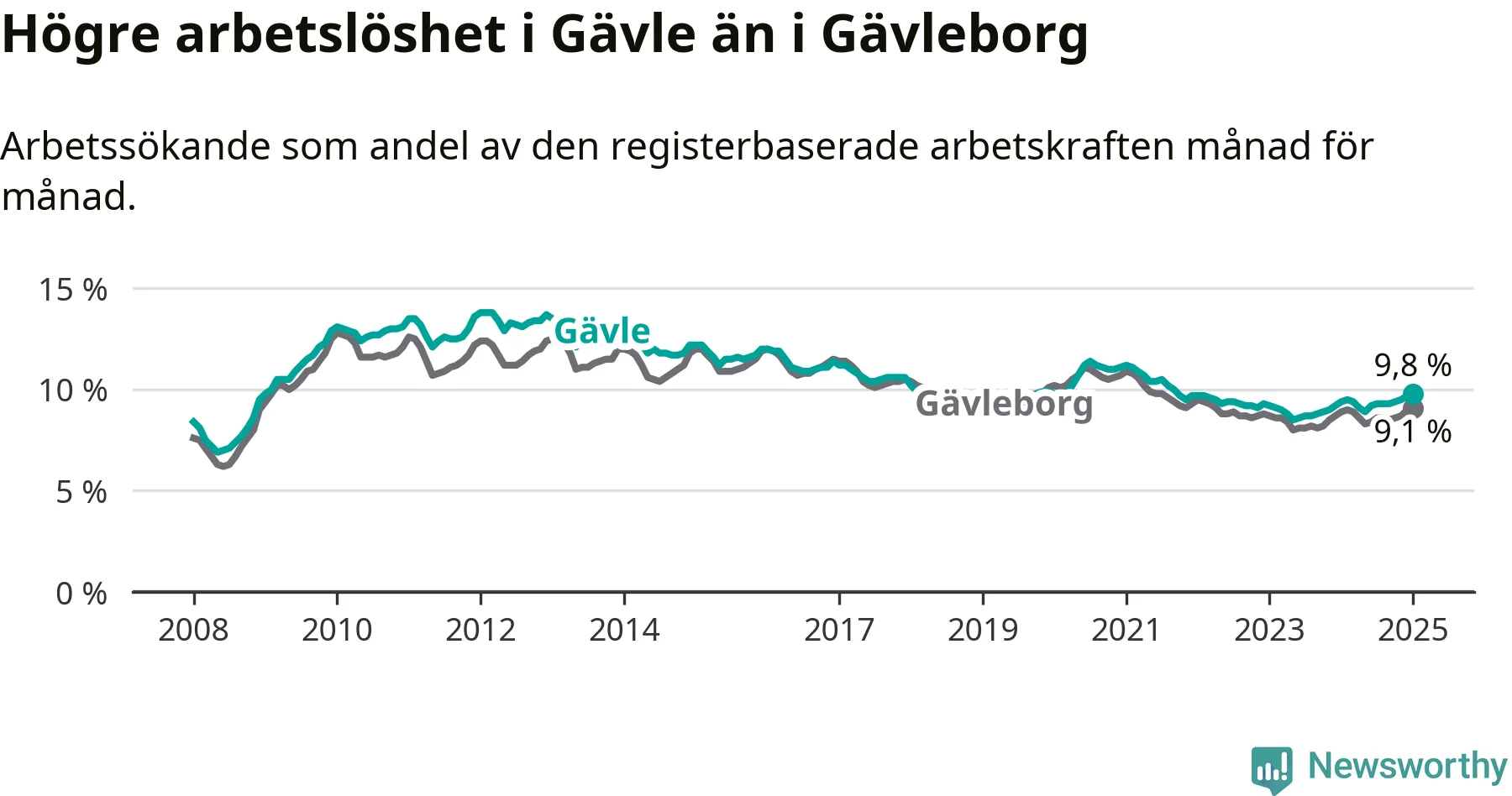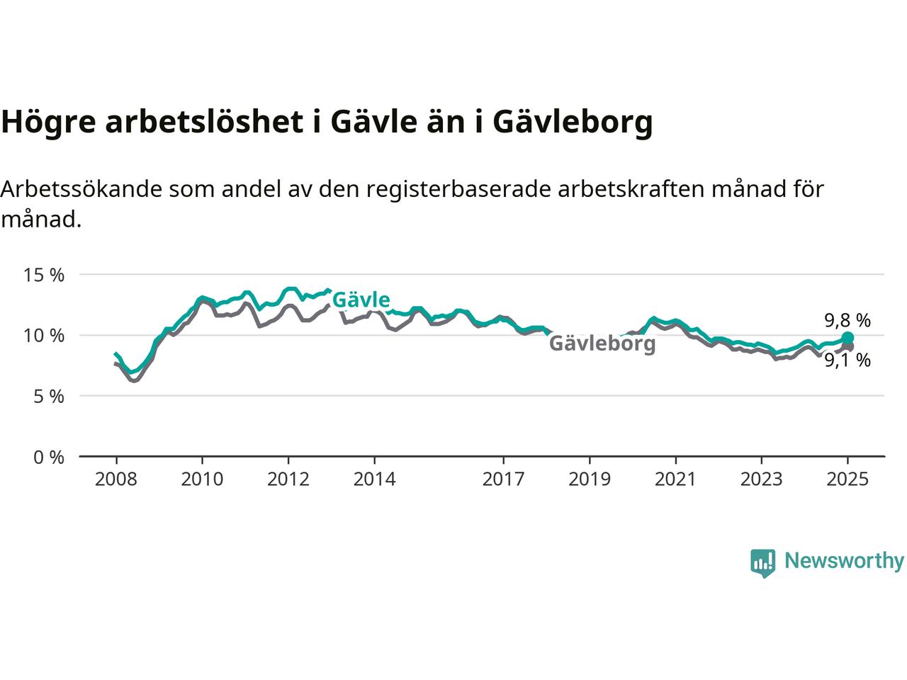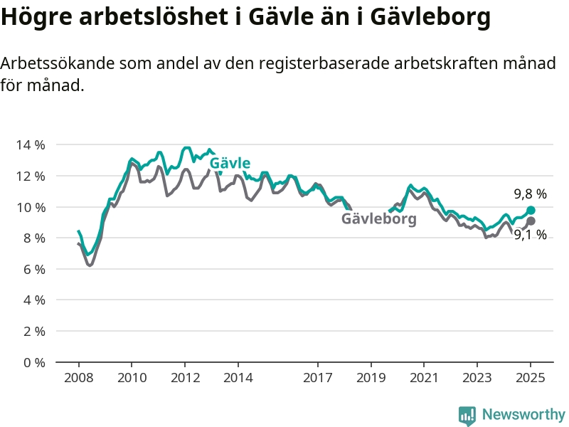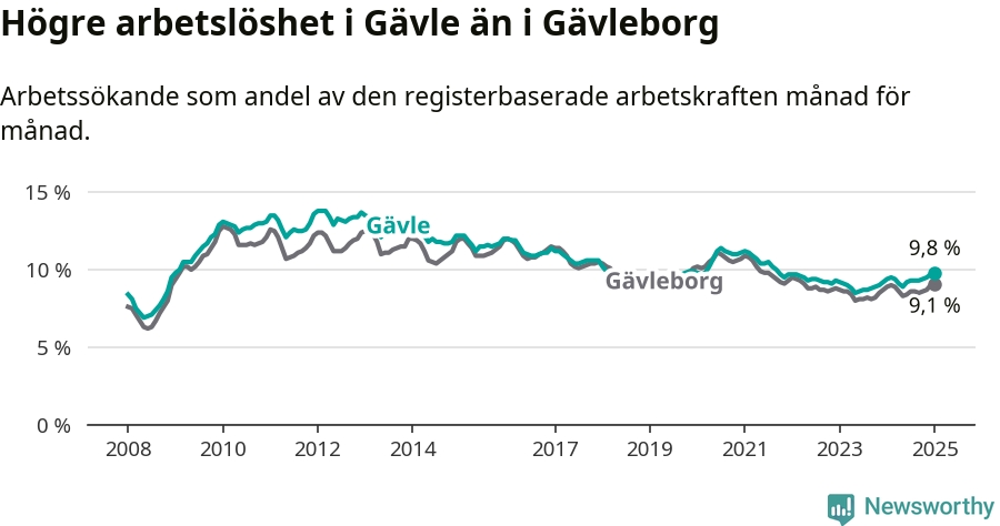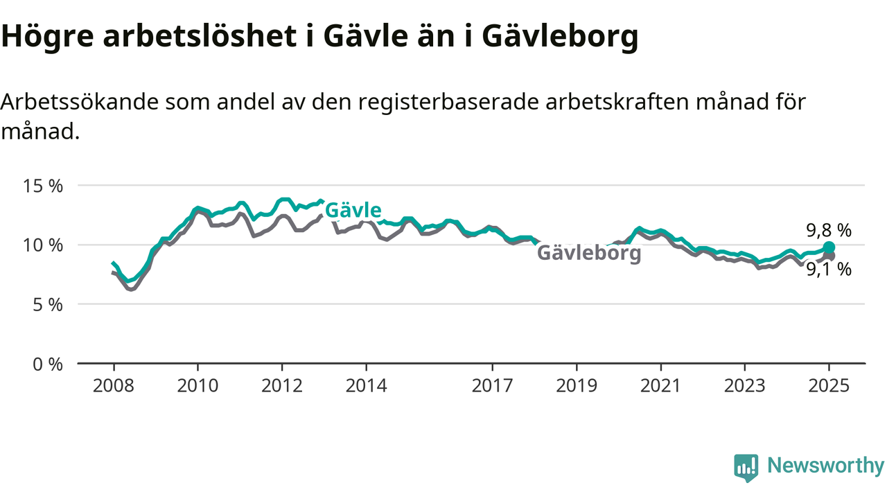 Gävle hade redan tidigare högre arbetslöshet än snittet i hela Gävleborgs län och nu växer klyftan (9,8 procent i kommunen, jämfört med 9,1 procent i hela länet). Hudiksvall och Ovanåker har den lägsta arbetslösheten i länet (6,4 procent), medan Söderhamn har den högsta (10,8 procent). För att Gävle skulle komma ner i samma arbetslöshetsnivå som Hudiksvall och Ovanåker skulle 1 783 personer behöva sysselsättas.