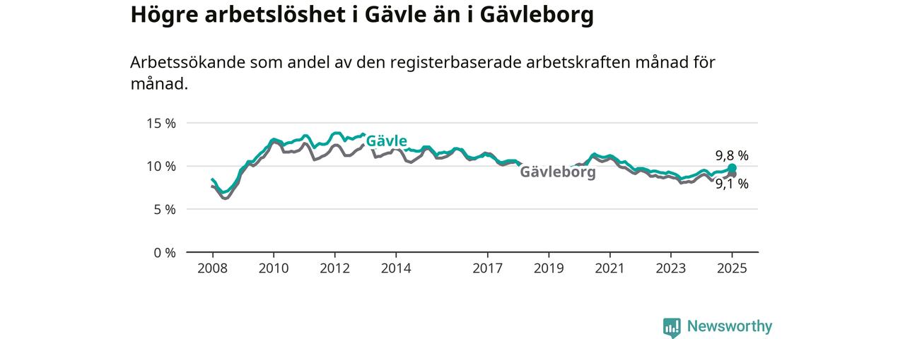 Det är 13:e månaden i följd som arbetslösheten i Gävle är högre än den var under samma tidpunkt året innan. Den nuvarande arbetslöshetsnivån är därmed den högsta sedan september 2021.