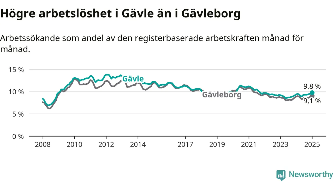 Under januari månad rapporterade Gävle kommun en total arbetslöshet på 9,8 procent. Det är en ökning jämfört med samma tidpunkt i fjol (+0,4 procentenheter). Även i Gävleborgs län stiger arbetslösheten .