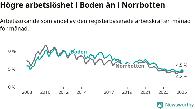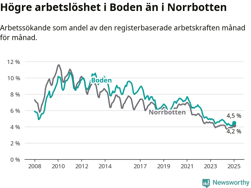 Även om arbetslösheten i Boden alltså minskar, så ligger den fortfarande över snittet i hela Norrbottens län (4,5 procent i kommunen, jämfört med 4,2 procent i hela länet). Gällivare har den lägsta arbetslösheten i länet (2,3 procent), medan Haparanda har den högsta (6,8 procent). För att Boden skulle komma ner i samma arbetslöshetsnivå som Gällivare skulle 299 personer behöva sysselsättas.