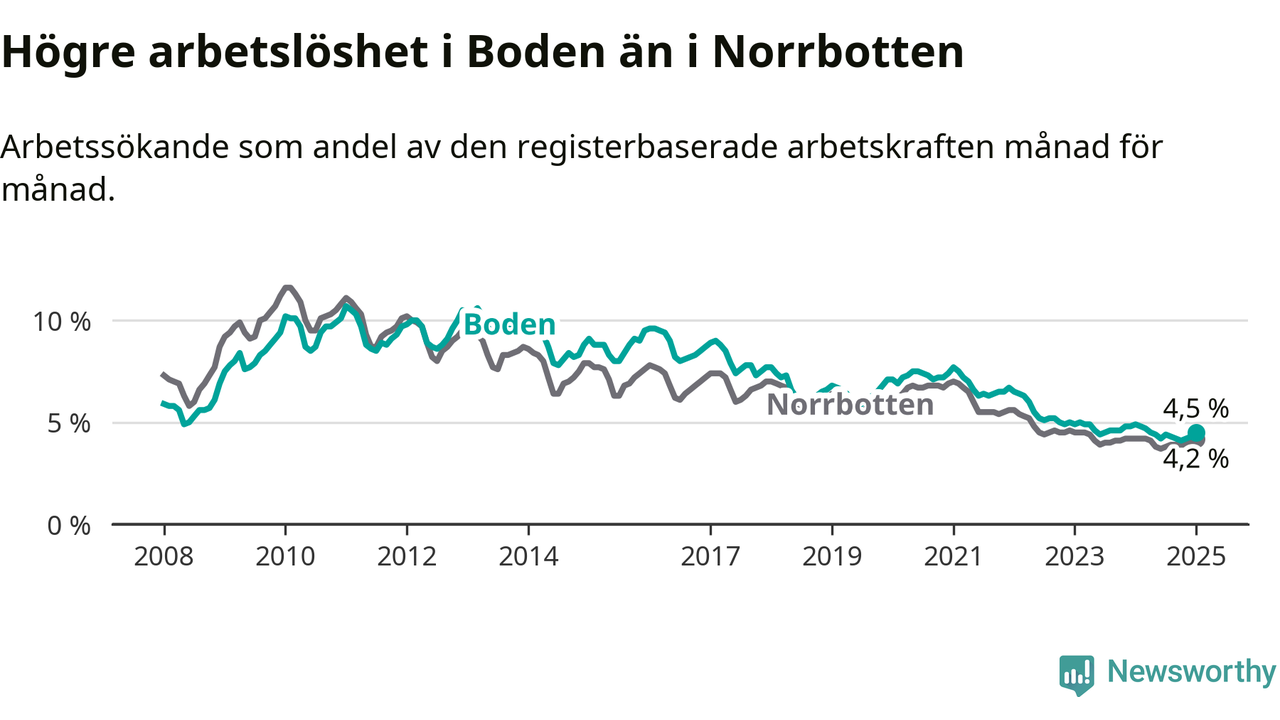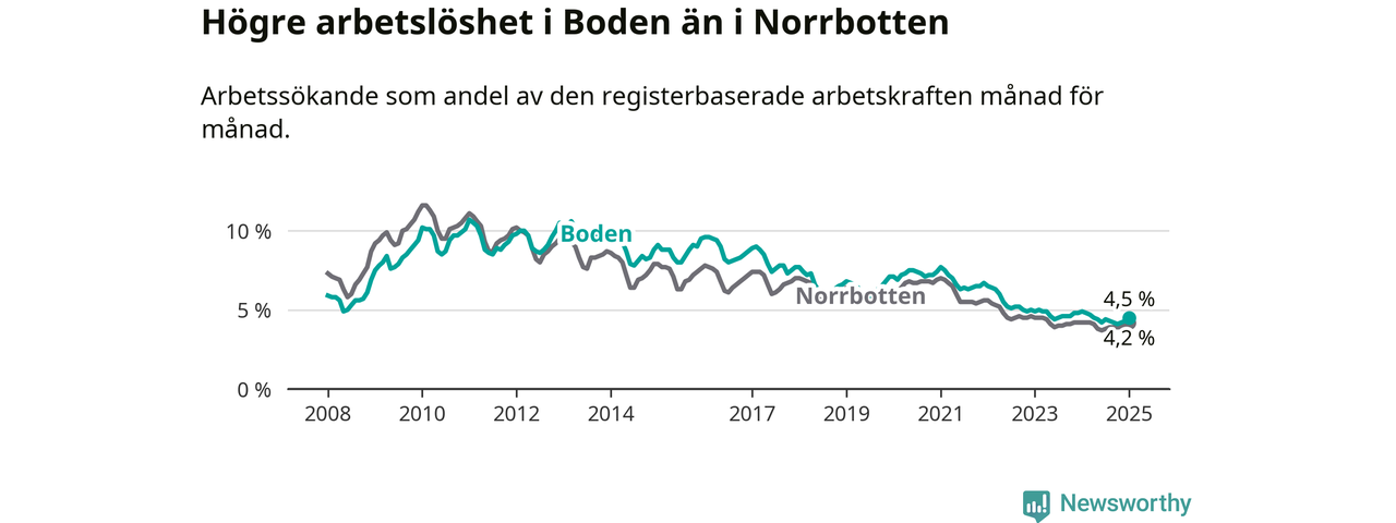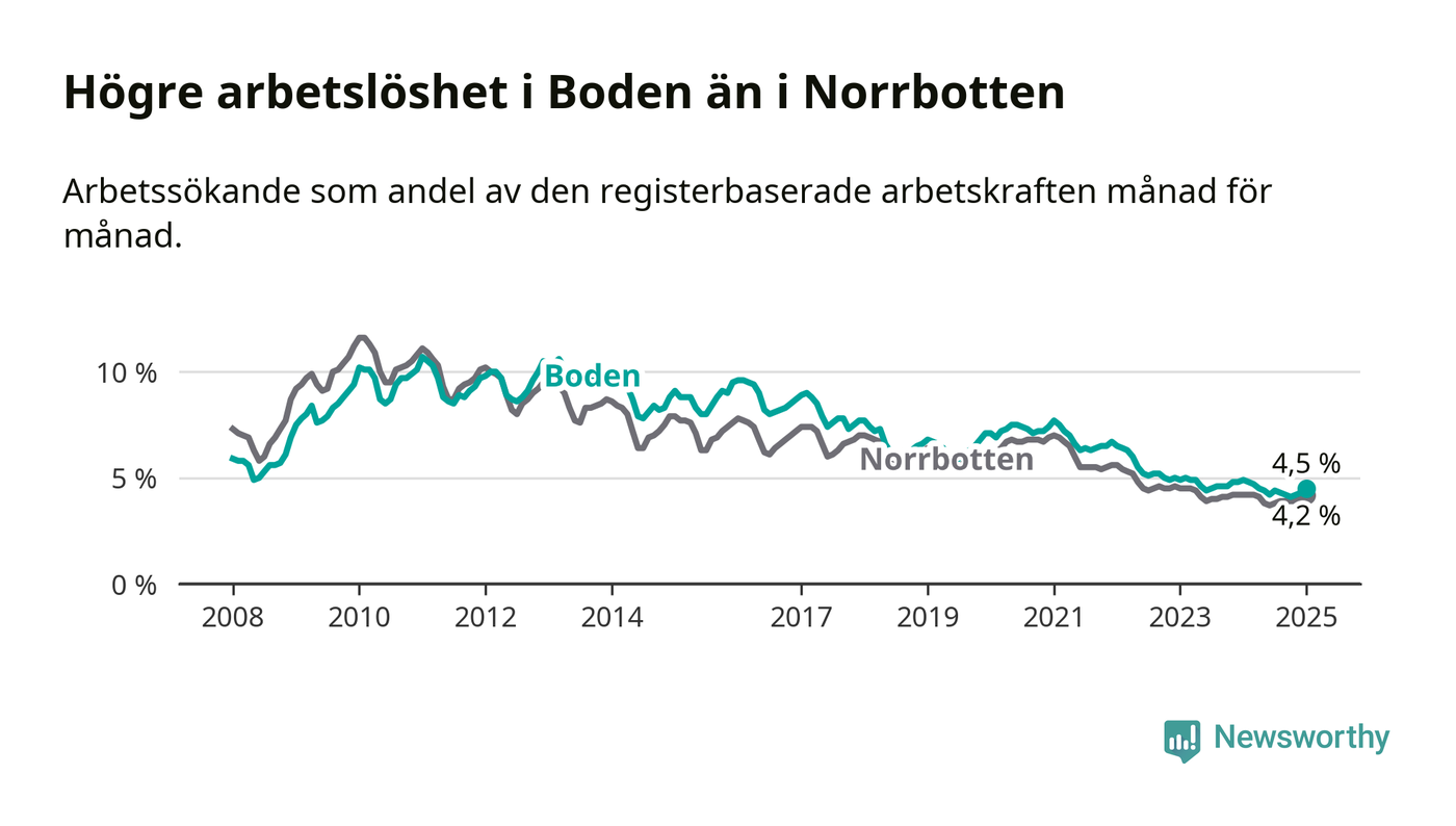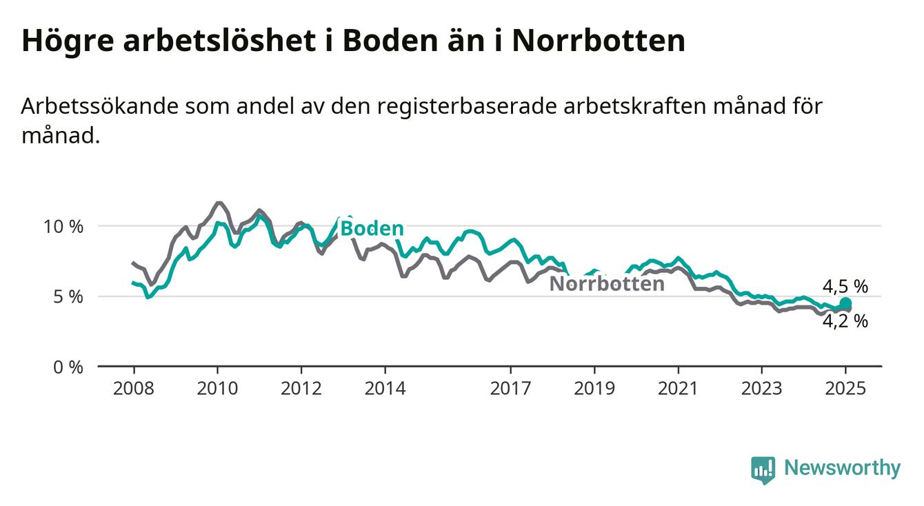 Under januari månad rapporterade Bodens kommun en total arbetslöshet på 4,5 procent. Det är en minskning jämfört med samma tidpunkt i fjol (−0,4 procentenheter). I Norrbottens län däremot står arbetslösheten stilla.