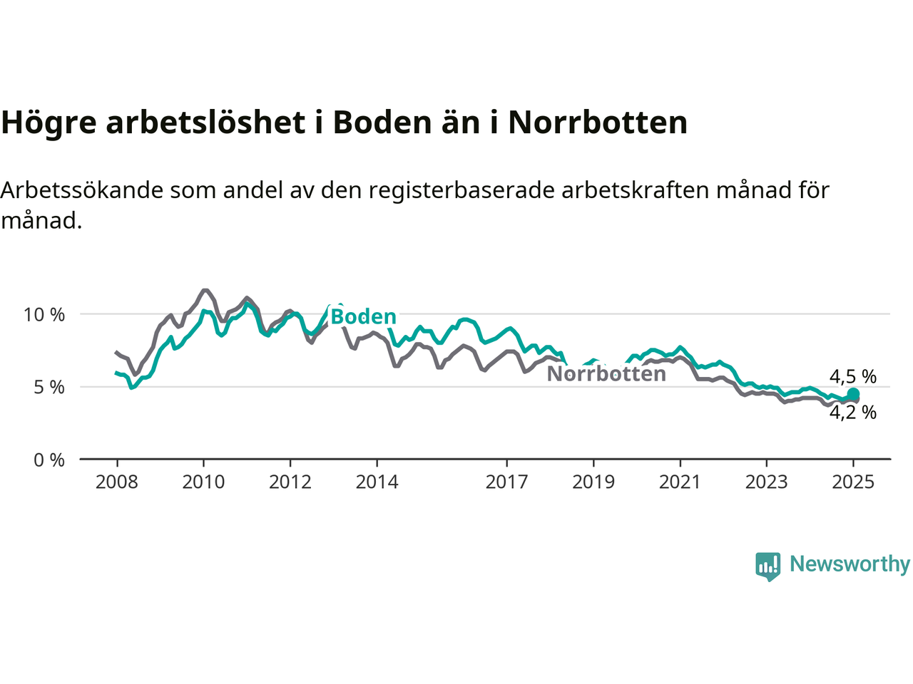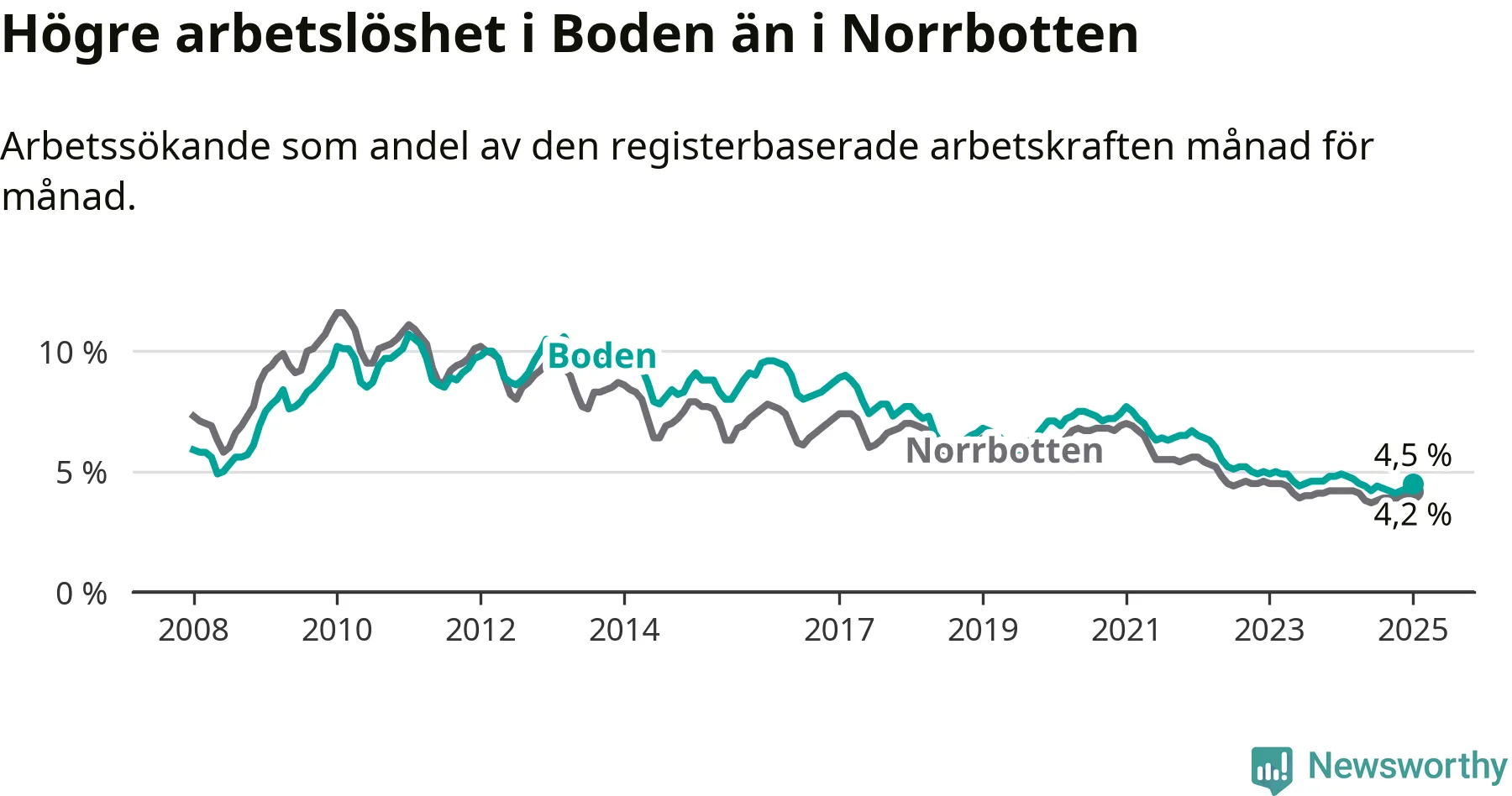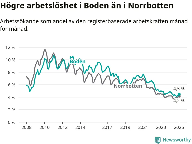 Under januari månad rapporterade Bodens kommun en total arbetslöshet på 4,5 procent. Det är en minskning jämfört med samma tidpunkt i fjol (−0,4 procentenheter). I Norrbottens län däremot står arbetslösheten stilla.