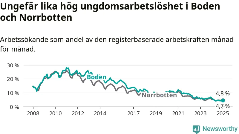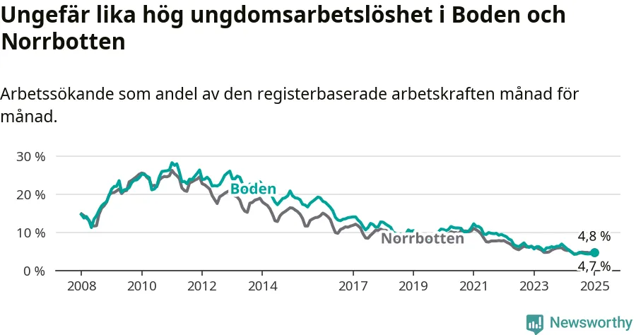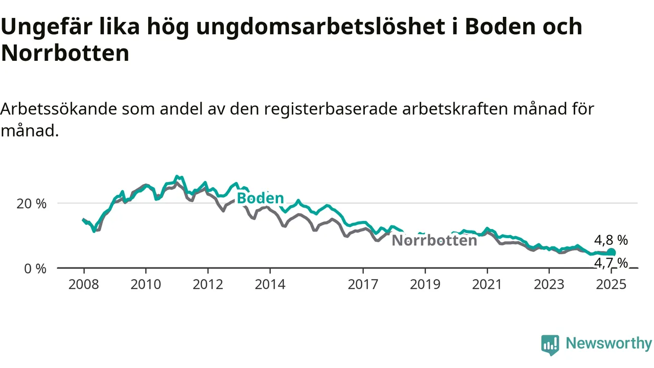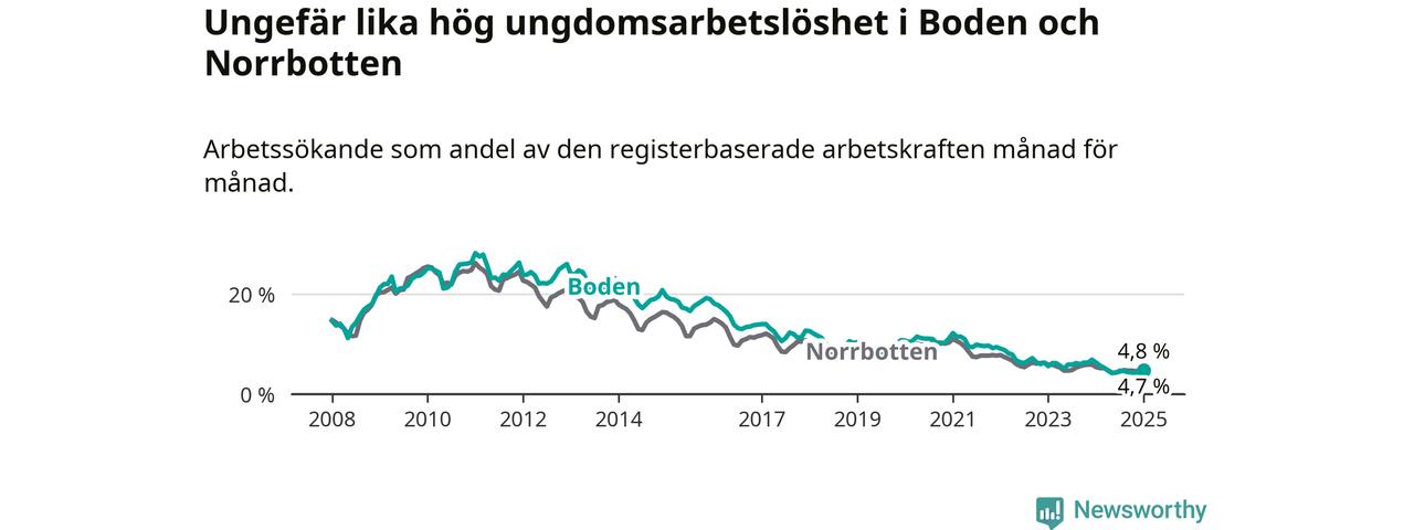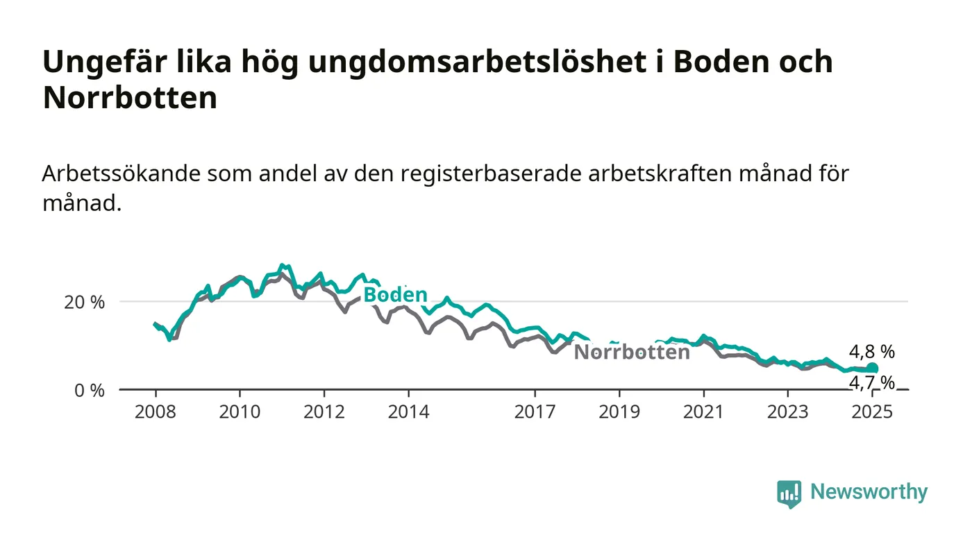 Medan Boden har högre total arbetslöshet än Norrbotten, ligger ungdomsarbetslösheten på i stort sett samma nivå.