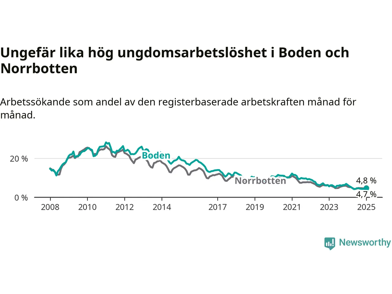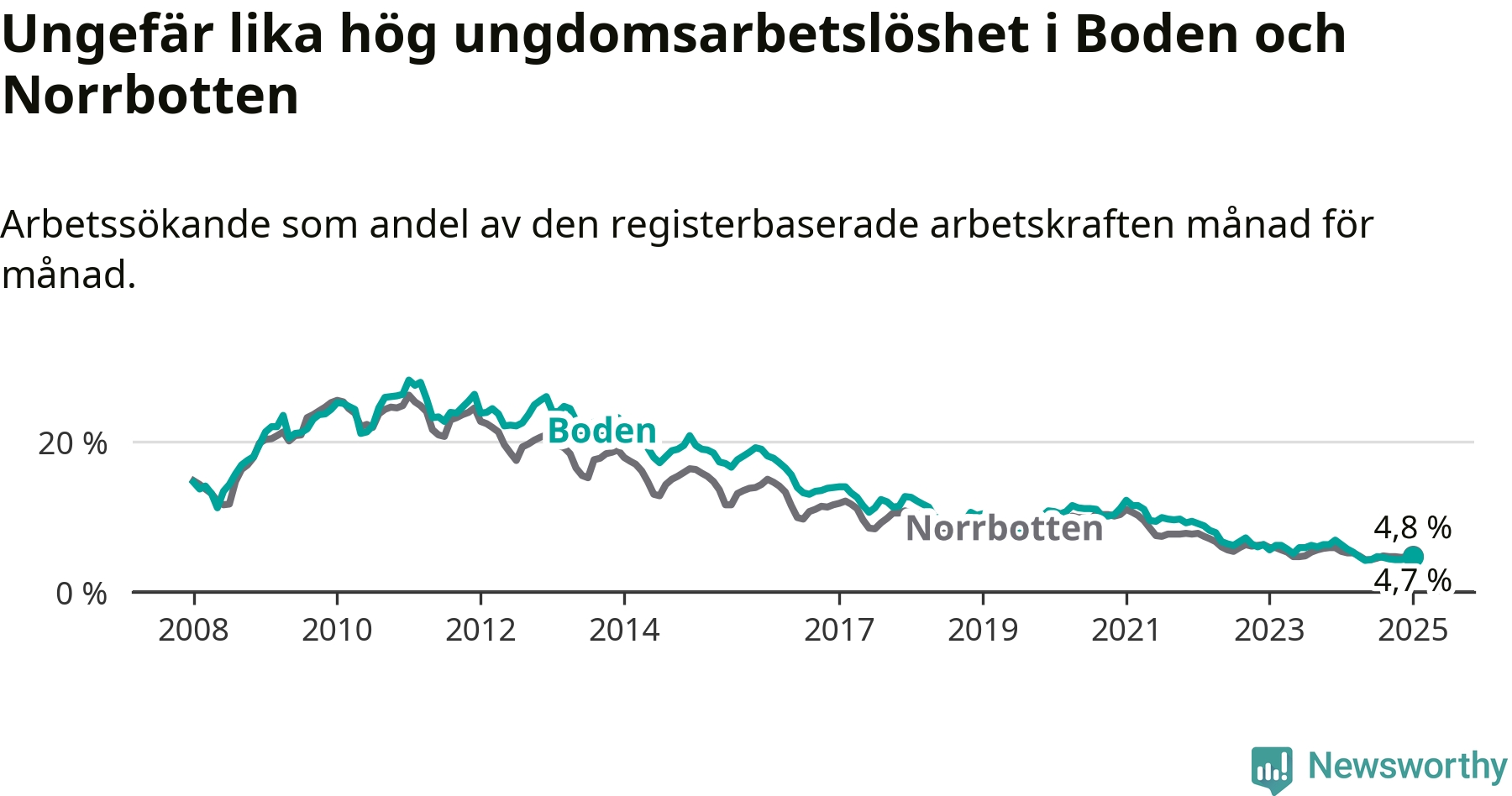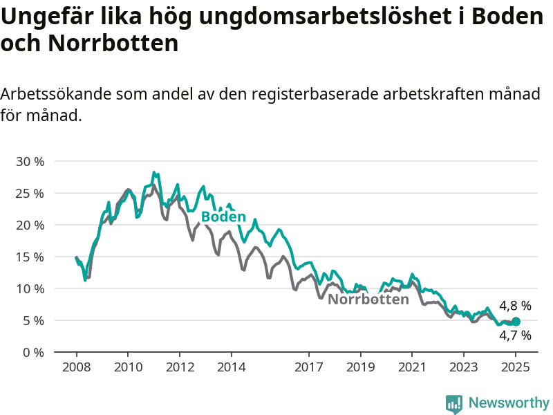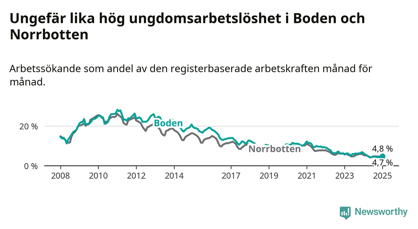 Medan Boden har högre total arbetslöshet än Norrbotten, ligger ungdomsarbetslösheten på i stort sett samma nivå.