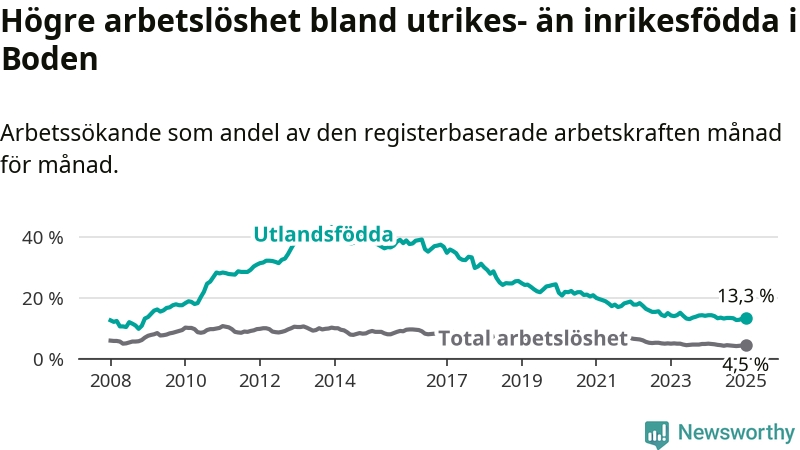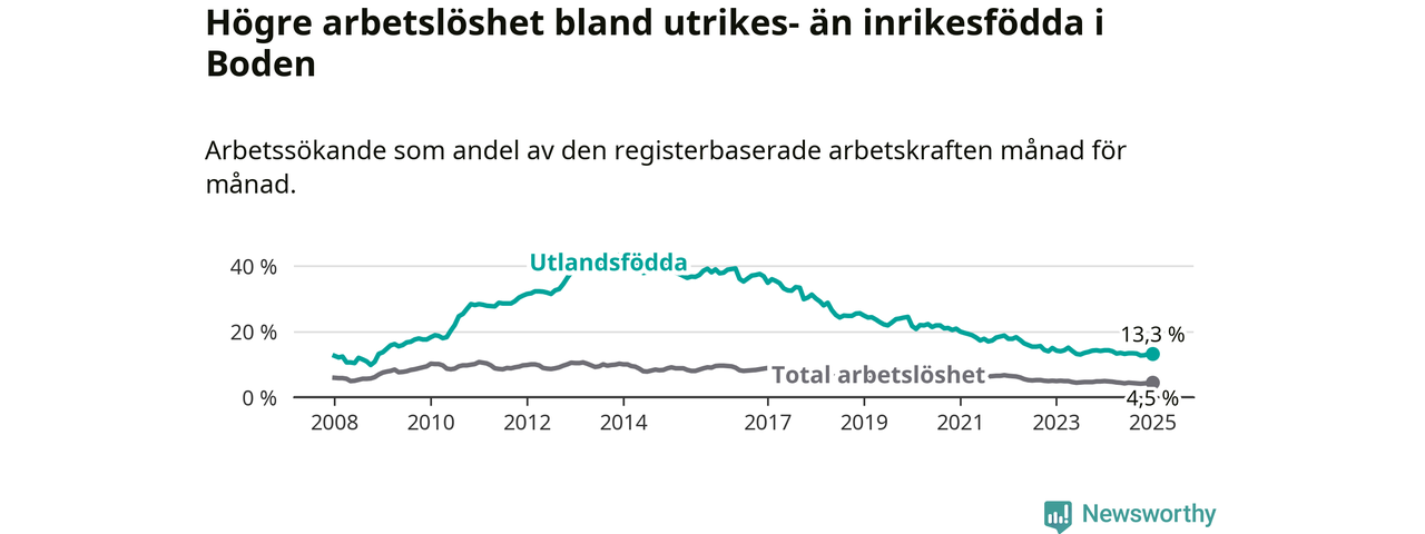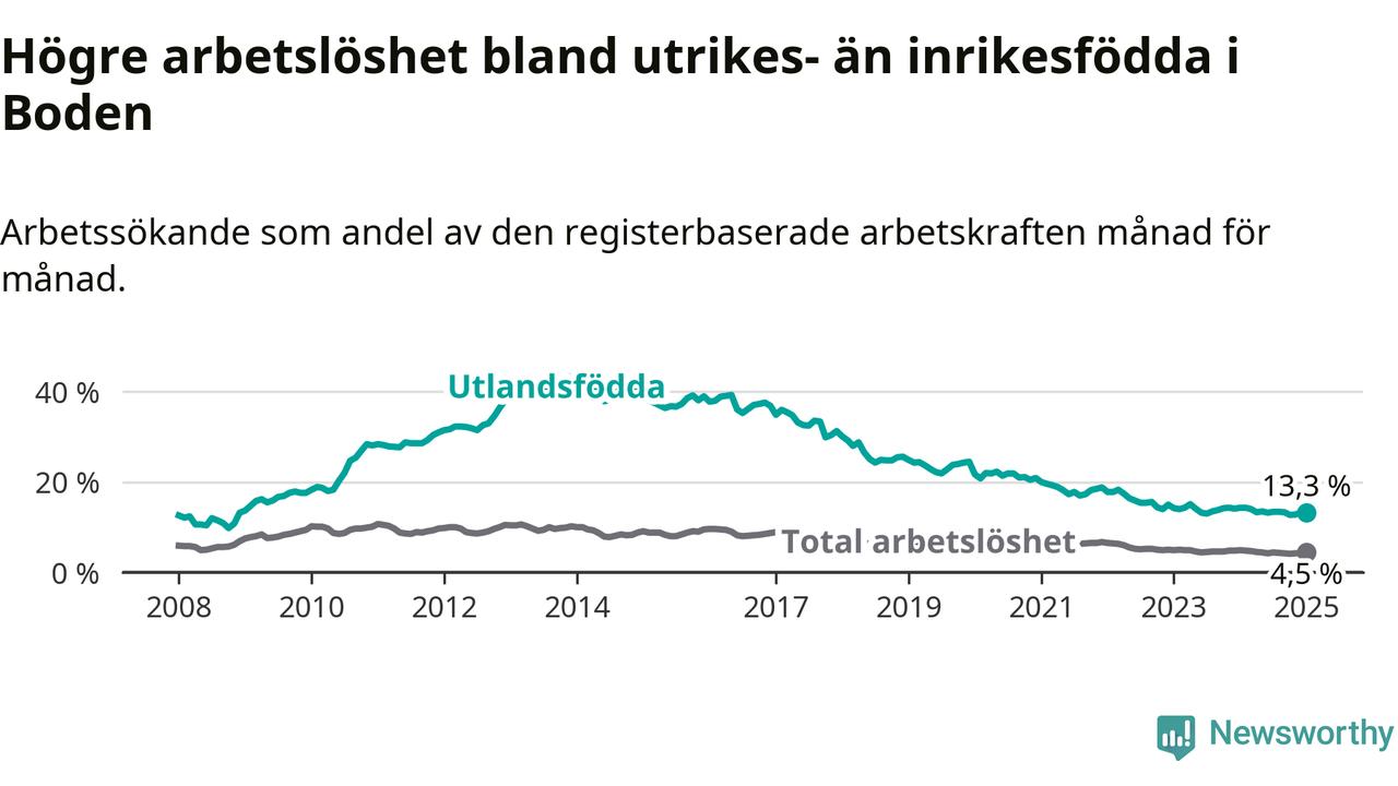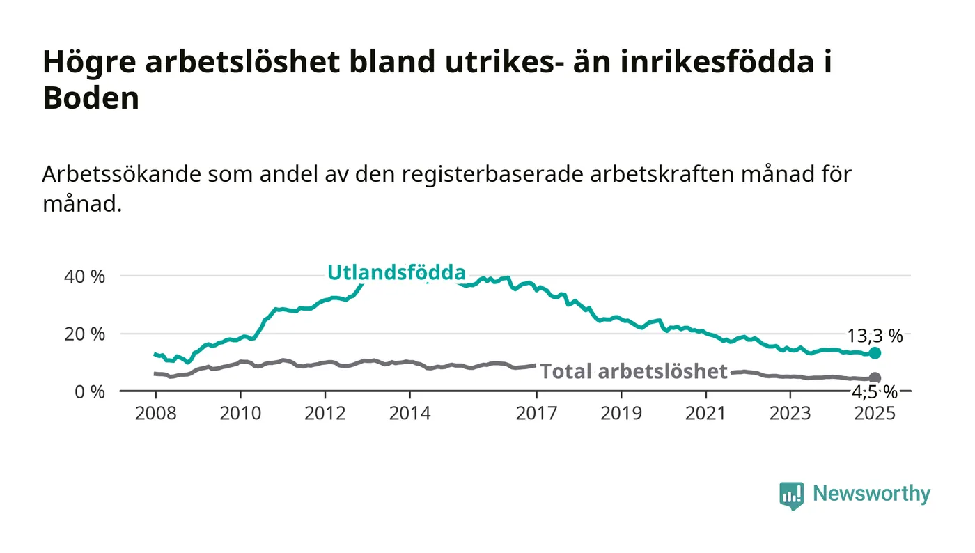 Skillnaden i arbetslöshet mellan utrikesfödda och hela befolkningen är 8,8 procentenheter i Boden. Det är en mindre skillnad än för ett år sedan (−0,6 procentenheter).