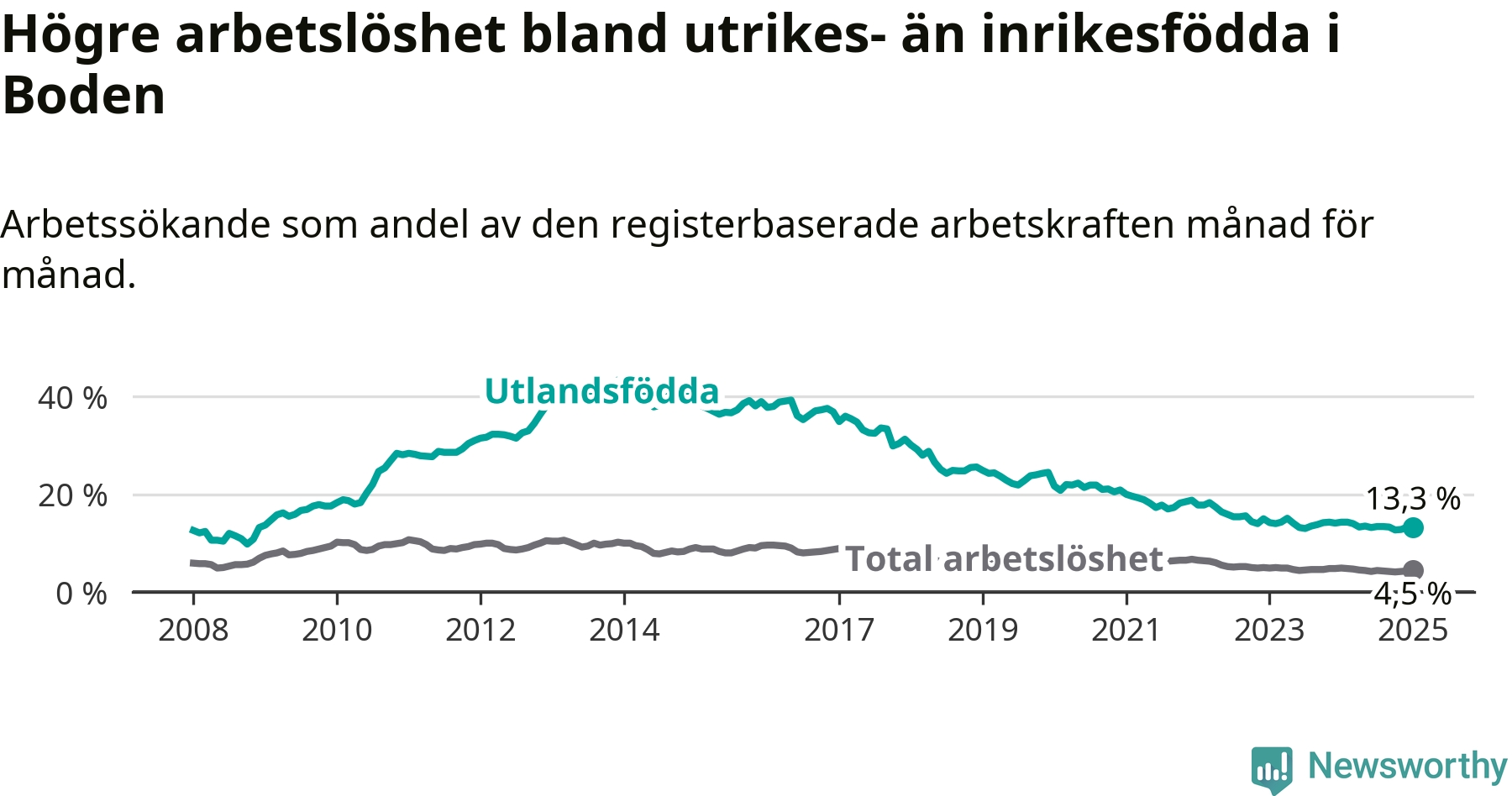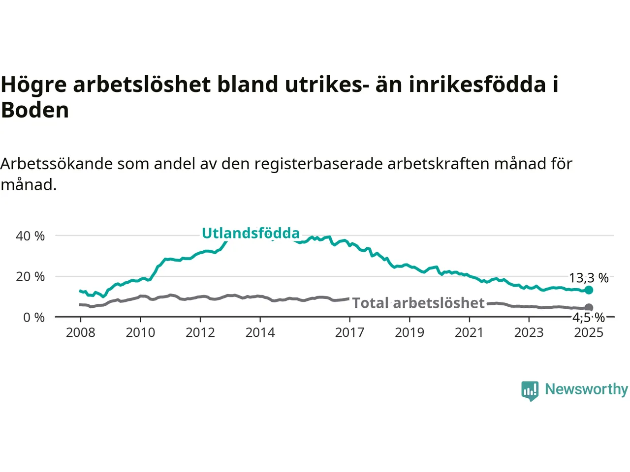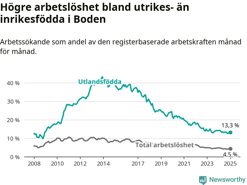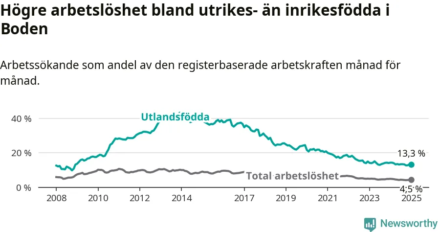 Skillnaden i arbetslöshet mellan utrikesfödda och hela befolkningen är 8,8 procentenheter i Boden. Det är en mindre skillnad än för ett år sedan (−0,6 procentenheter).