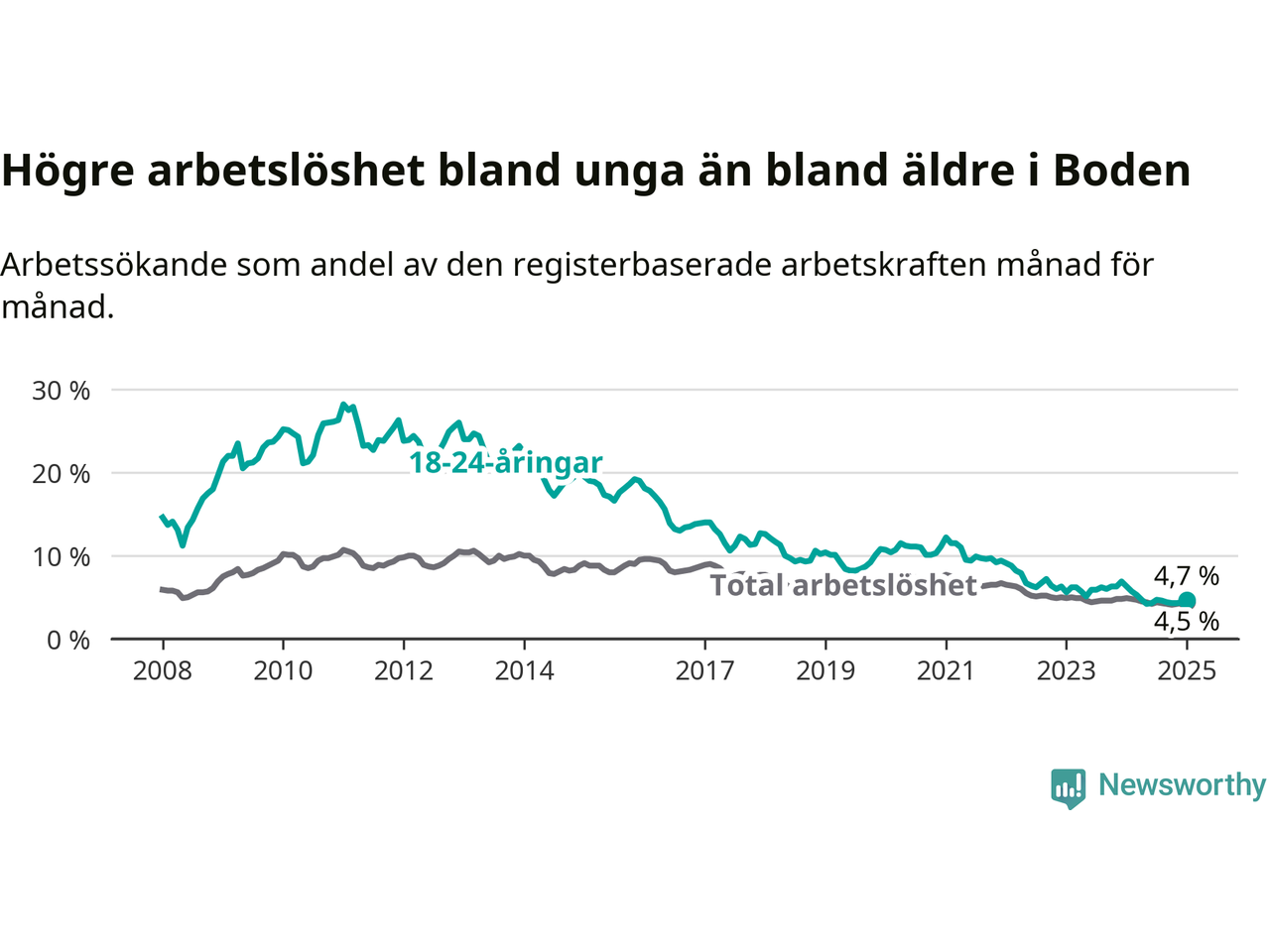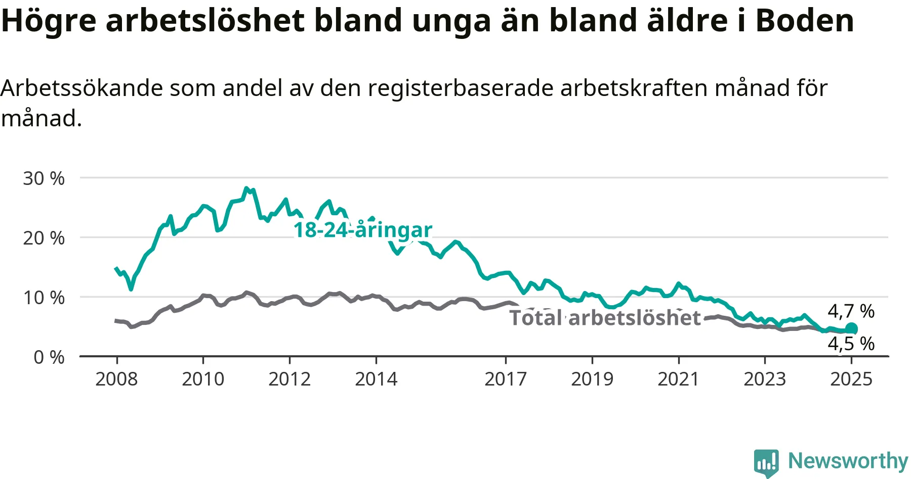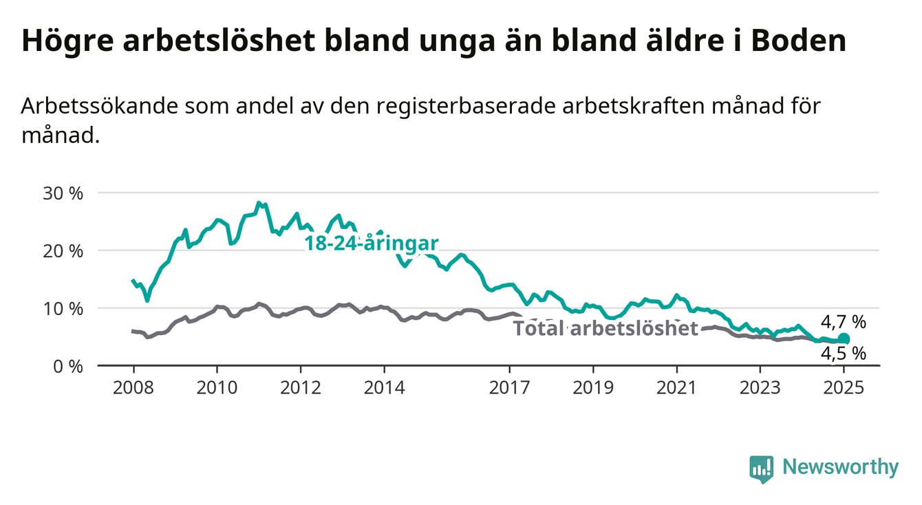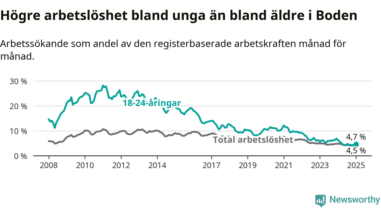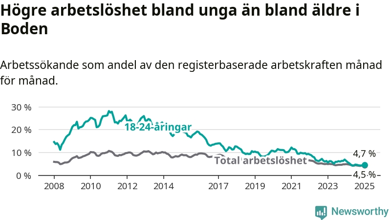 I och med den senaste månadens nedgång har de ungas arbetslöshet i Boden sjunkit tolv månader i följd (ner från 6,3 procent i januari 2024 till 4,7 procent nu).