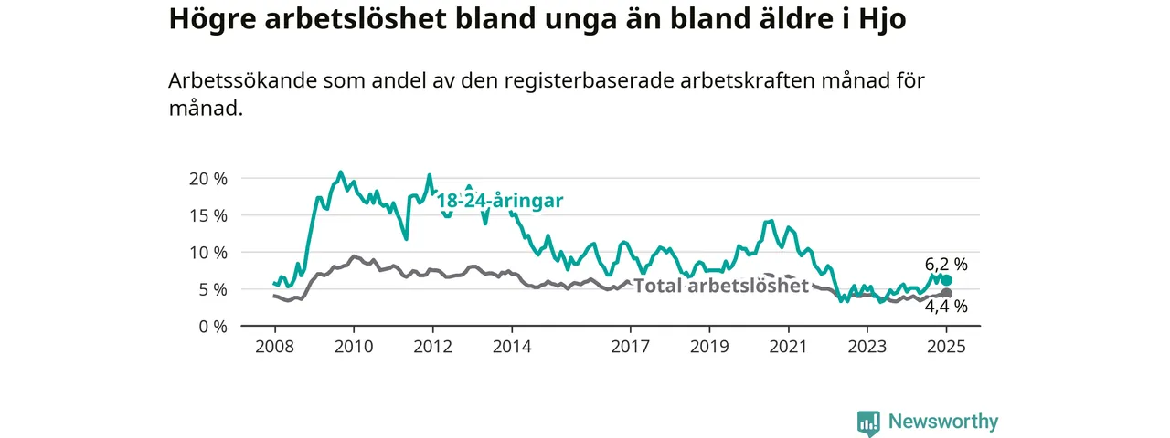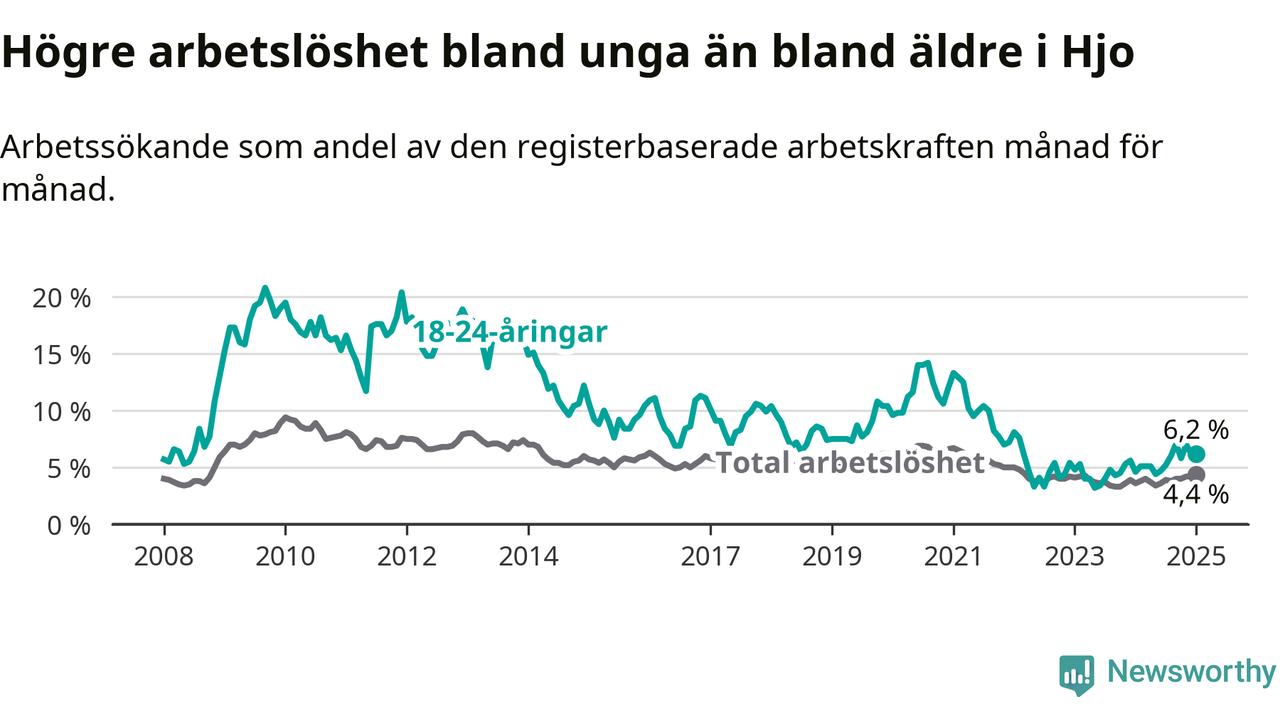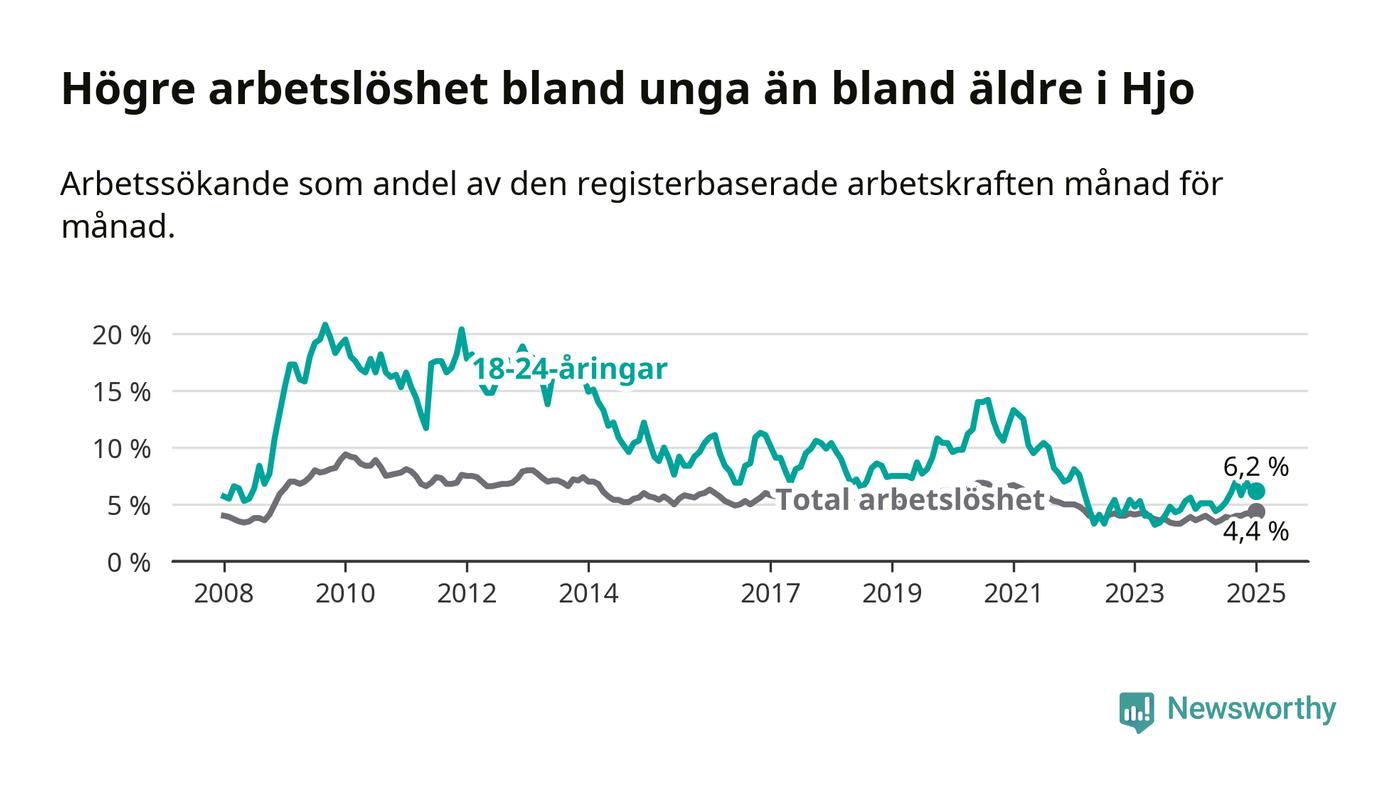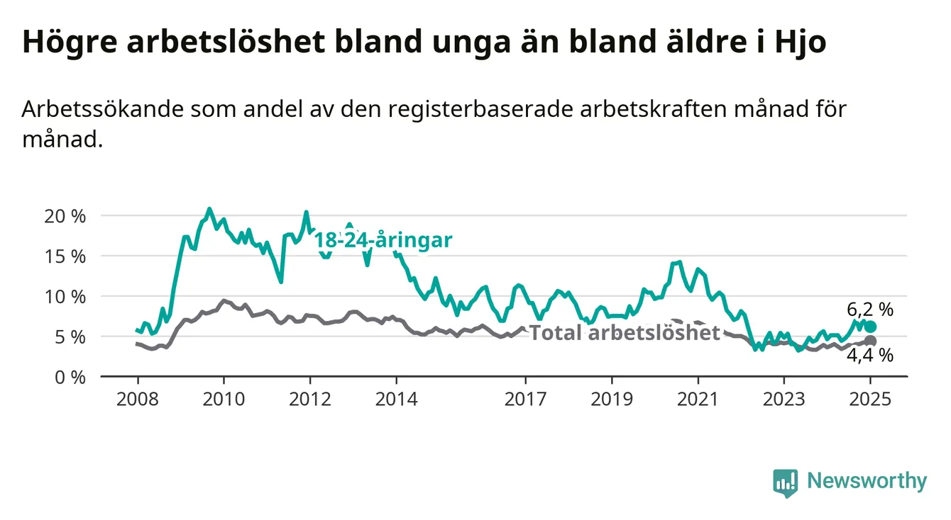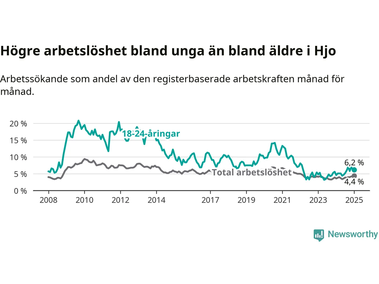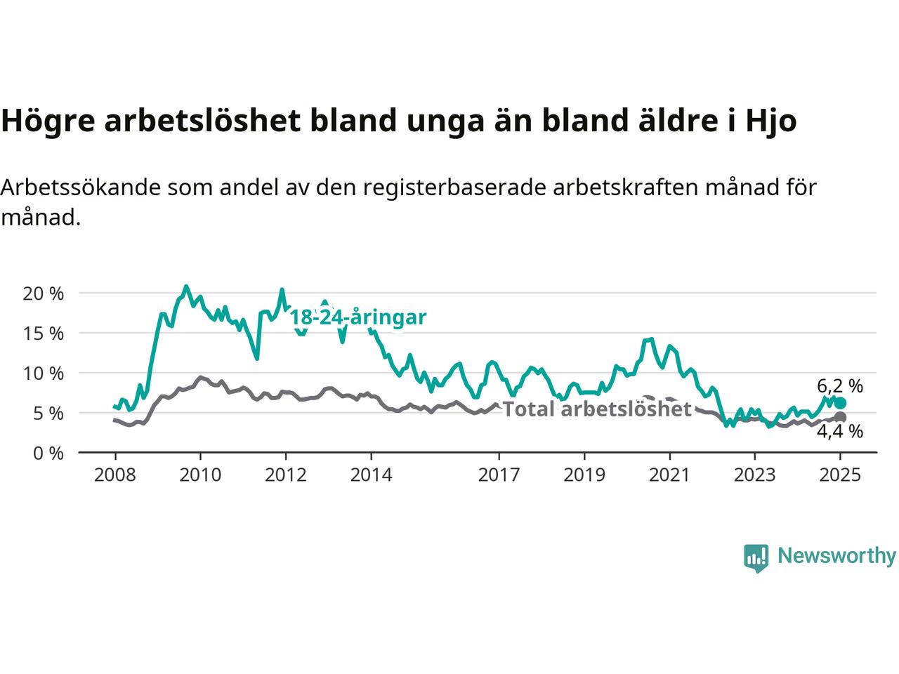 I och med den senaste månadens uppgång har de ungas arbetslöshet i Hjo stigit elva månader i följd (upp från 5,1 procent i februari 2024 till 6,2 procent nu).