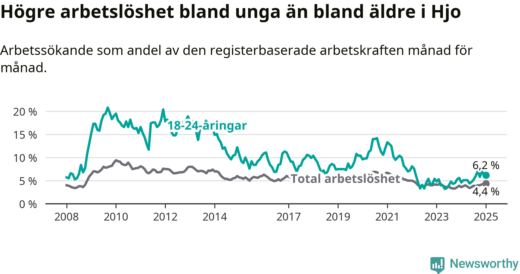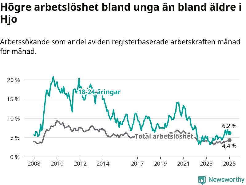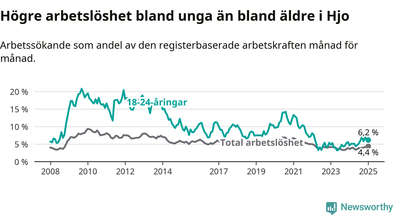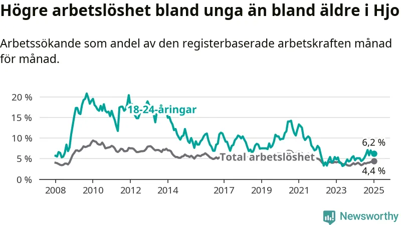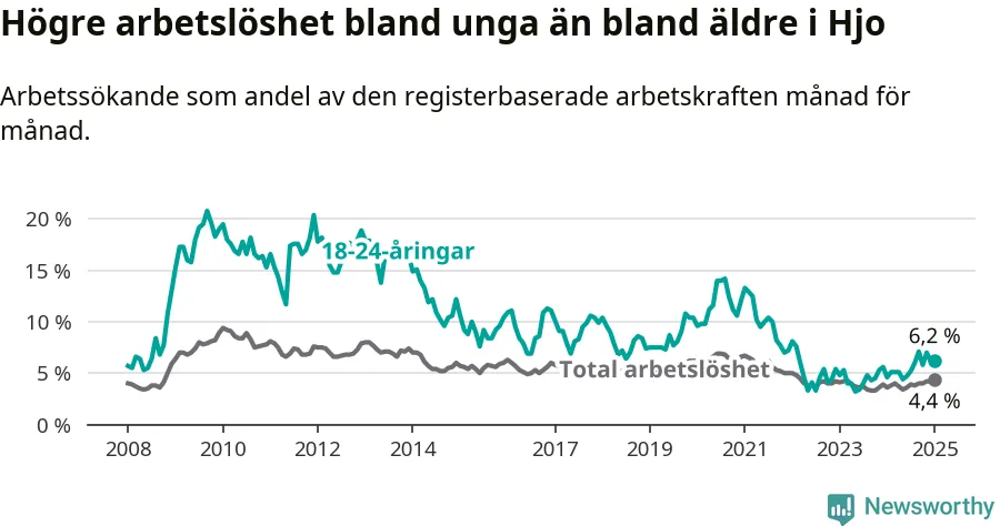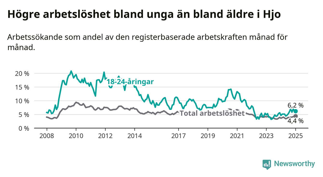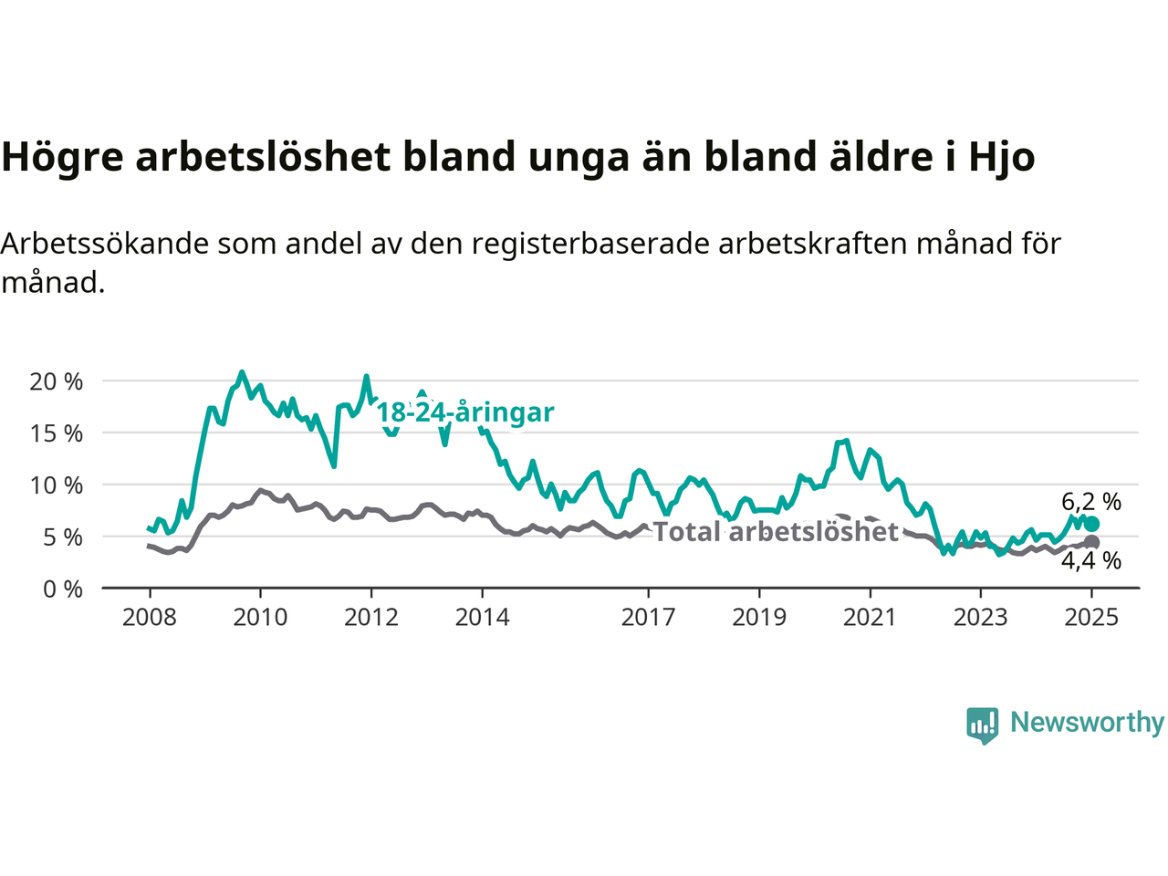 I och med den senaste månadens uppgång har de ungas arbetslöshet i Hjo stigit elva månader i följd (upp från 5,1 procent i februari 2024 till 6,2 procent nu).