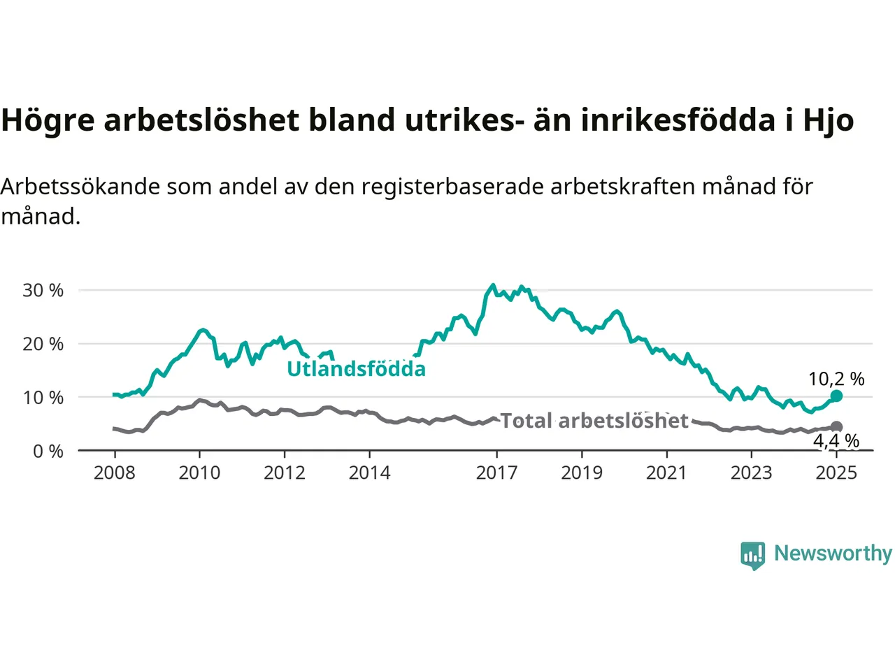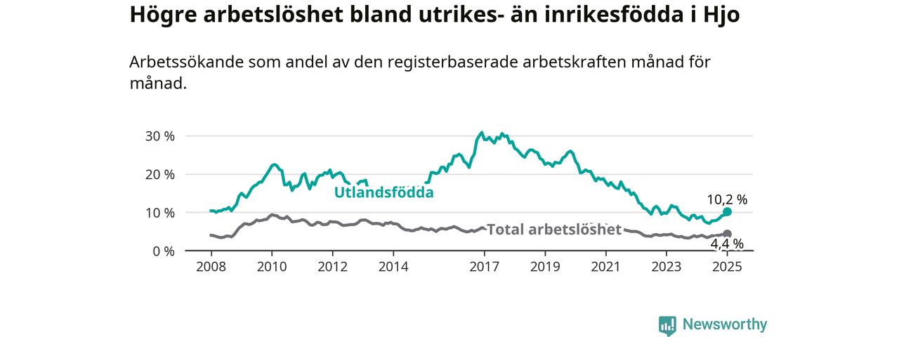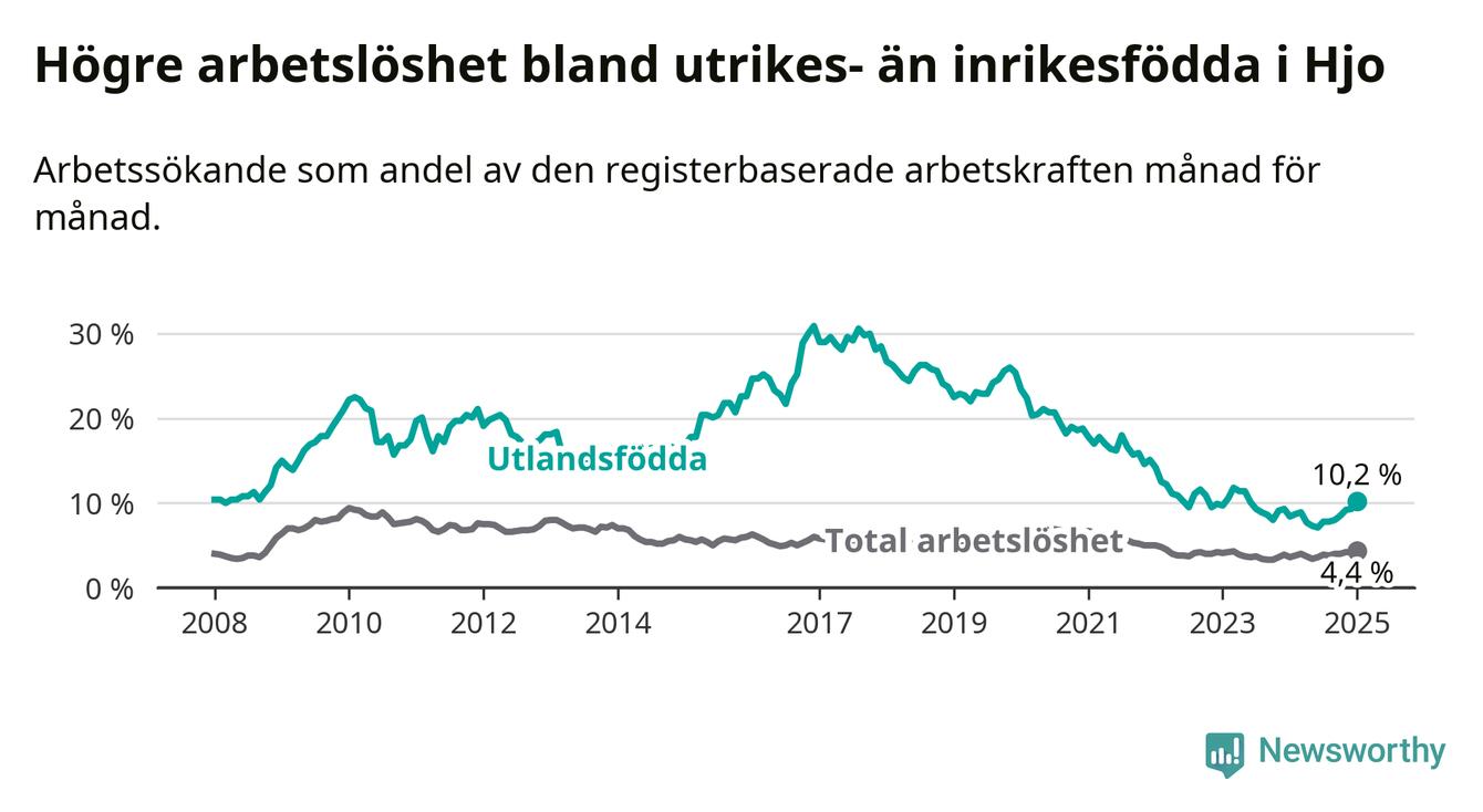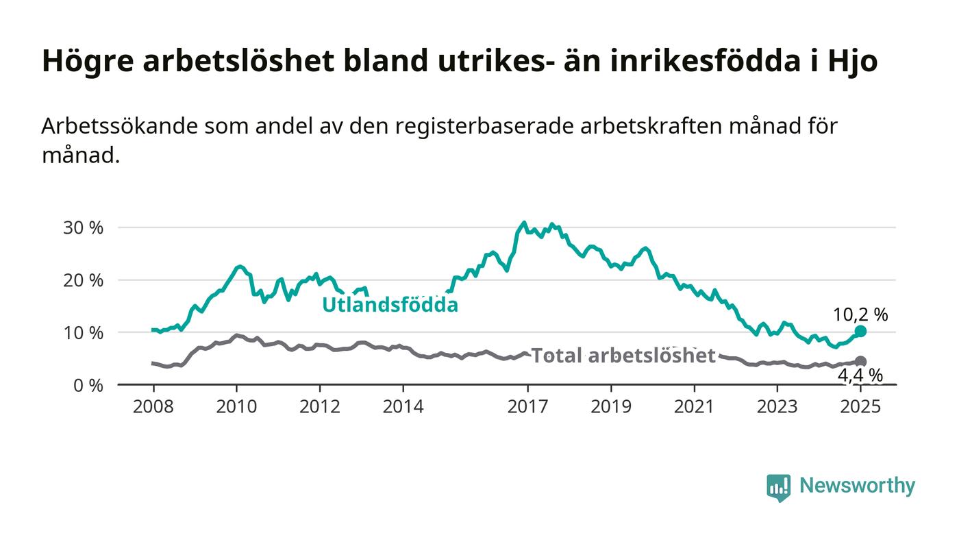 Arbetslösheten bland utlandsfödda var 10,2 procent i Hjo under januari månad, motsvarande 44 av 431 personer. Det är 1,8 procentenheter fler än vid samma tidpunkt i fjol (+36 om man räknar personer). Den senaste månadens uppgång innebär ett trendbrott. Under de ett föregående månaderna hade arbetslösheten bland utlandsfödda varit lägre än motsvarande tidpunkt året innan.