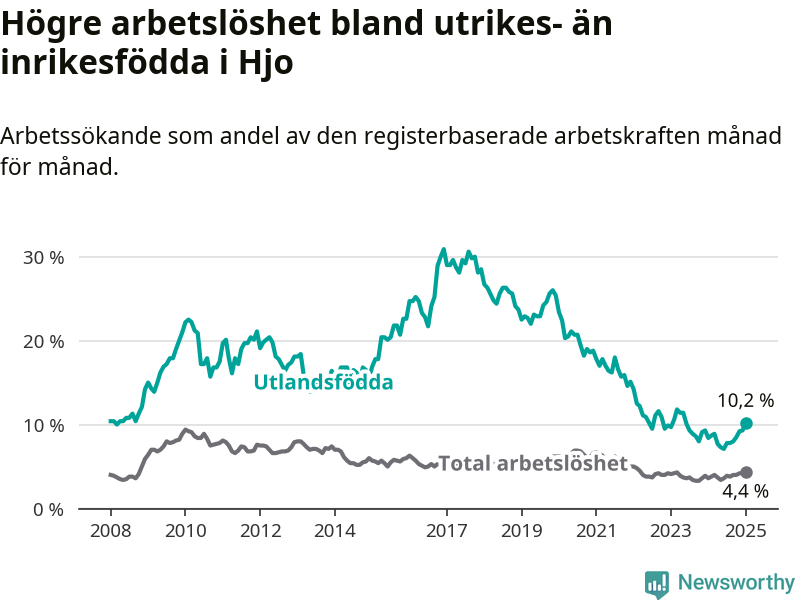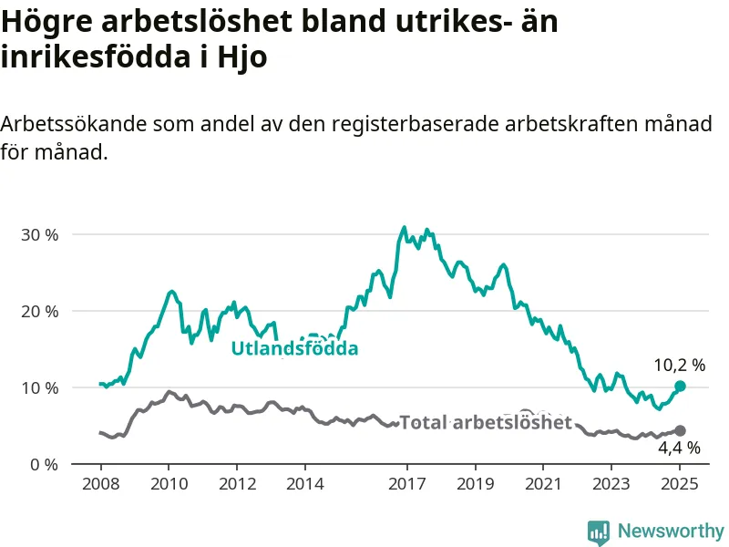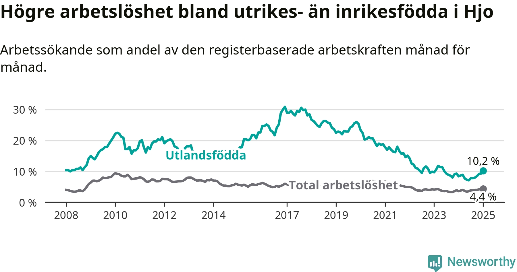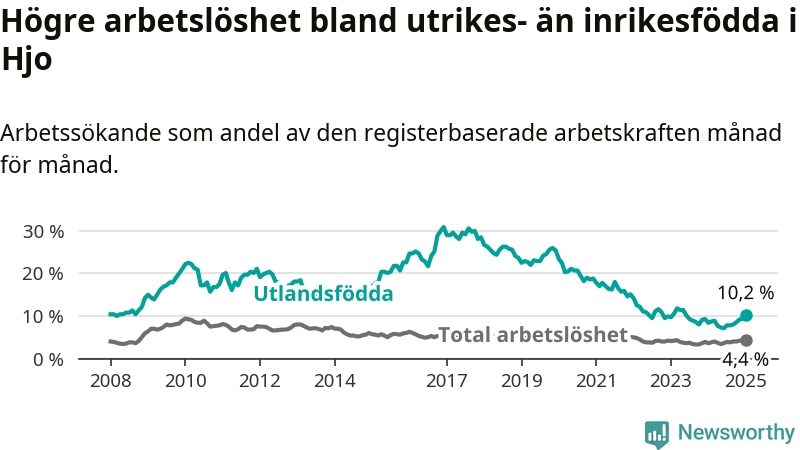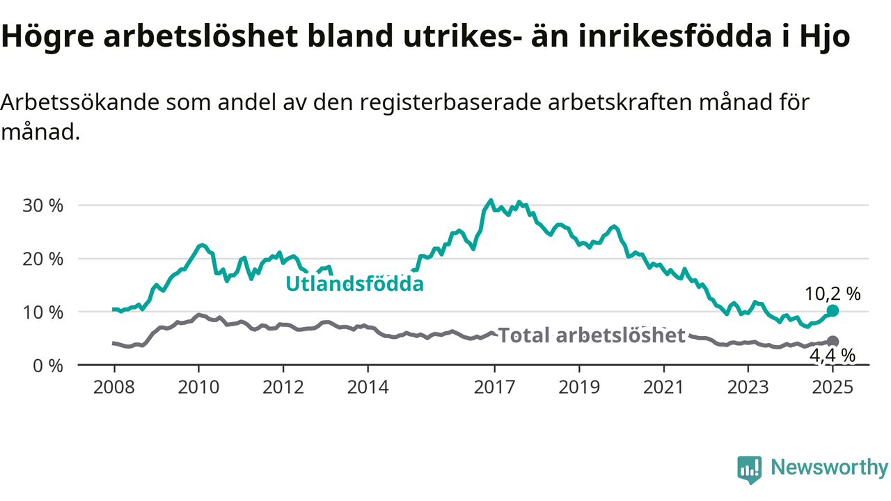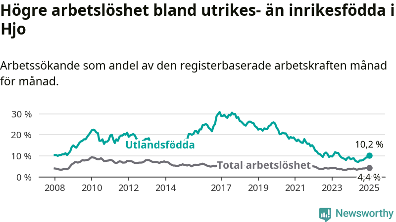 Arbetslösheten bland utlandsfödda var 10,2 procent i Hjo under januari månad, motsvarande 44 av 431 personer. Det är 1,8 procentenheter fler än vid samma tidpunkt i fjol (+36 om man räknar personer). Den senaste månadens uppgång innebär ett trendbrott. Under de ett föregående månaderna hade arbetslösheten bland utlandsfödda varit lägre än motsvarande tidpunkt året innan.