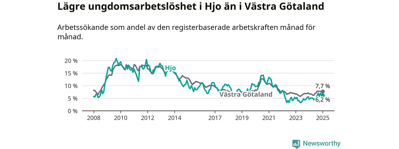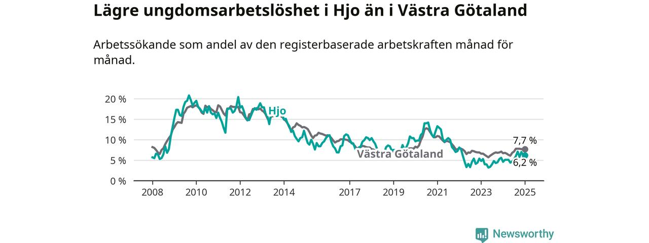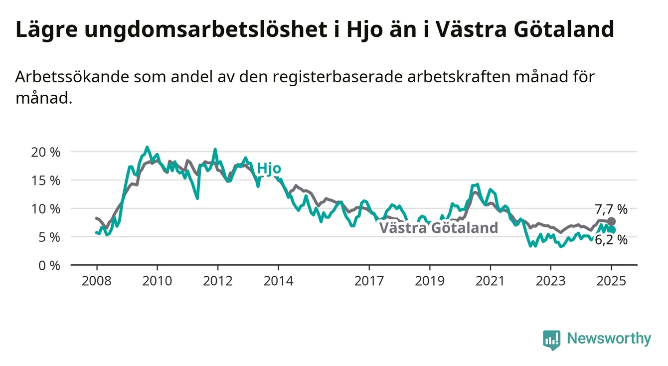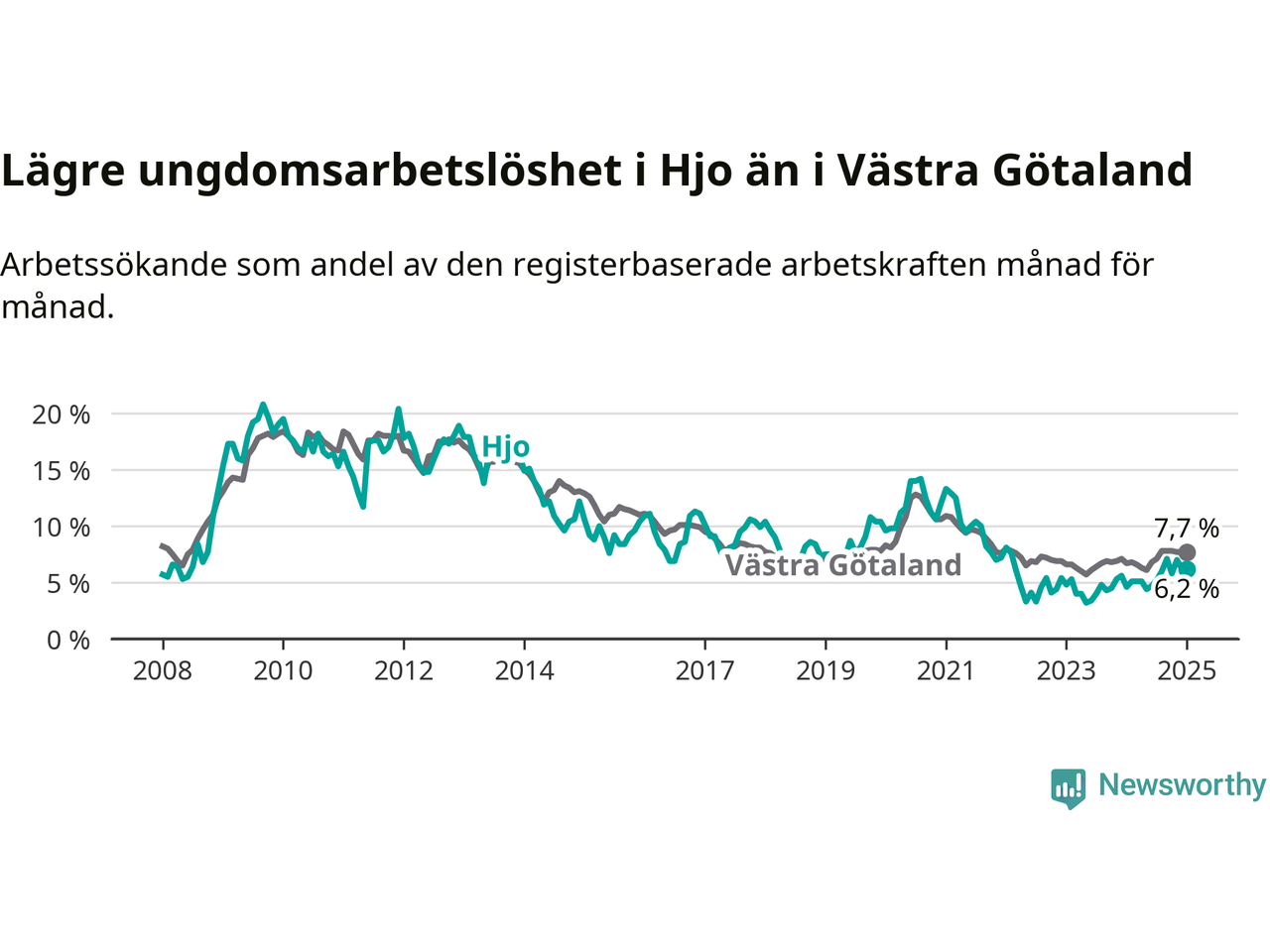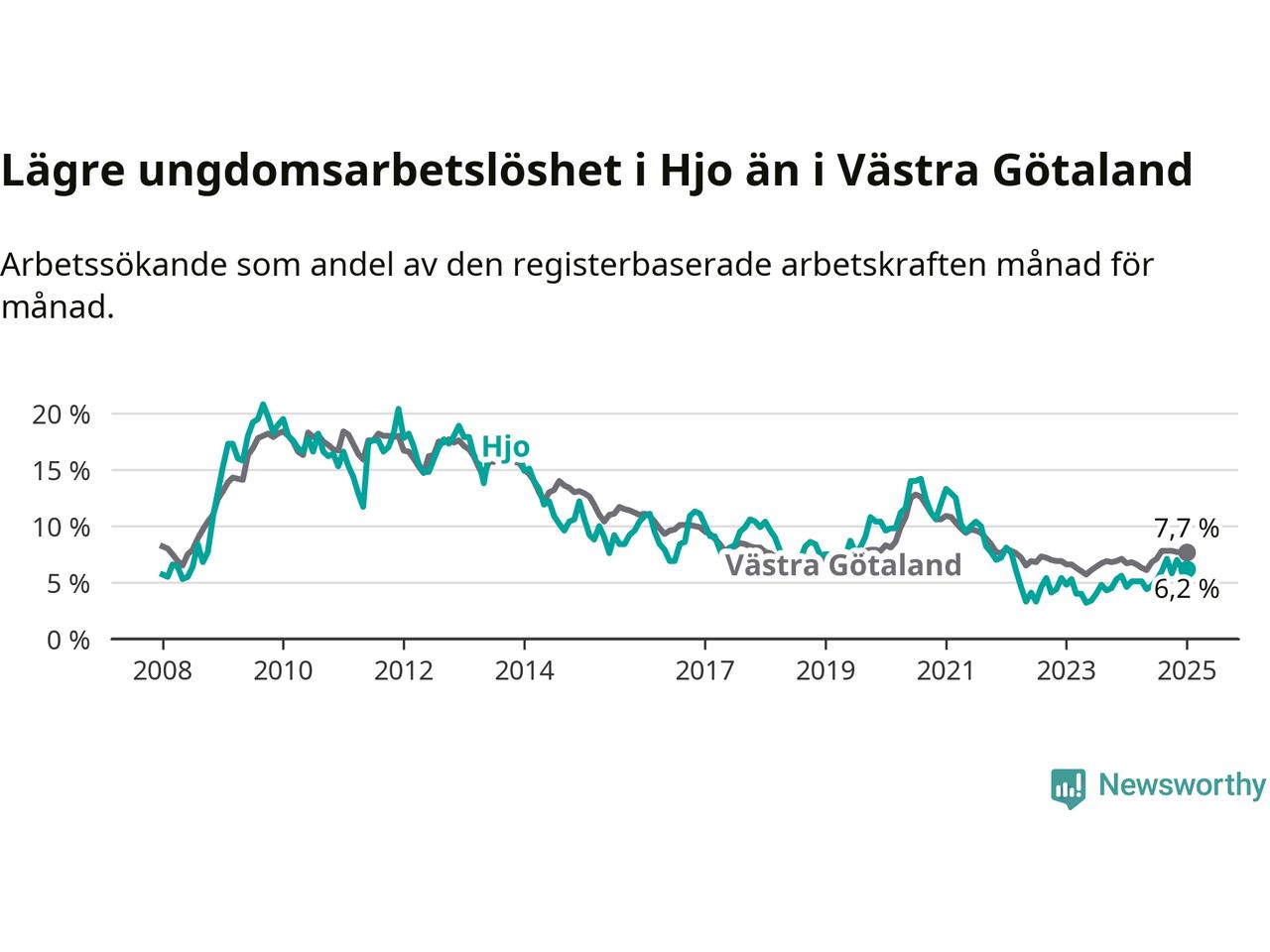 Precis som den totala arbetslösheten ligger ungdomsarbetslösheten i Hjo lägre än i Västra Götaland som helhet. Skillnaden mellan kommunen och länet är 1,5 procentenheter.