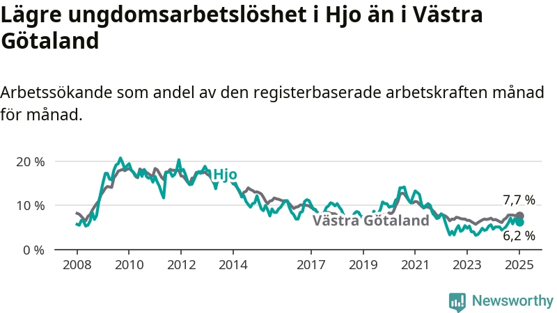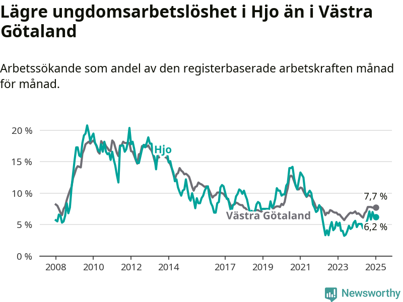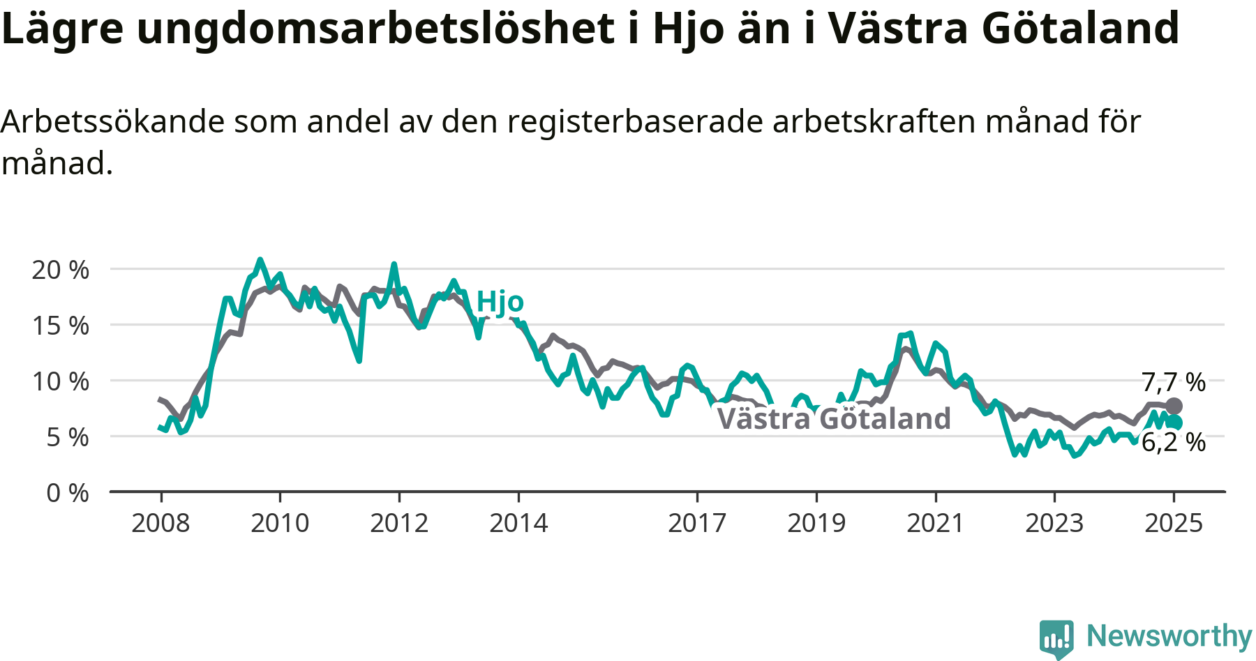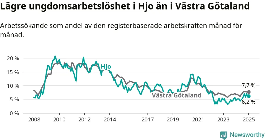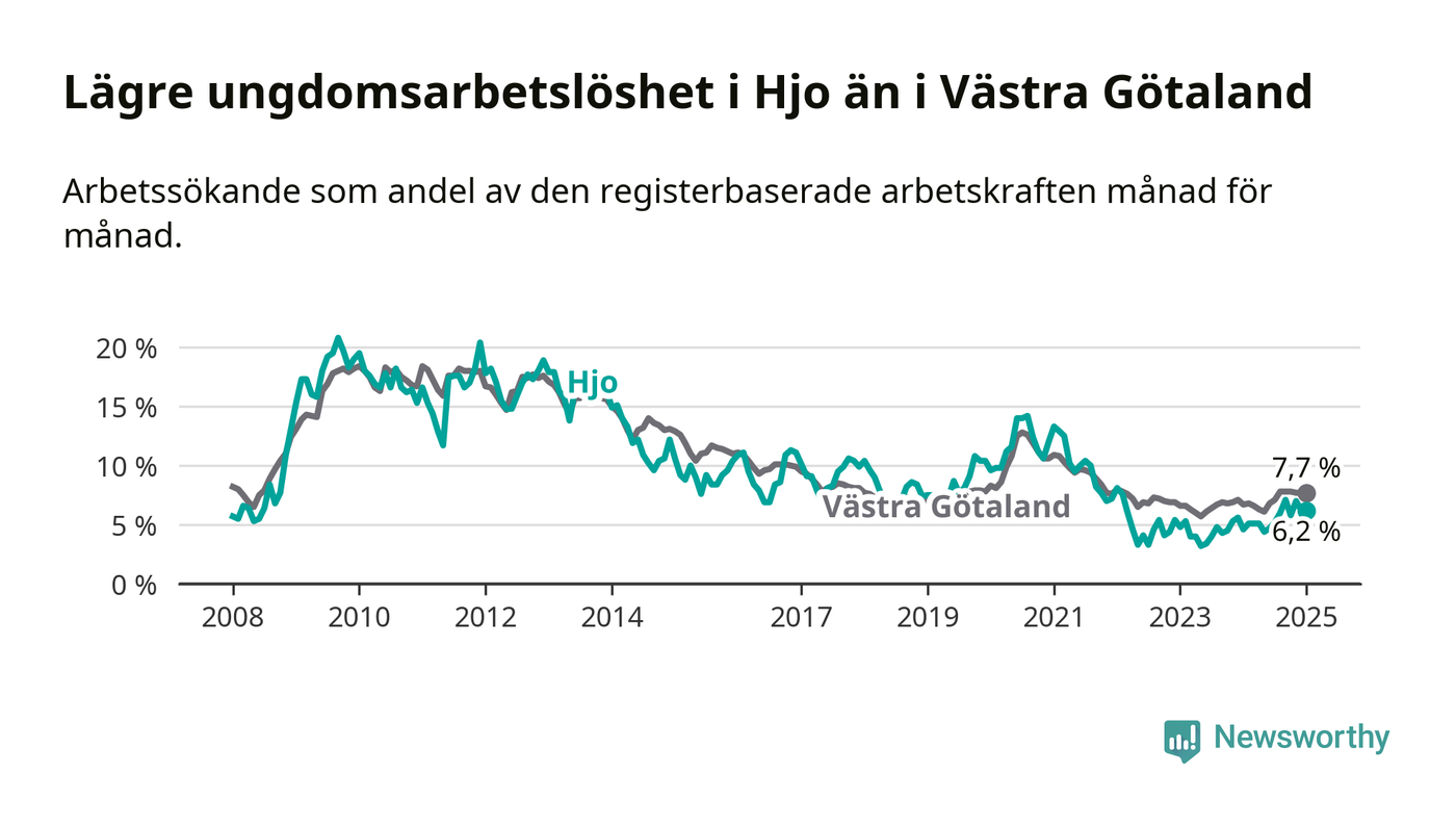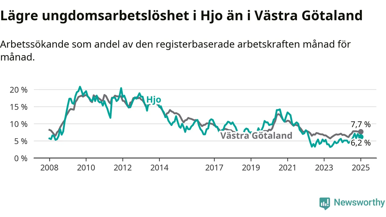 Precis som den totala arbetslösheten ligger ungdomsarbetslösheten i Hjo lägre än i Västra Götaland som helhet. Skillnaden mellan kommunen och länet är 1,5 procentenheter.