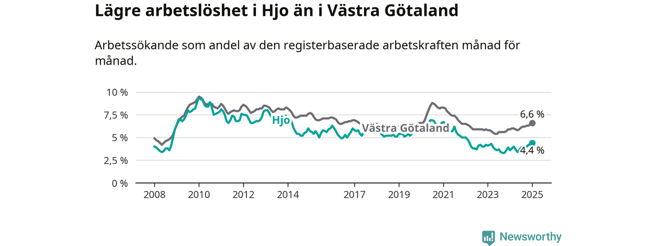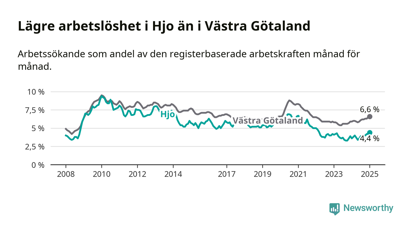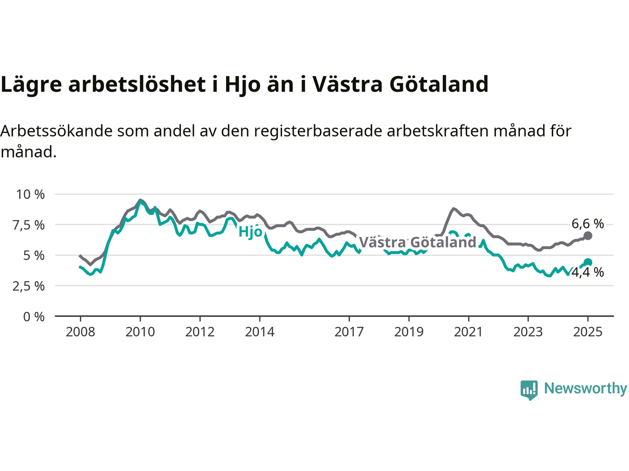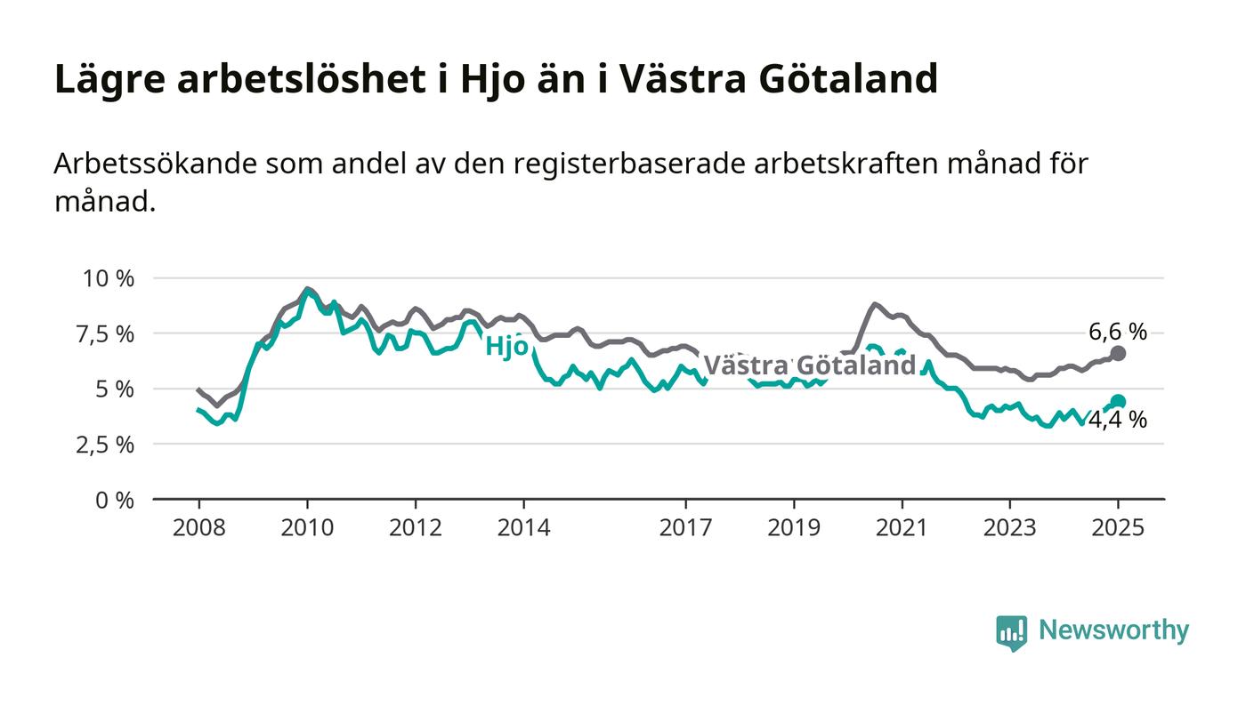 Även om arbetslösheten i Hjo alltså ökar, så ligger den fortfarande under snittet i hela Västra Götalands län (4,4 procent i kommunen, jämfört med 6,6 procent i hela länet). Öckerö har den lägsta arbetslösheten i länet (2,9 procent), medan Gullspång har den högsta (9,1 procent). För att Hjo skulle komma ner i samma arbetslöshetsnivå som Öckerö skulle 64 personer behöva sysselsättas.
