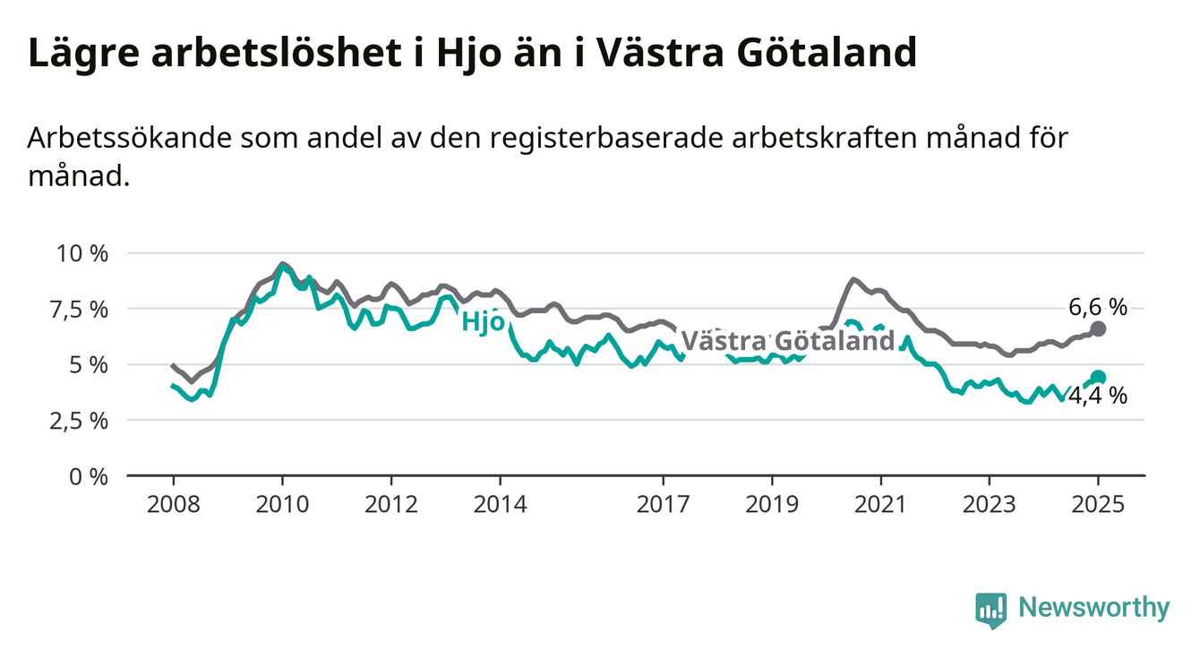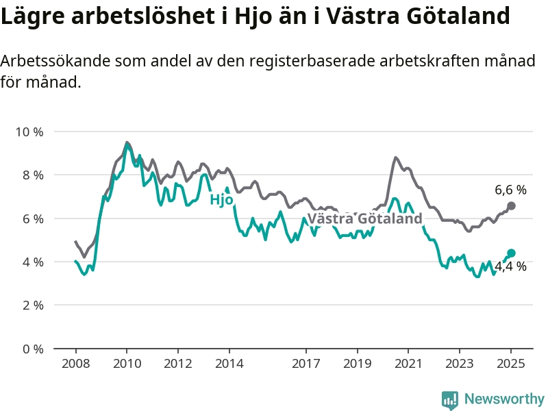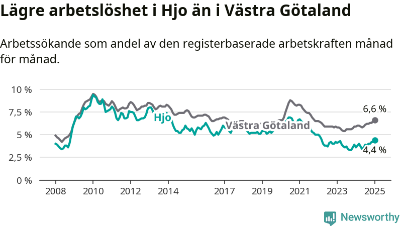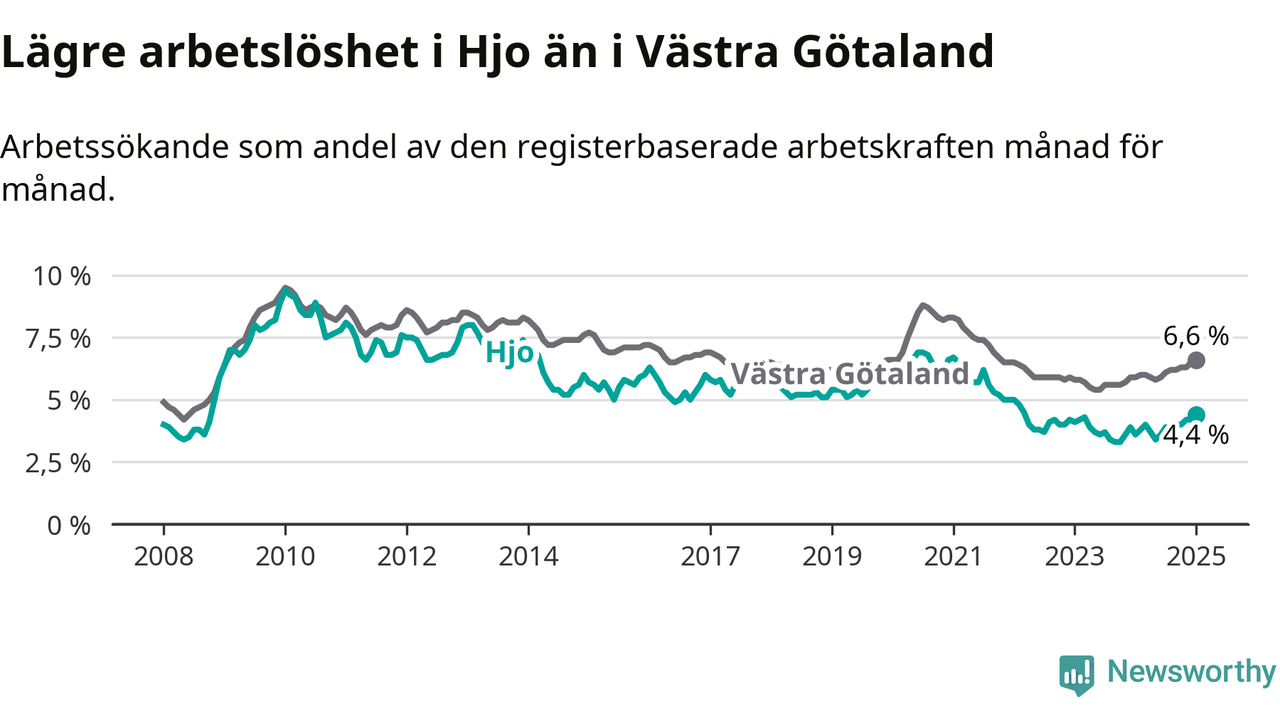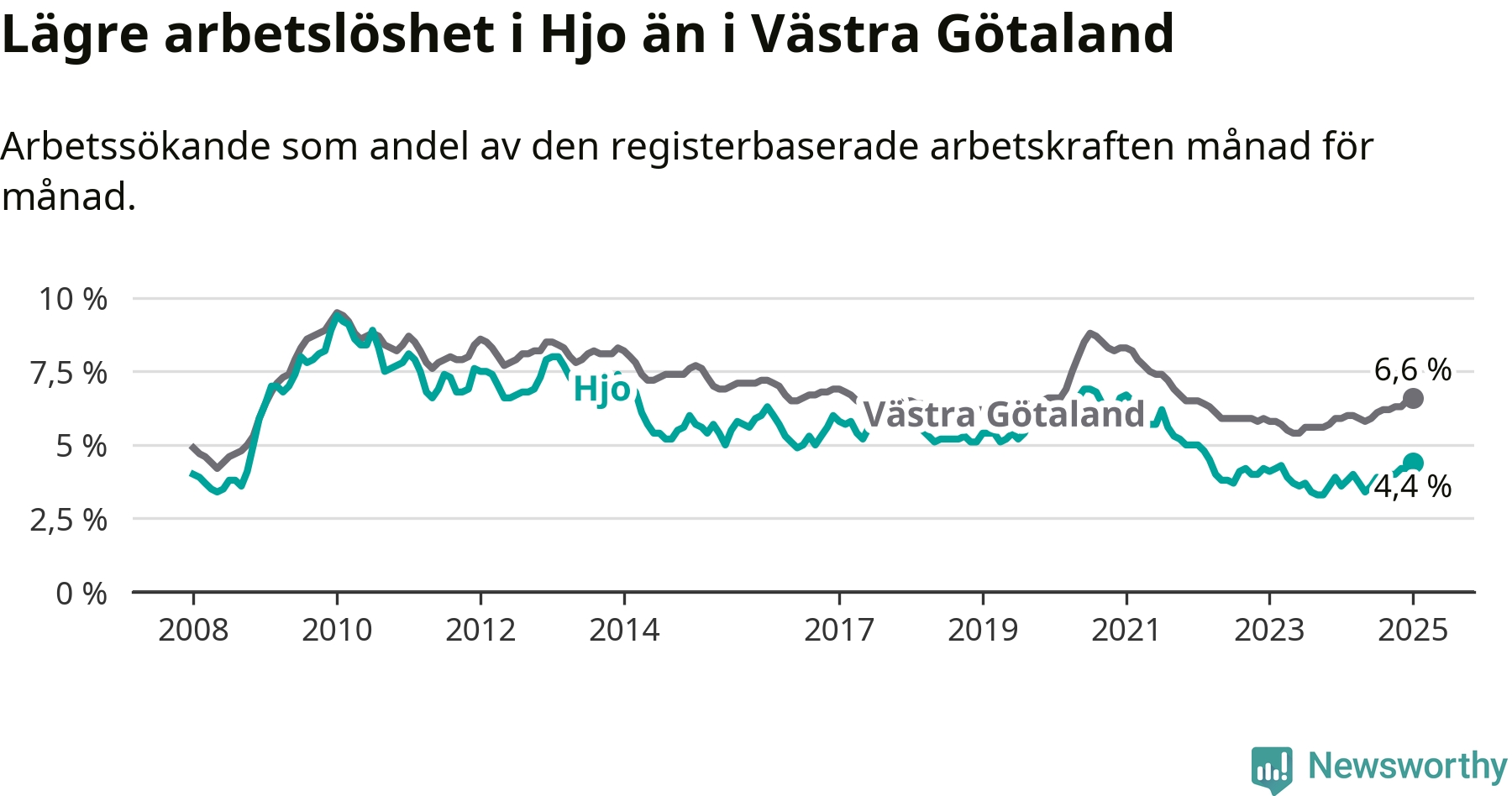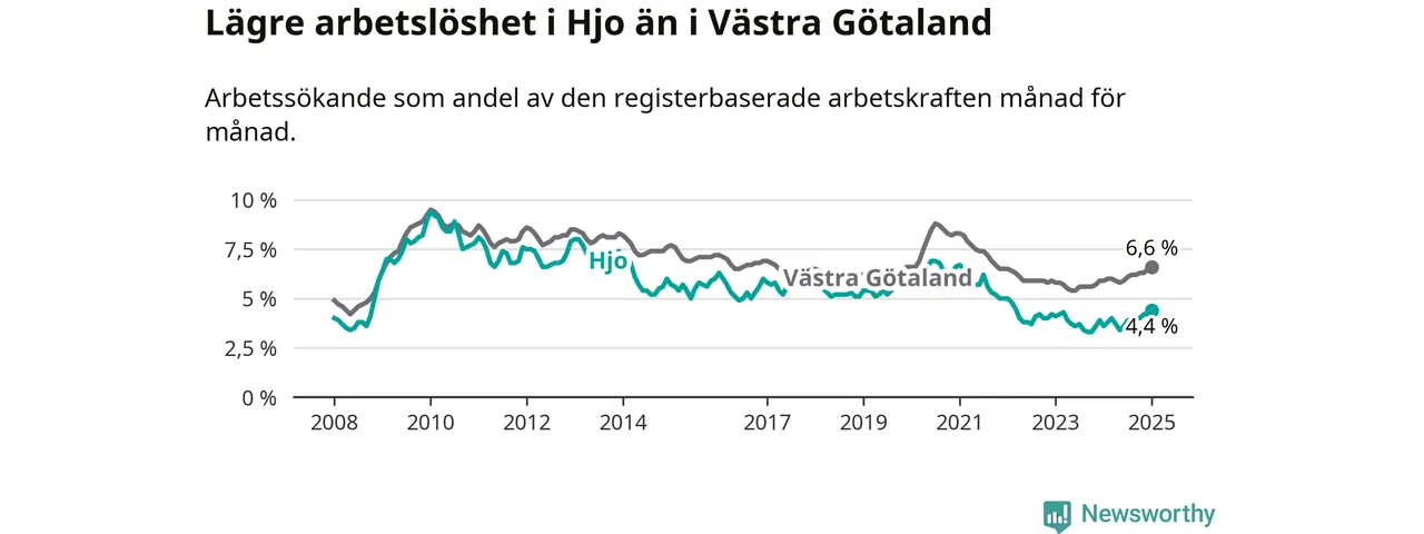 Även om arbetslösheten i Hjo alltså ökar, så ligger den fortfarande under snittet i hela Västra Götalands län (4,4 procent i kommunen, jämfört med 6,6 procent i hela länet). Öckerö har den lägsta arbetslösheten i länet (2,9 procent), medan Gullspång har den högsta (9,1 procent). För att Hjo skulle komma ner i samma arbetslöshetsnivå som Öckerö skulle 64 personer behöva sysselsättas.