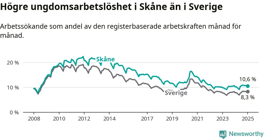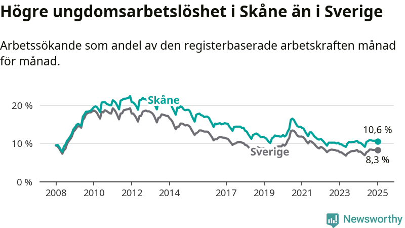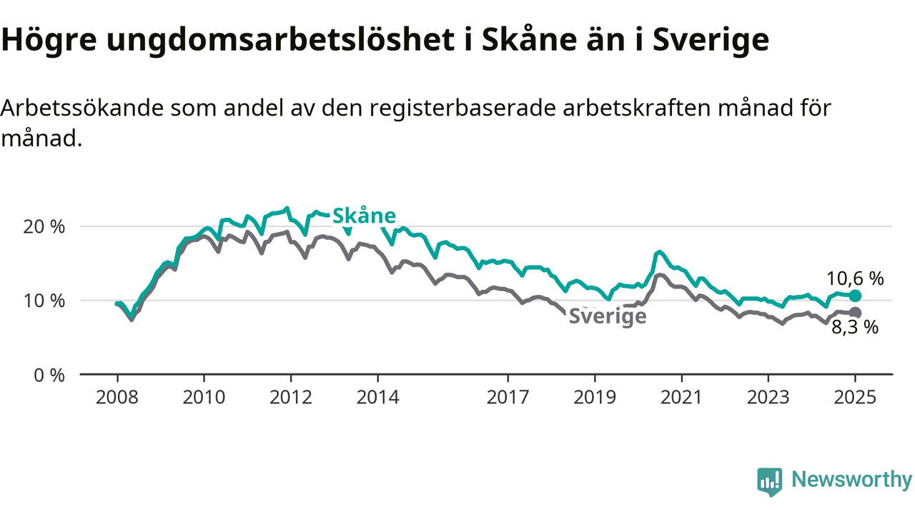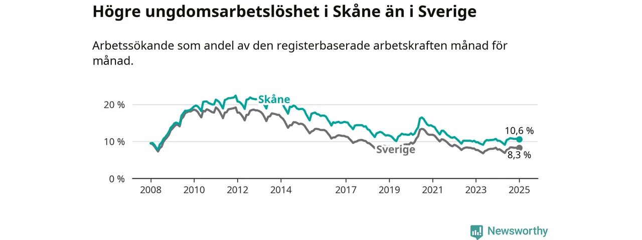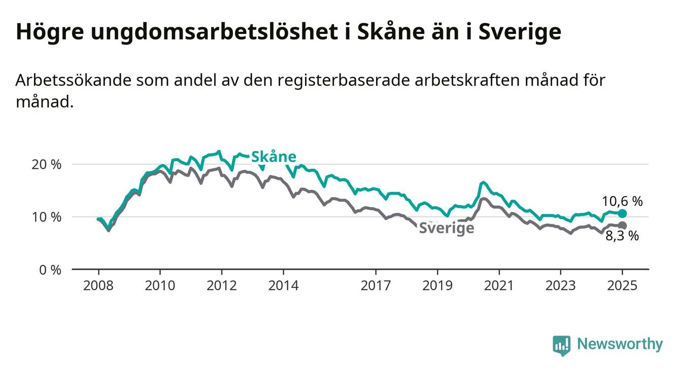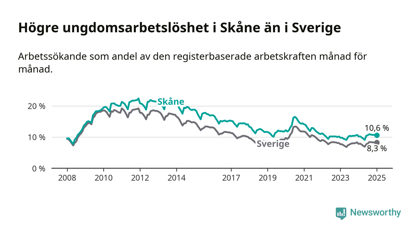 Precis som den totala arbetslösheten ligger ungdomsarbetslösheten i Skåne högre än i Sverige som helhet. Skillnaden mellan länet och riket är 2,3 procentenheter.