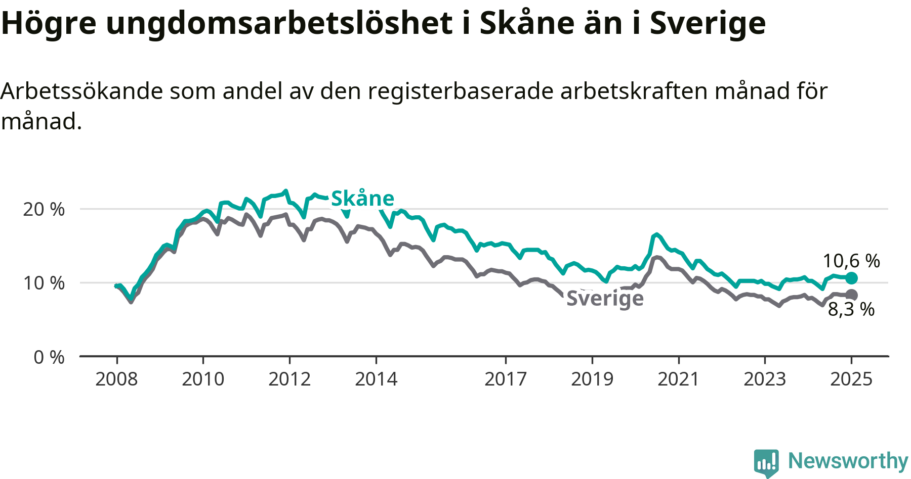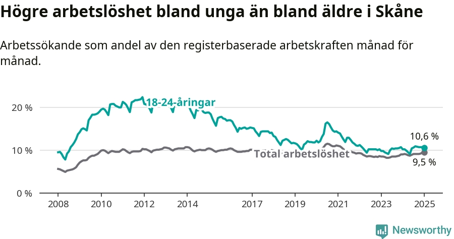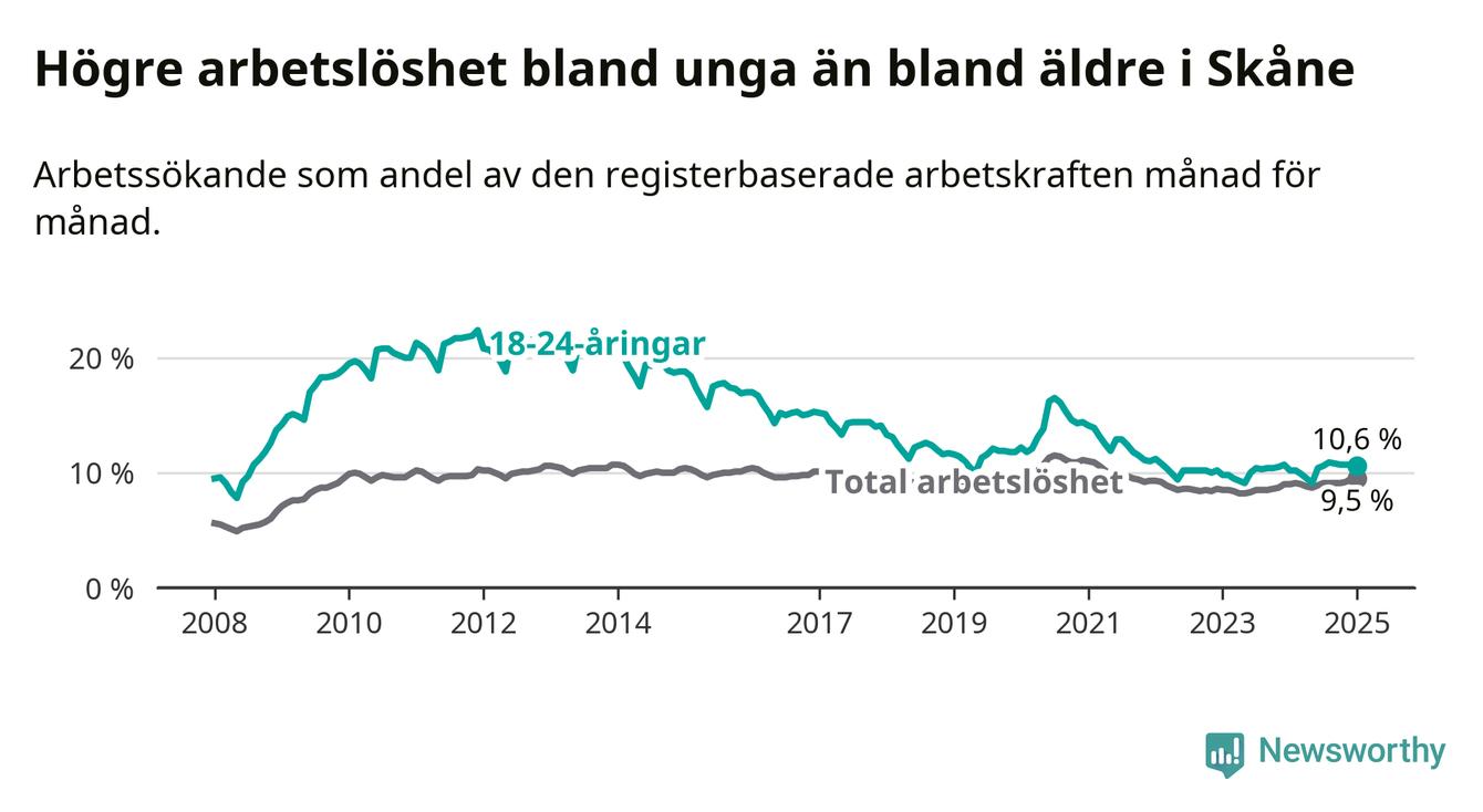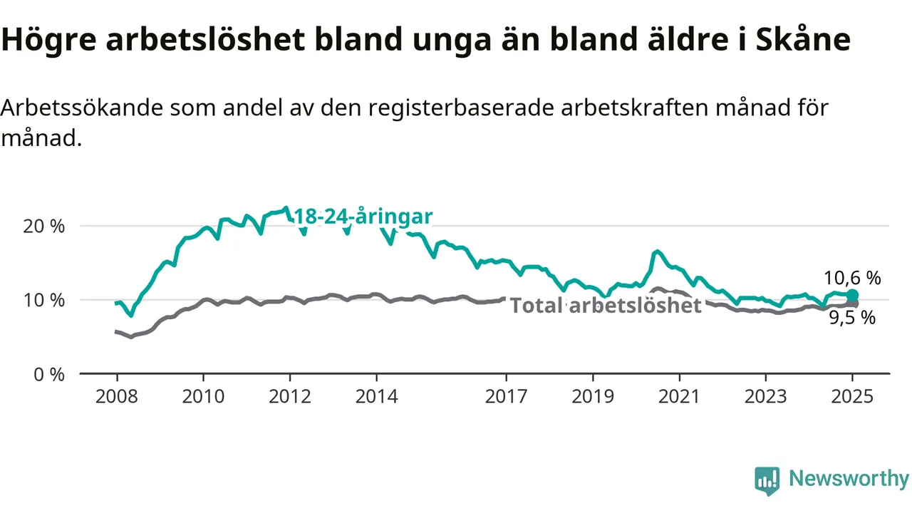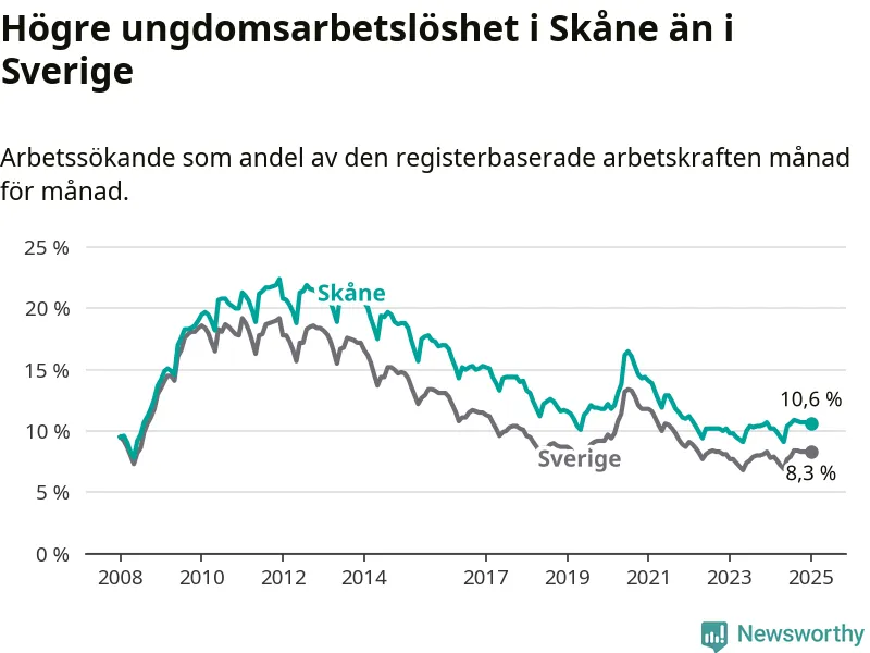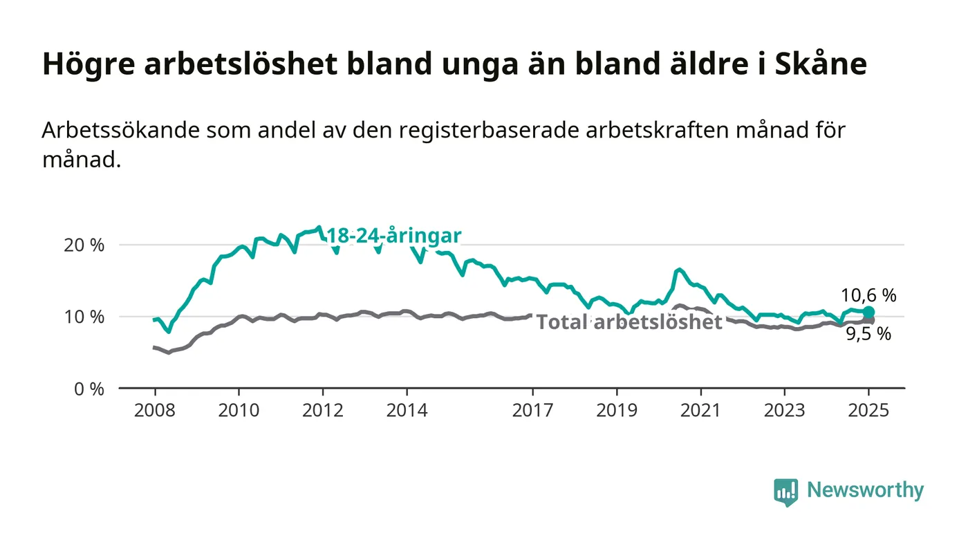 Precis som den totala arbetslösheten ligger ungdomsarbetslösheten i Skåne högre än i Sverige som helhet. Skillnaden mellan länet och riket är 2,3 procentenheter.