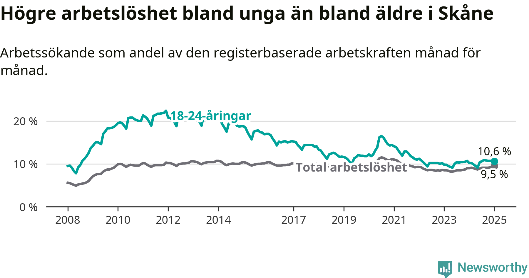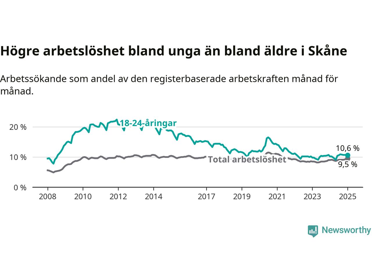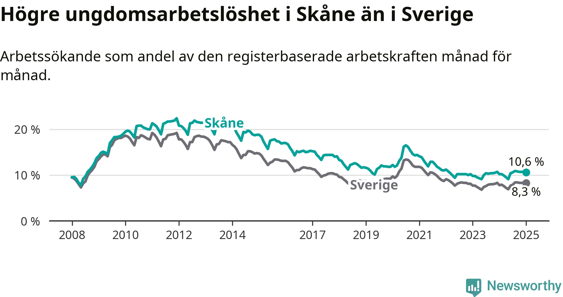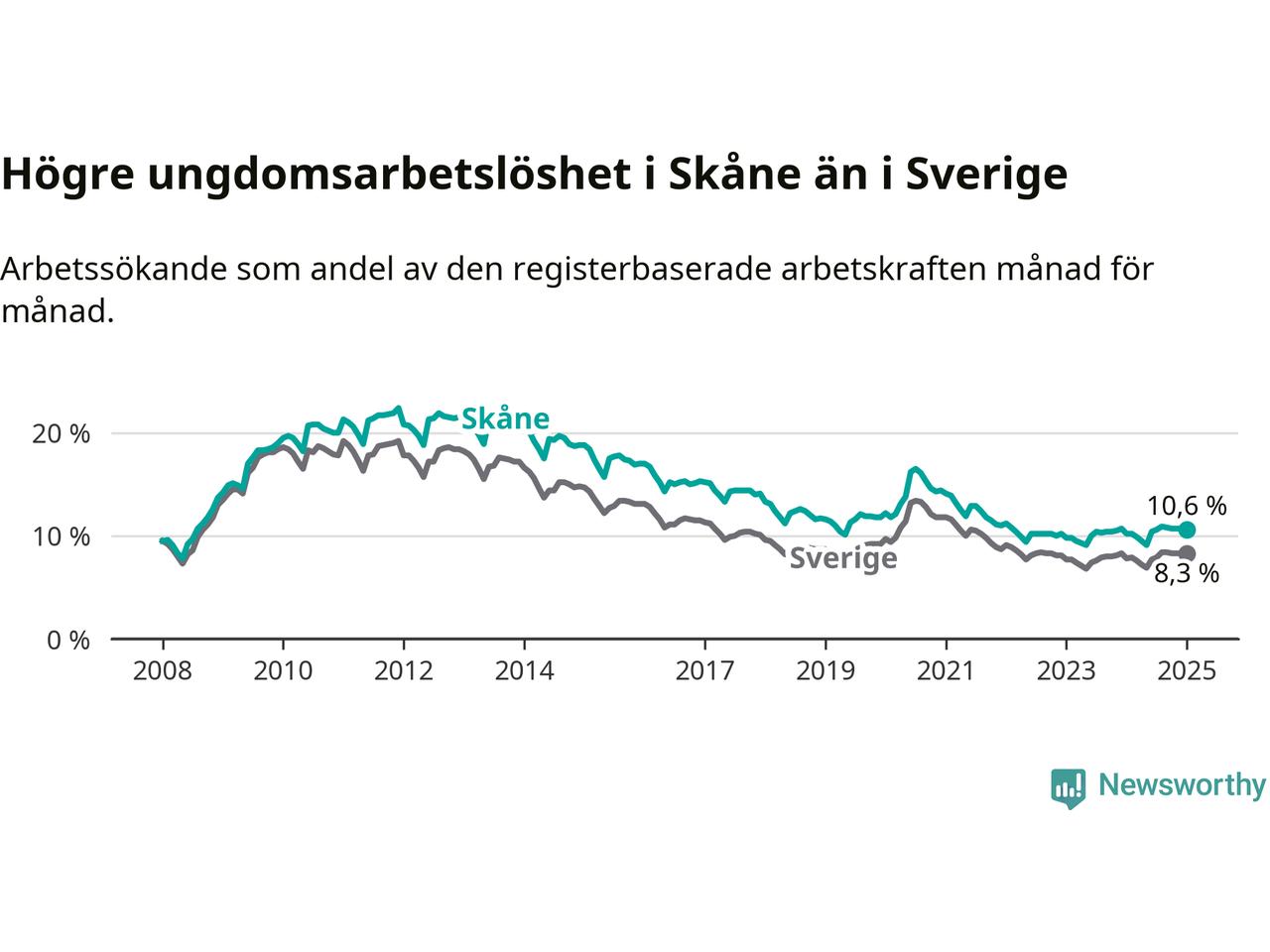 Precis som den totala arbetslösheten ligger ungdomsarbetslösheten i Skåne högre än i Sverige som helhet. Skillnaden mellan länet och riket är 2,3 procentenheter.
