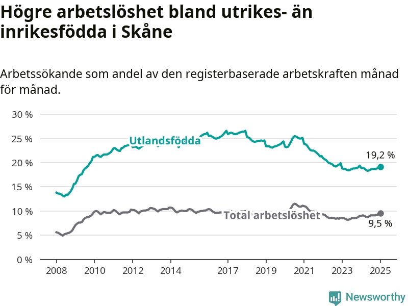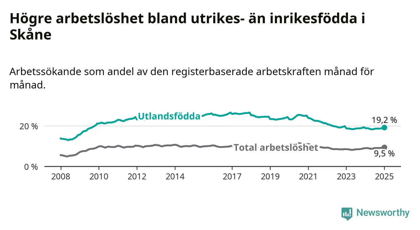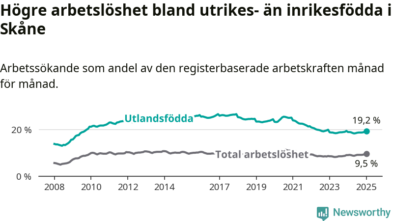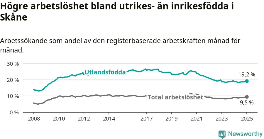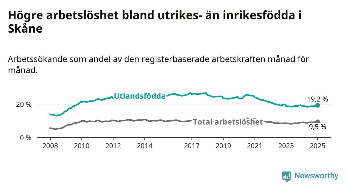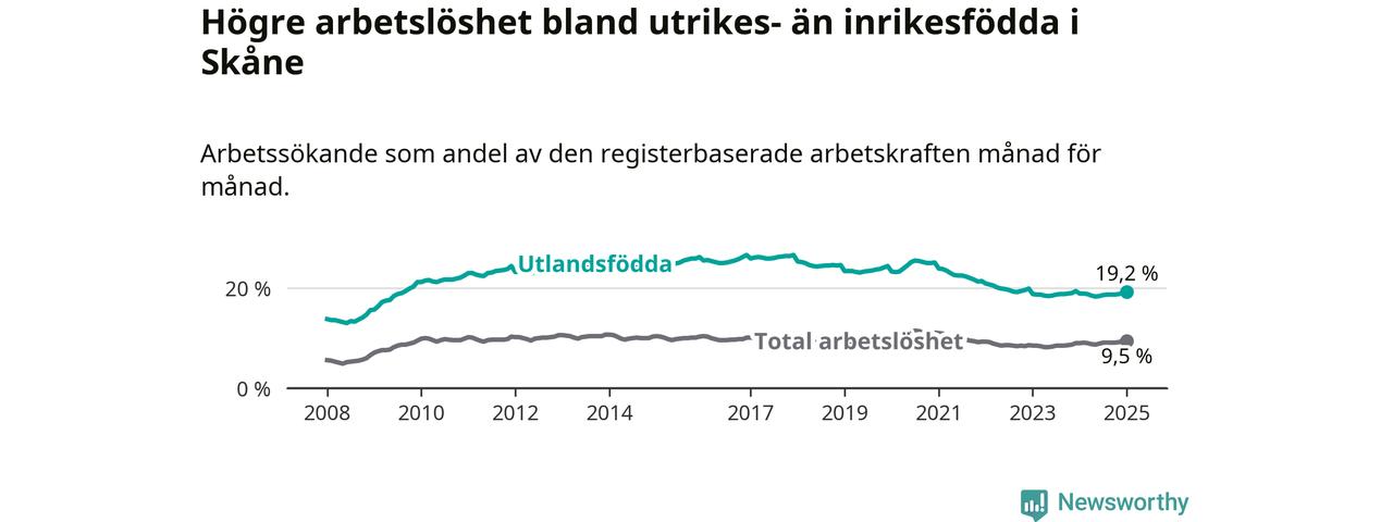 Arbetslösheten bland utlandsfödda var 19,2 procent i Skåne under januari månad, motsvarande 37 758 av 196 656 personer. Det är 0,3 procentenheter fler än vid samma tidpunkt i fjol (+37 739 om man räknar personer). Den senaste månadens uppgång innebär ett trendbrott. Under de åtta föregående månaderna hade arbetslösheten bland utlandsfödda varit lägre än motsvarande tidpunkt året innan.