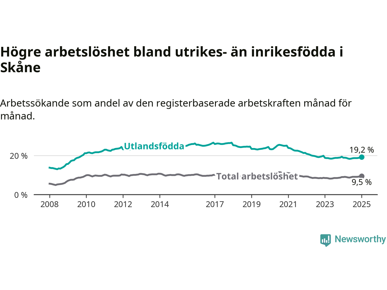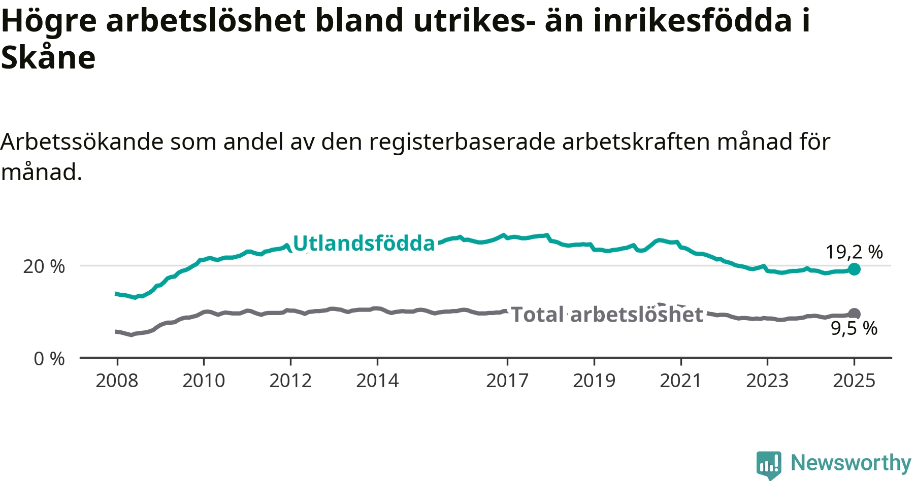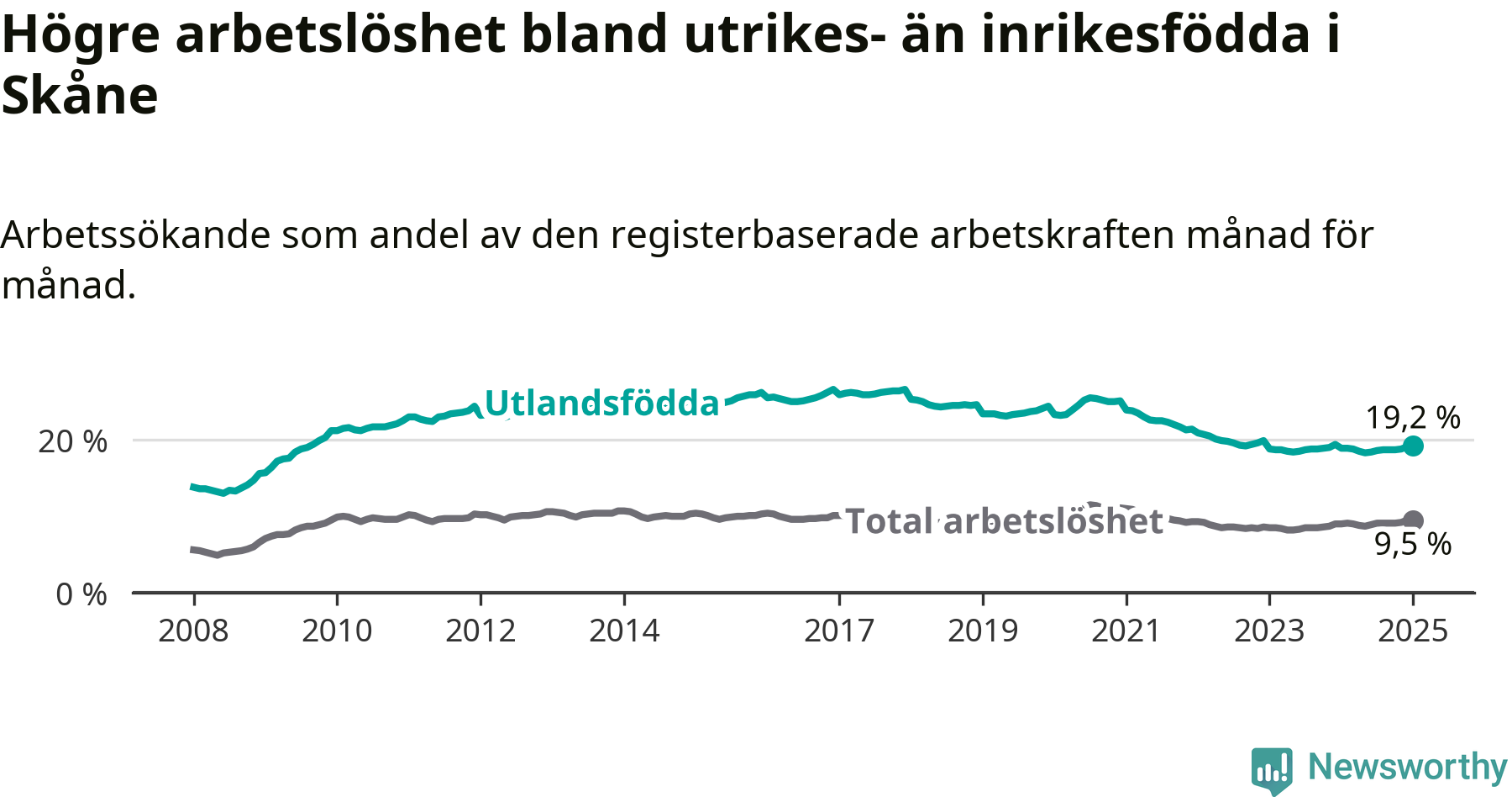 Arbetslösheten bland utlandsfödda var 19,2 procent i Skåne under januari månad, motsvarande 37 758 av 196 656 personer. Det är 0,3 procentenheter fler än vid samma tidpunkt i fjol (+37 739 om man räknar personer). Den senaste månadens uppgång innebär ett trendbrott. Under de åtta föregående månaderna hade arbetslösheten bland utlandsfödda varit lägre än motsvarande tidpunkt året innan.