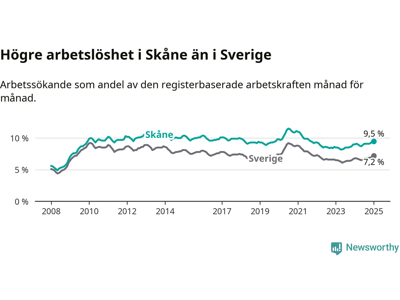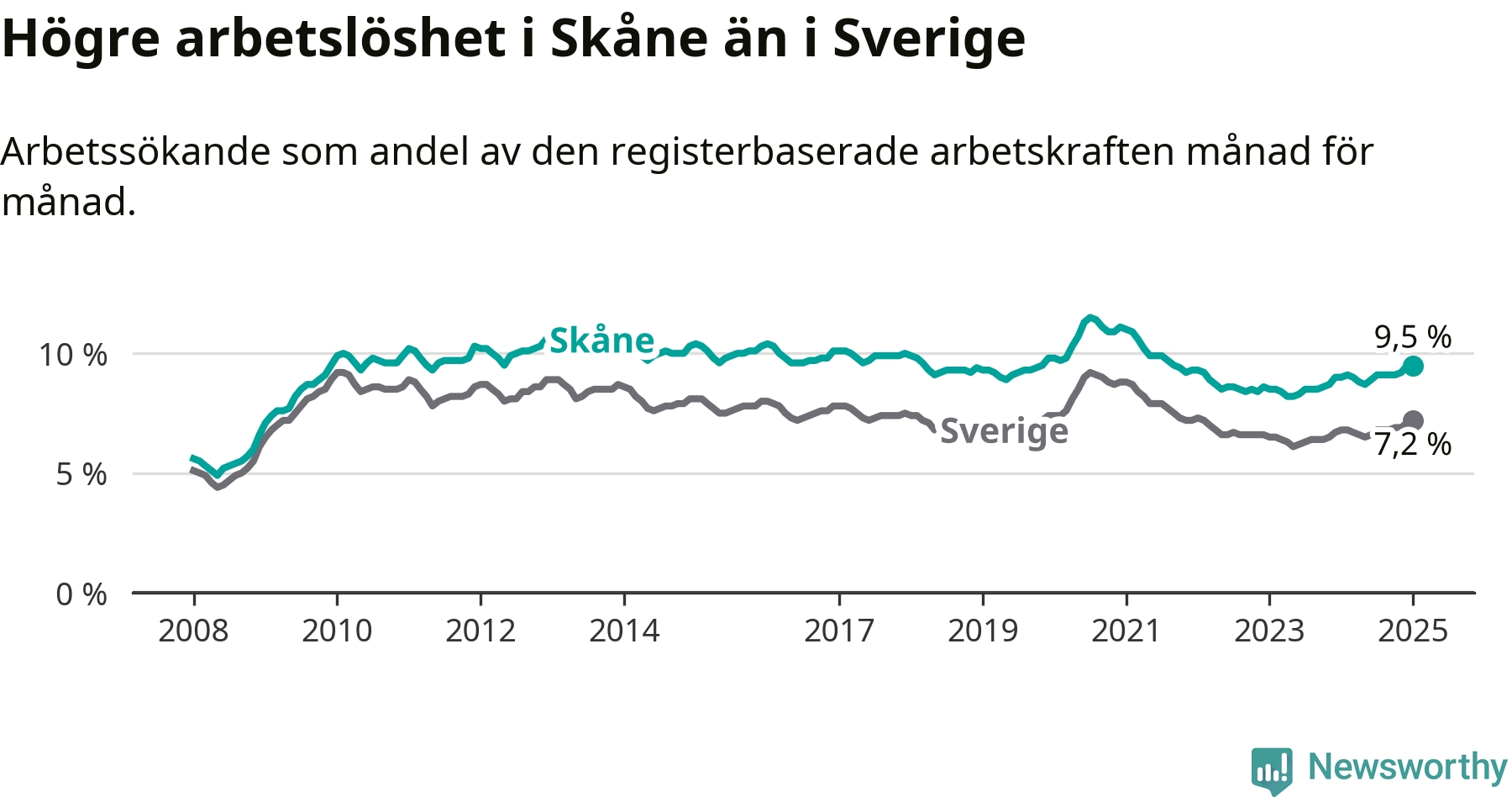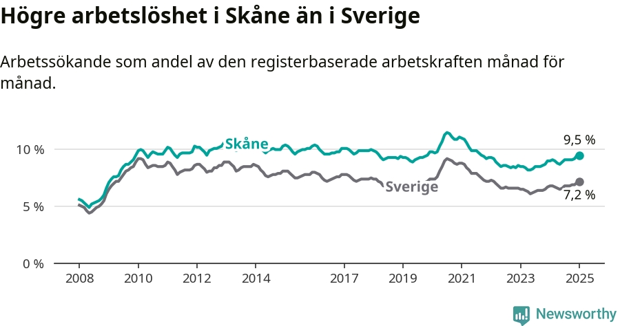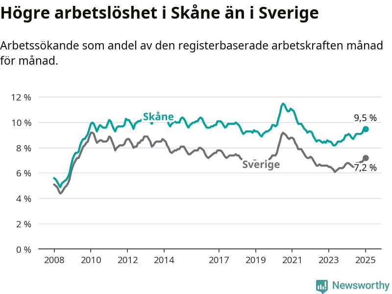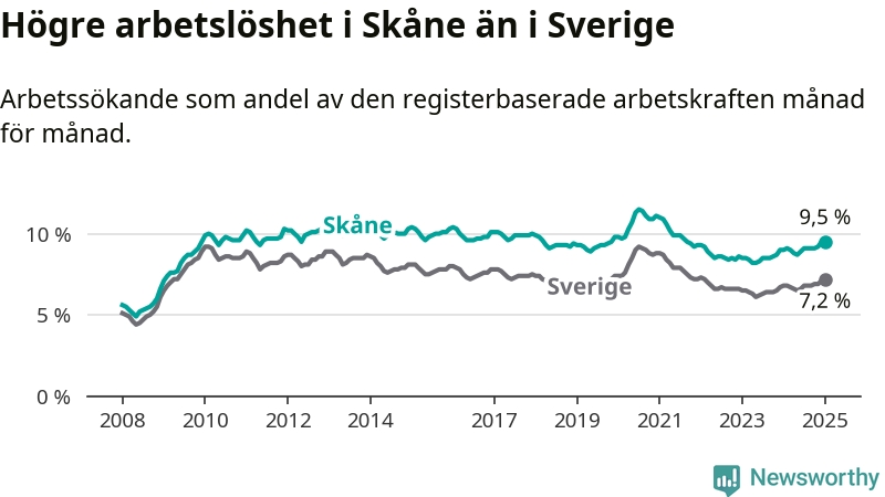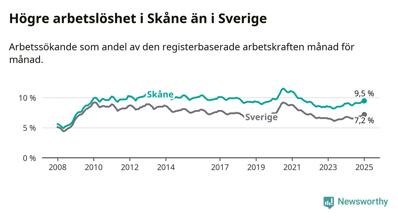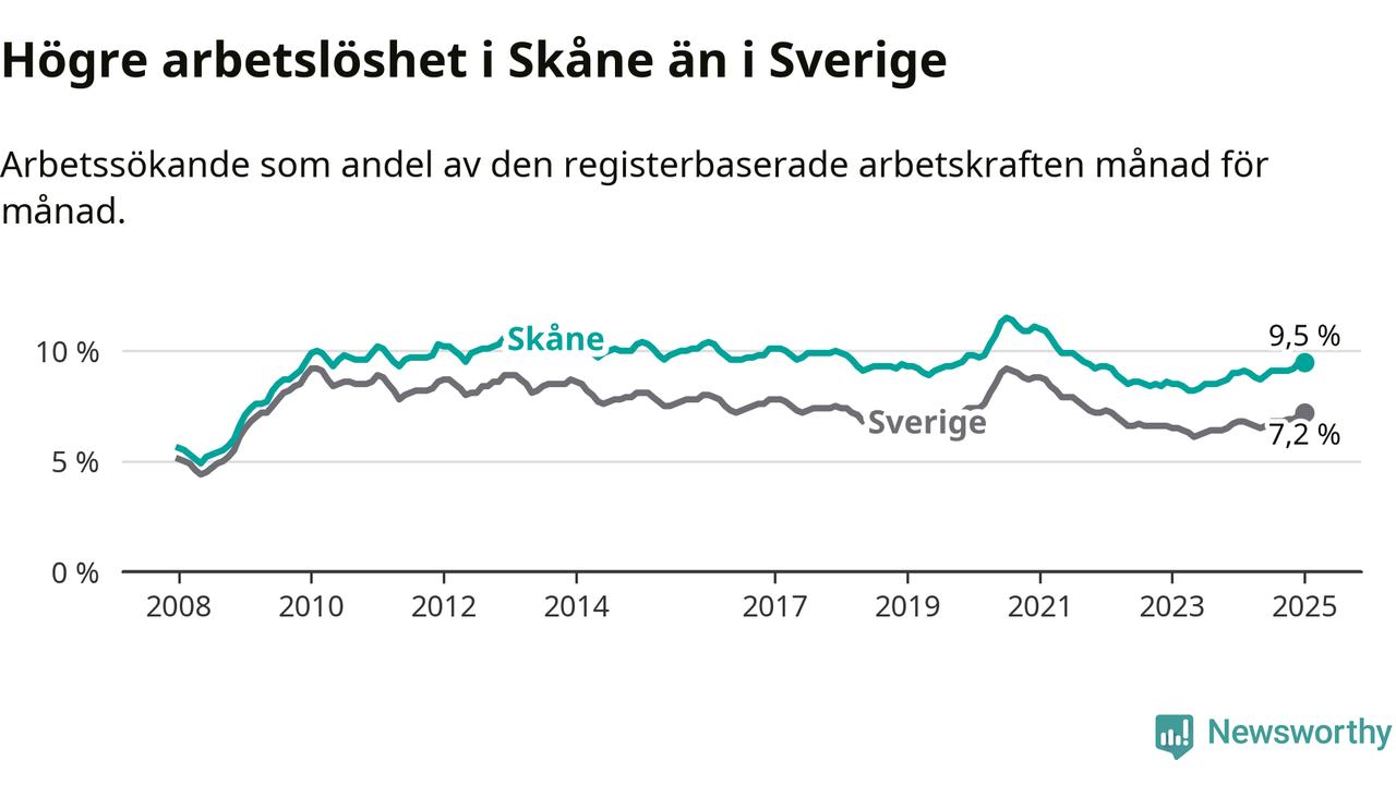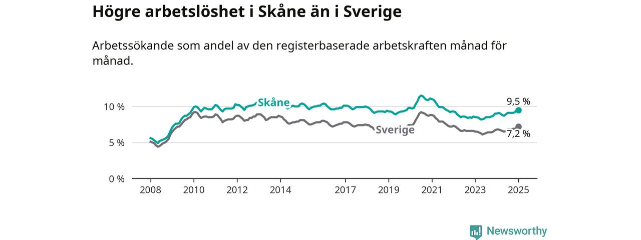 Skåne hade redan tidigare högre arbetslöshet än snittet i hela Sverige och nu växer klyftan (9,5 procent i länet, jämfört med 7,2 procent i hela riket). Skåne har därmed även den högsta arbetslöshetsnivån i riket. Norrbotten har den lägsta (4,2 procent). För att Skåne skulle komma ner i samma arbetslöshetsnivå som Norrbotten skulle 36 995 personer behöva sysselsättas.